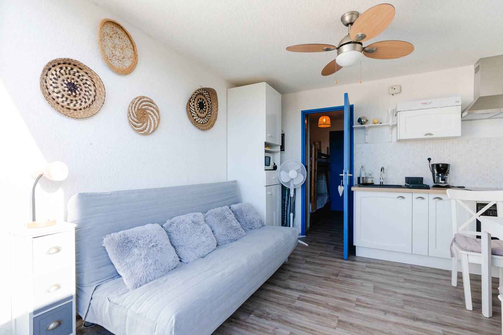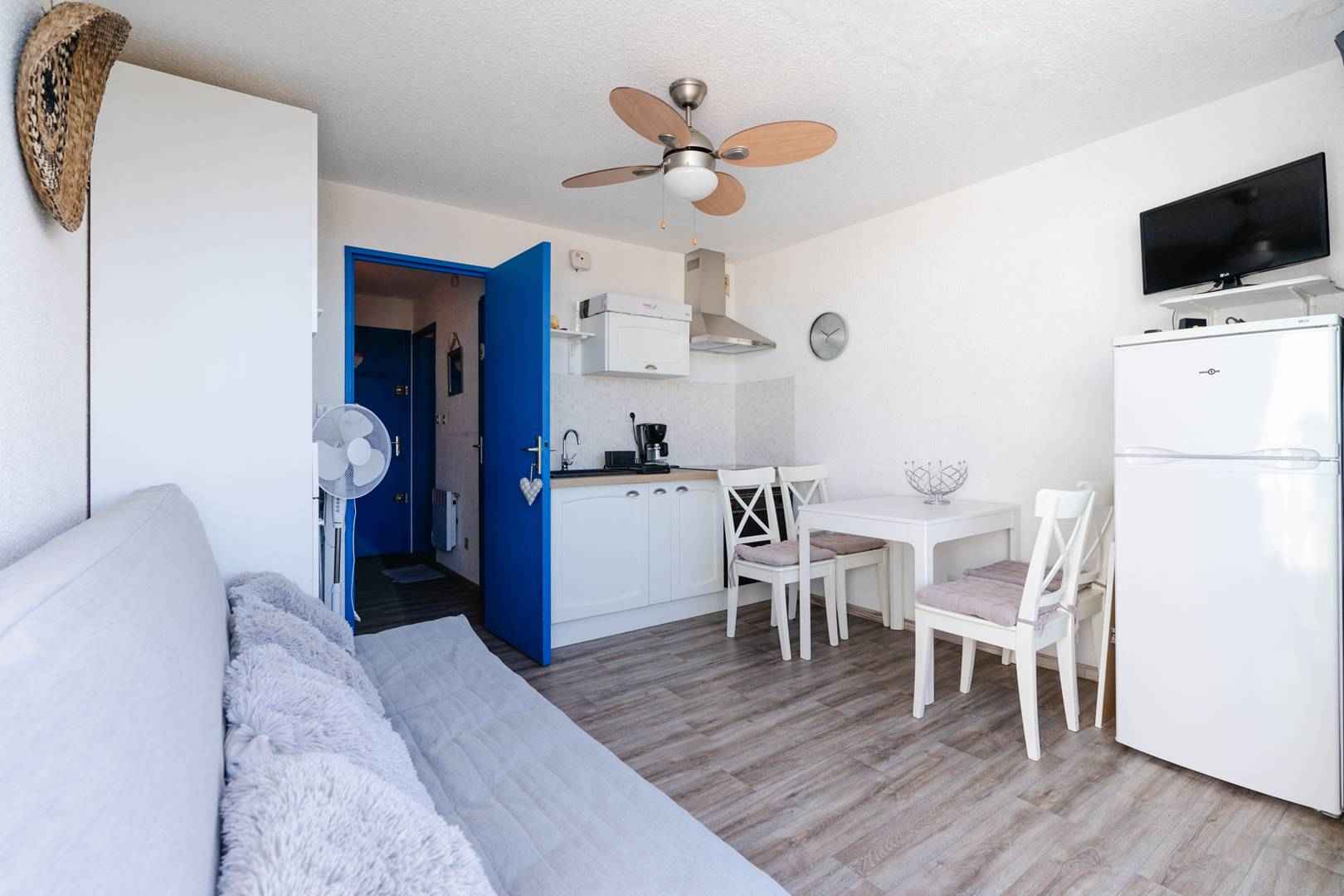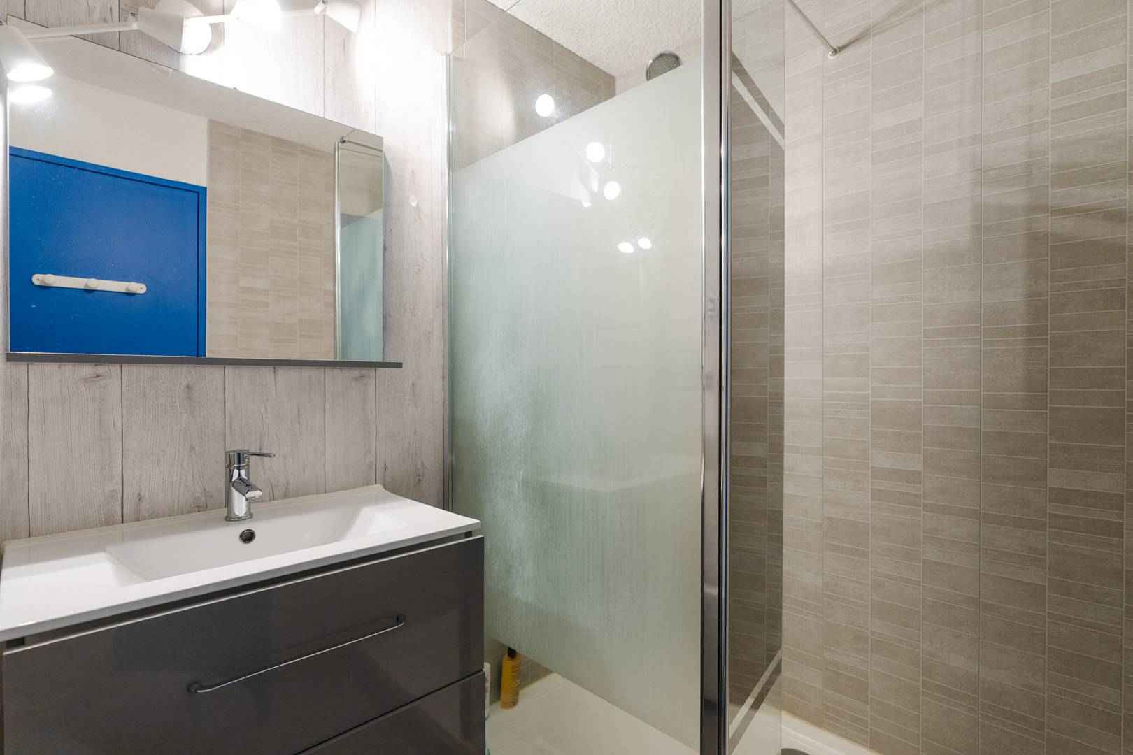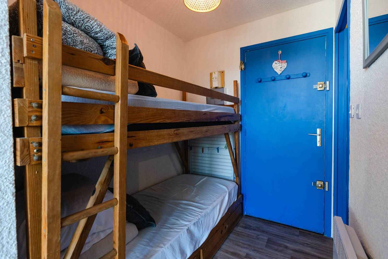 cet appartement climatisé se compose d'une entrée avec 2 lits superposés (90x190), d'une salle d'eau (douche à l'italienne, meuble de rangement sous vasque), wc