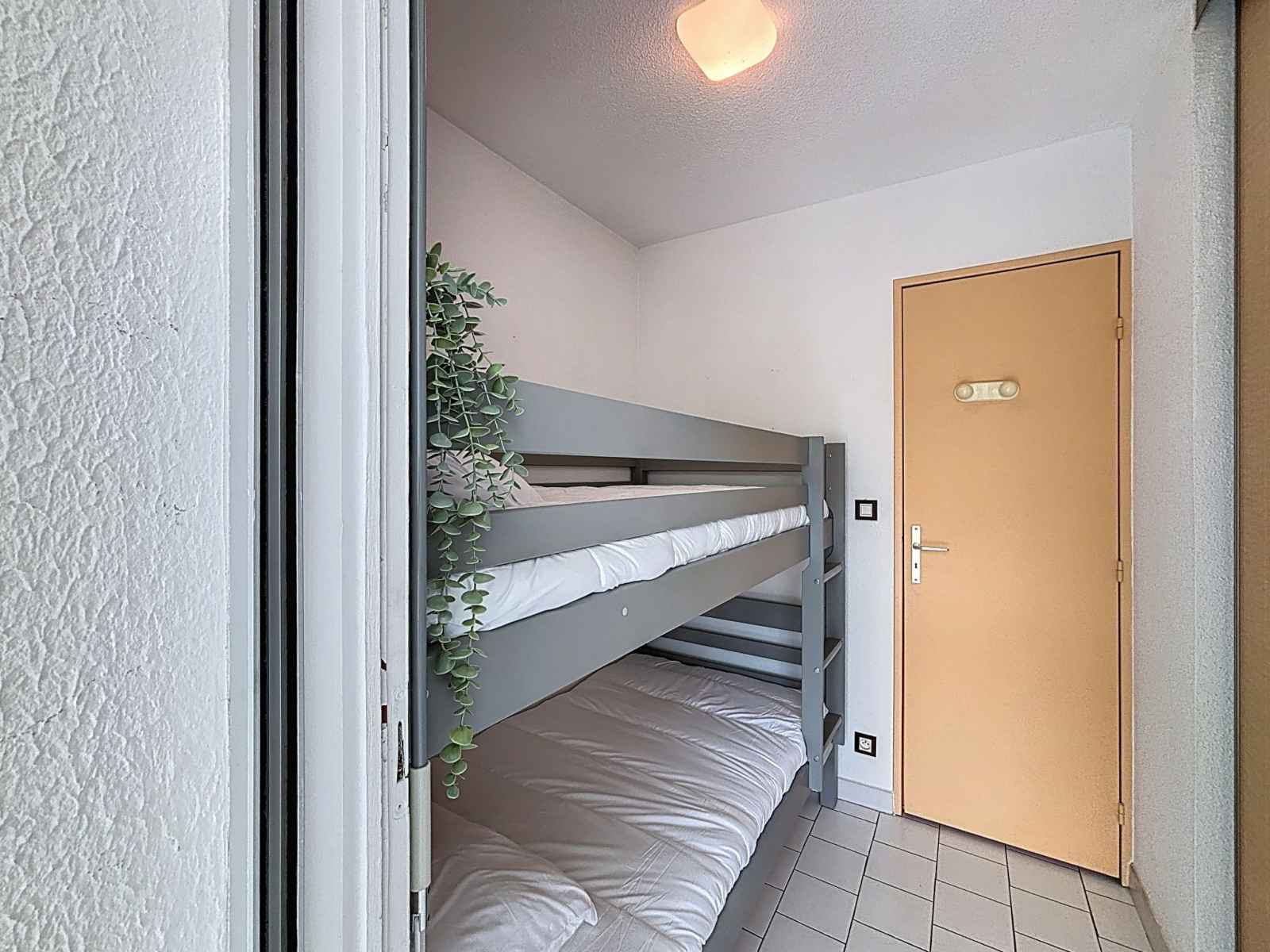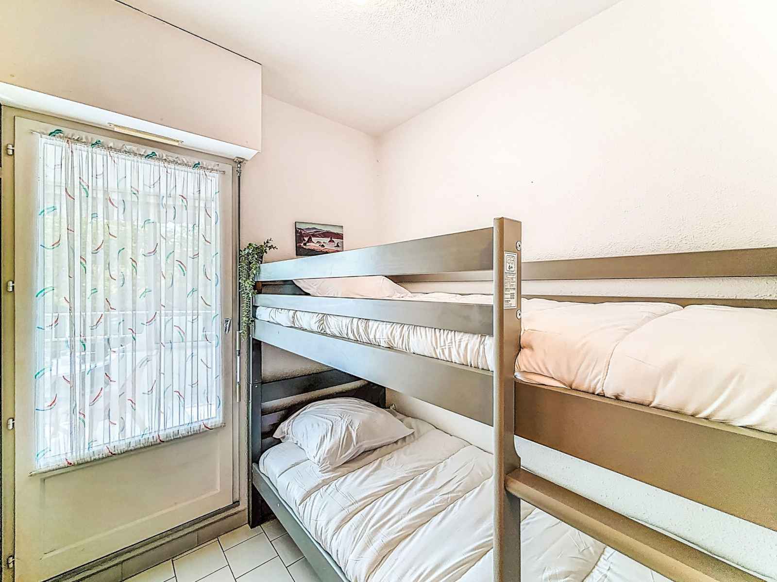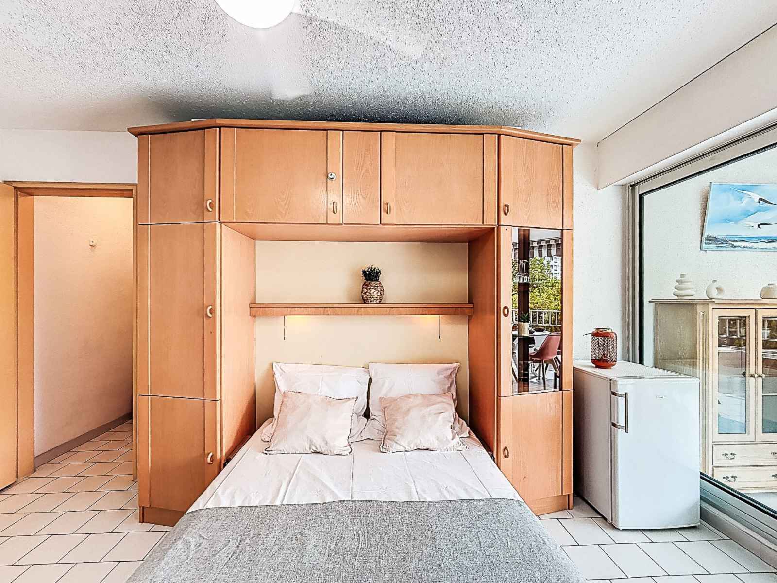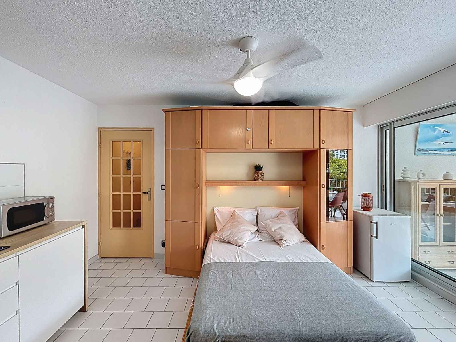 Studio 40 m2. logement idéal pour 3 adultes + 2 enfants. aménagement confortable: séjour/salle à manger avec 1 lit double armoire (140 cm, longueur 190 cm), tv (écran plat), radiateur électrique. sortie sur la loggia, orientée sud. cabine avec 1 divan-lit double (160 cm, longueur 200 cm), air-conditionné. cabine avec 1 x 2 lits superposés
