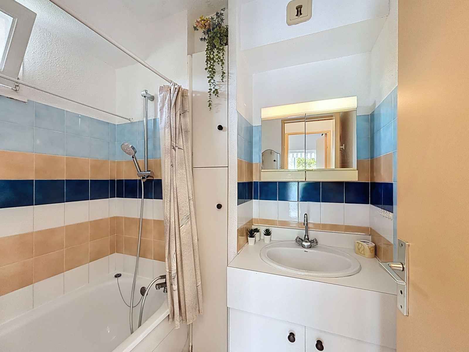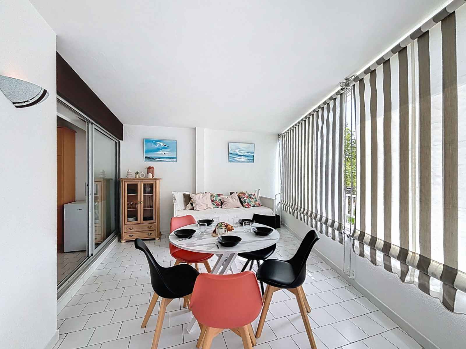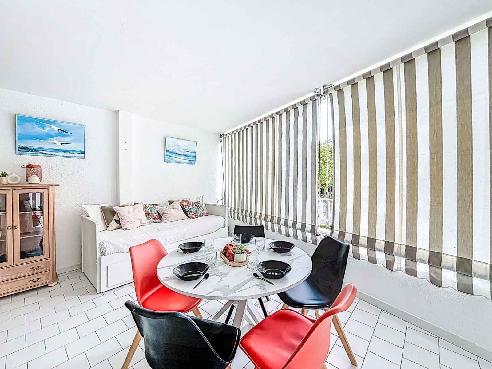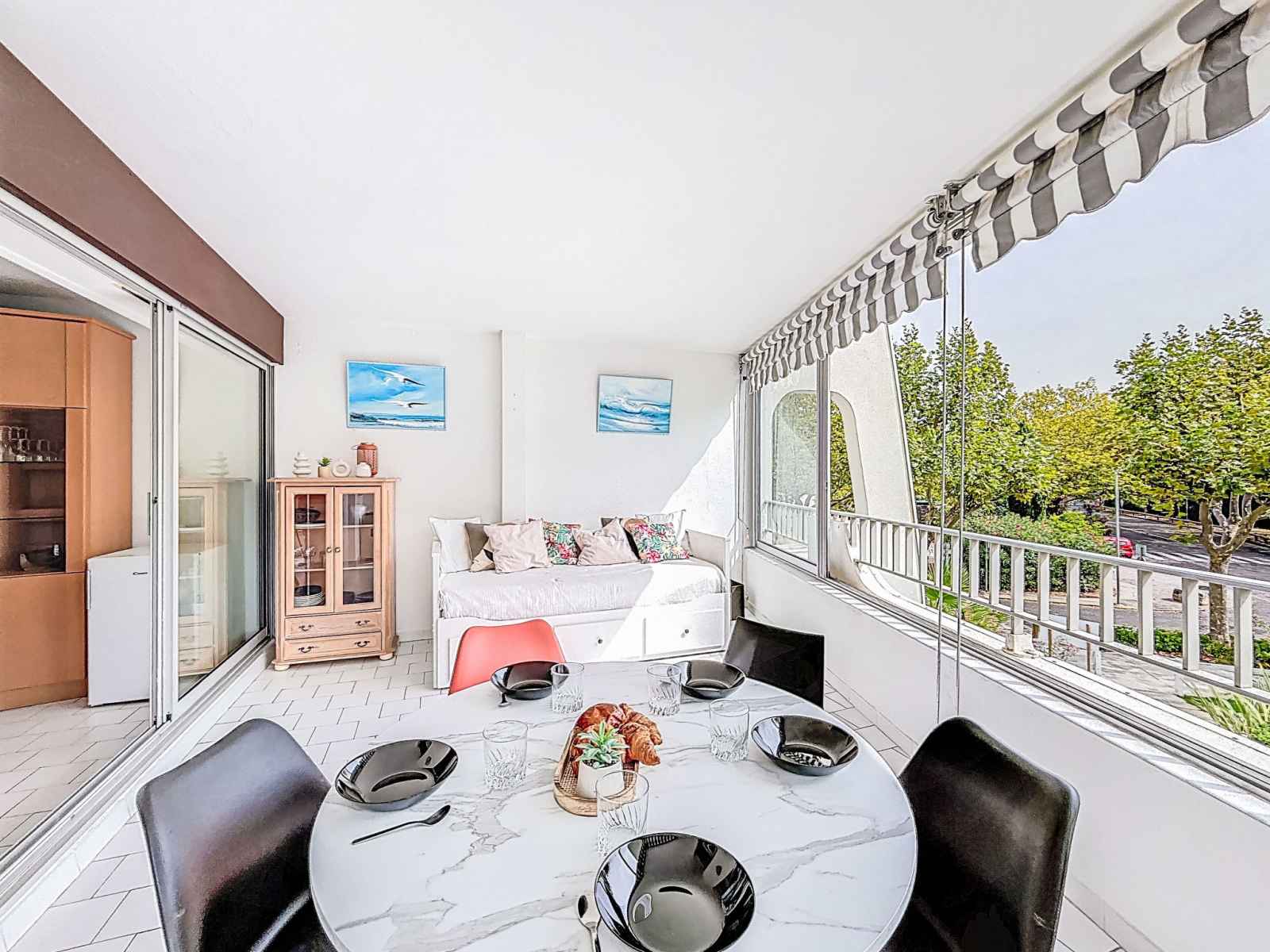 Studio 40 m2. logement idéal pour 3 adultes + 2 enfants. aménagement confortable: séjour/salle à manger avec 1 lit double armoire (140 cm, longueur 190 cm), tv (écran plat), radiateur électrique. sortie sur la loggia, orientée sud. cabine avec 1 divan-lit double (160 cm, longueur 200 cm), air-conditionné. cabine avec 1 x 2 lits superposés
