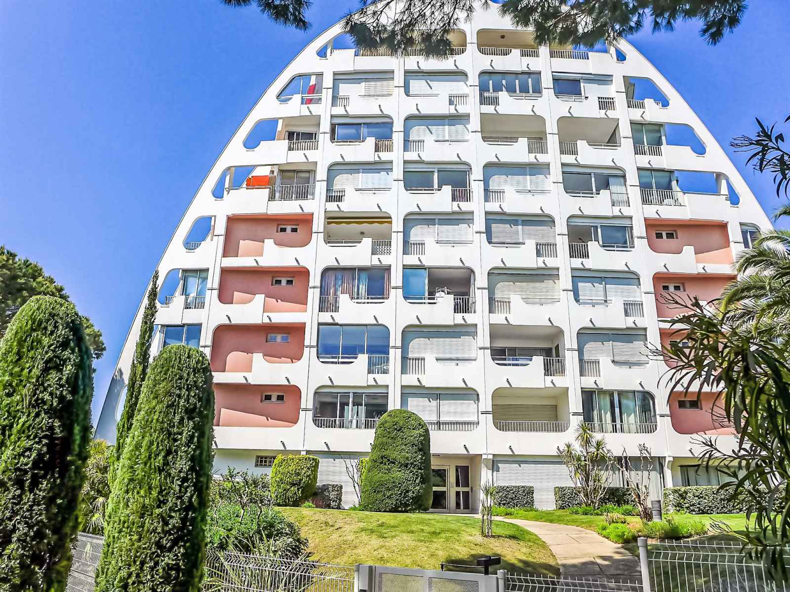 Résidence "du parc ii", de 8 étages. dans le quartier de la motte du couchant, à 1.5 km du centre, à 250 m de la mer, à 220 m de la plage. en commun: piscine cloturée (12 x 23 m, profondeur 110 - 225 cm, disponibilité saisonnière: 27.mai. - 15.sep.) avec marches intérieures. piscine de forme irrégulière. infrastructures de la