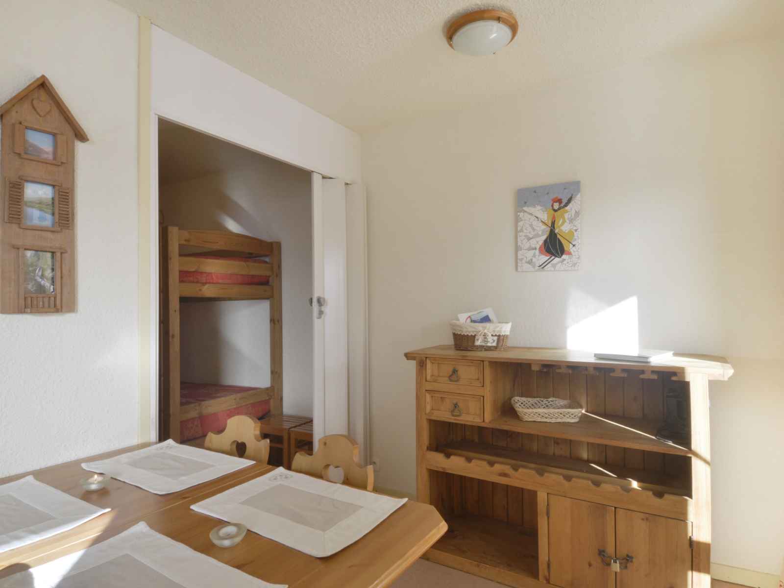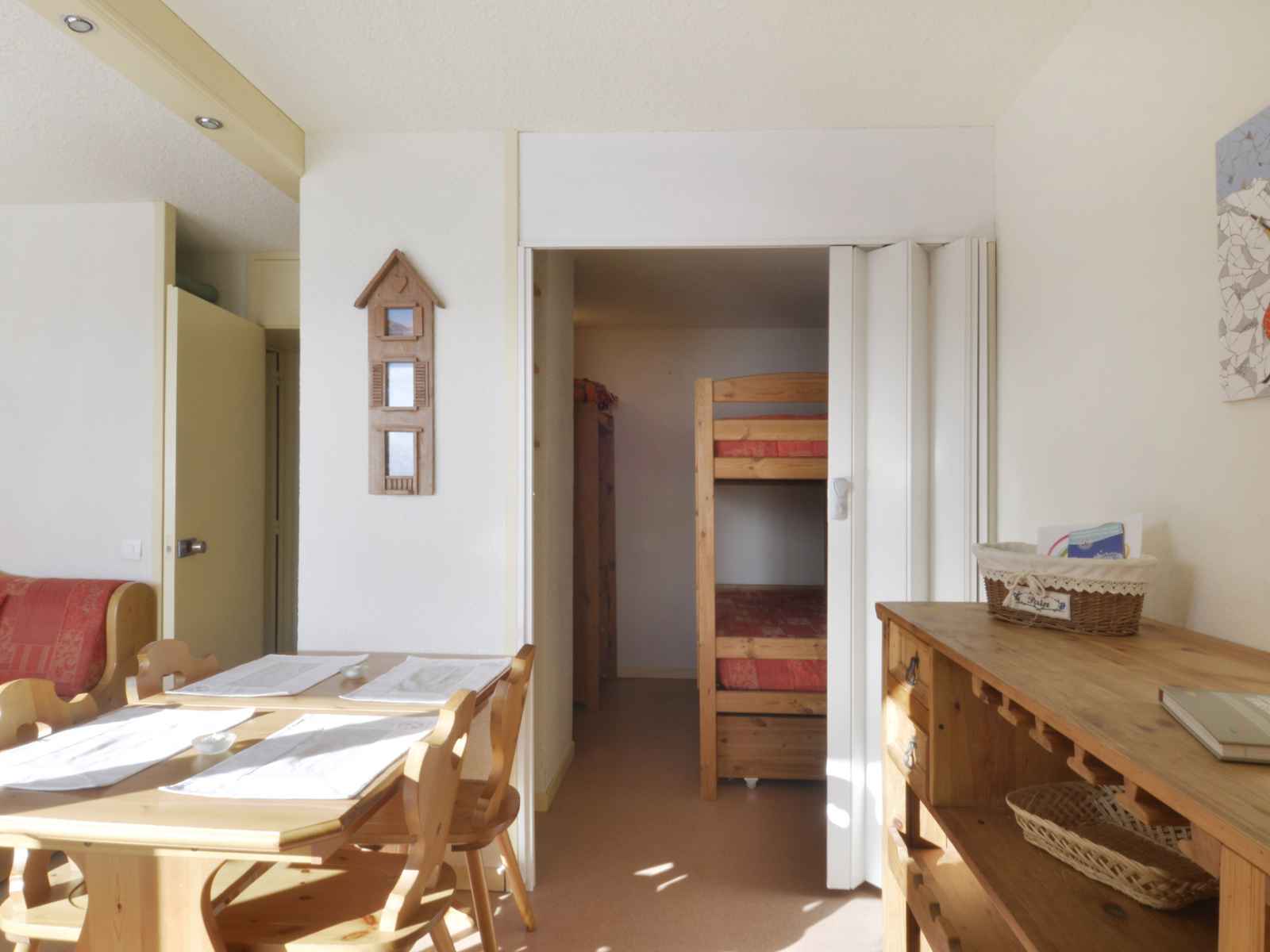 banquette 1 personne et 1 lit gigogne, 1 téléviseur écran plat + lecteur DVD Petite chambre : fermée par une porte accordéon, 2 lits superposés Salle de bain : baignoire WC séparés Draps et serviettes non fournis Equipé de couvertures Pas d'accès gratuit à la piscine WIFI station payant Animaux admis (30€ de supplément)