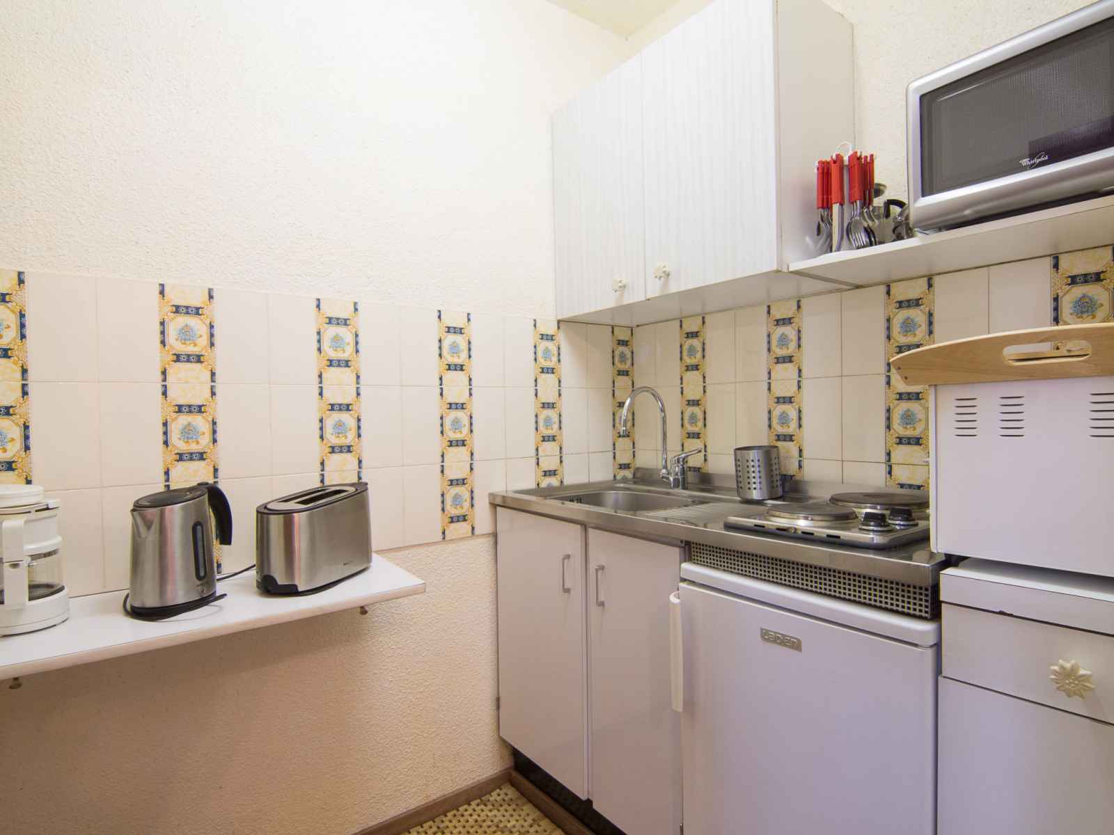 Studio 23 m2 au 3ème étage, situation ouest. aménagement agréable et plaisant: séjour/salle à manger avec baie vitrée avec 1 lit gigogne (2 pers. 2 x 80 cm, longueur 190 cm), tv (écran plat), dvd. sortie sur le balcon. alcôve avec rideau avec 1 divan-lit double (140 cm, longueur 190 cm). petite cuisine (2 plaques de cuisson, four,