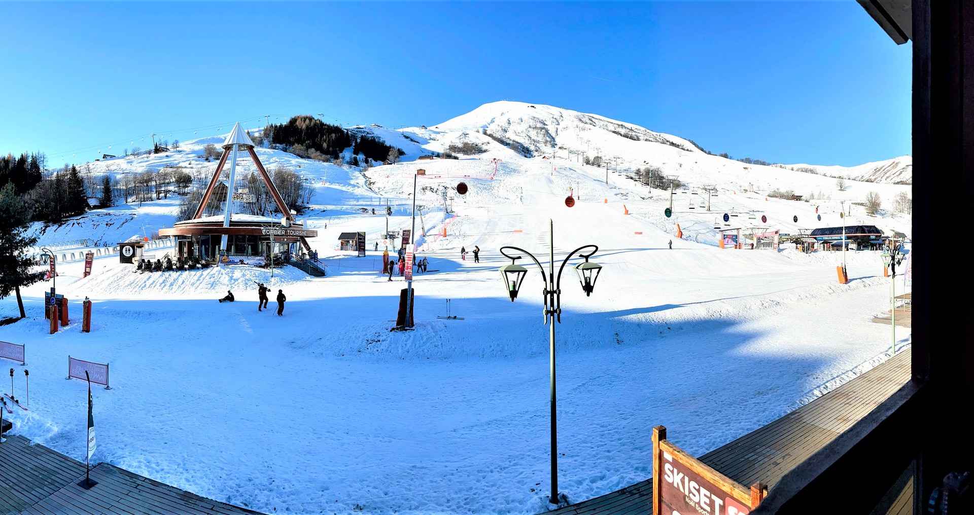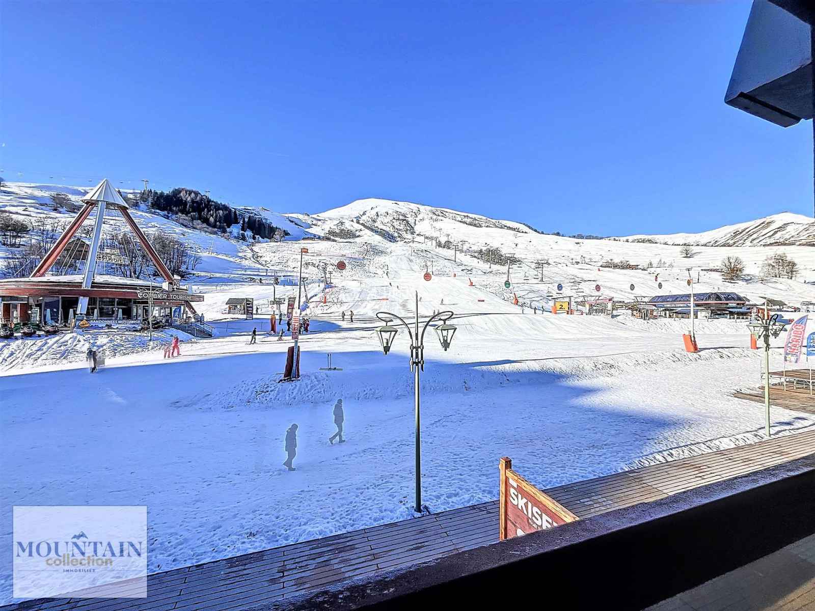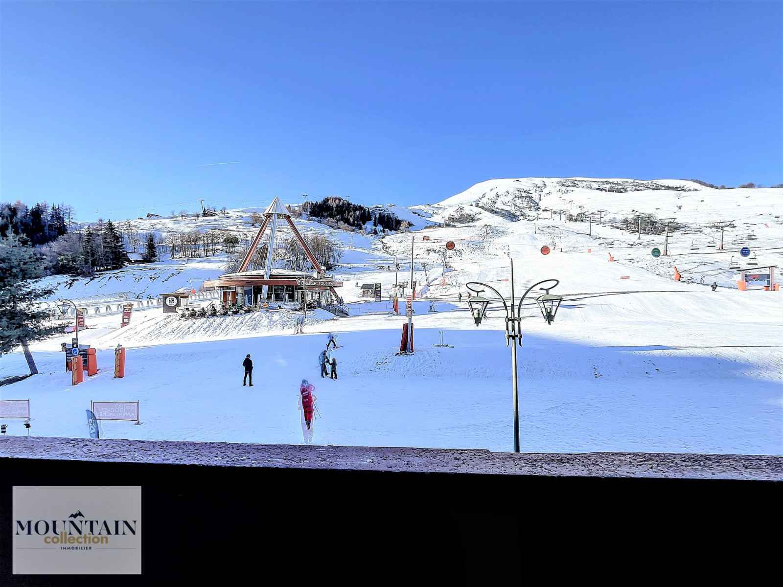 pour 2 personnes et TV écran plat, ouvrant sur un grand balcon avec vue imprenable sur l'Office de tourisme et les pistes. Le coin kitchenette est équipé de 2 feux vitro céramique, lave vaisselle, frigo top, cafetière Nespresso®, bouilloire, micro-ondes, grille pain, appareil à raclette. L'alcove comprend de 2 lits superposés en 90X200. Le grand balcon donnant directement sur le Front neige, vue sur l'Office de tourisme, les pistes et le Sybelles Express. Casier à ski. Logement équipé de couettes, prévoir vos housses de couettes L'Accès à la Piscine chauffée est offert durant votre séjour d'une semaine (+ de 3 ans) Linge de lit, serviettes, Wifi et ménage de fin de séjour en supplément. L'avis de l'Agence : IDEALEMENT SITUE, AGREABLE, DIRECTEMENT SUR FRONT DE NEIGE ET LES COURS ESF