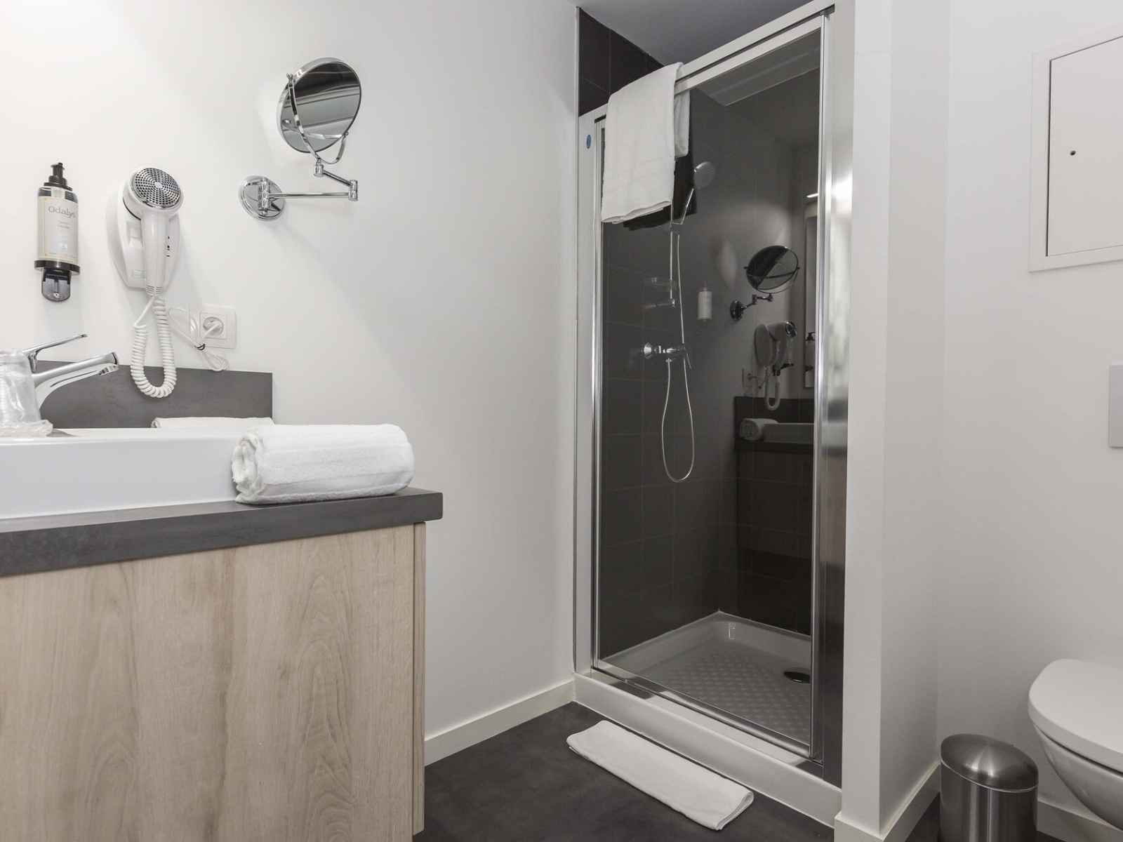 salle de bain avec douche, sèche-cheveux, sèche-serviettes