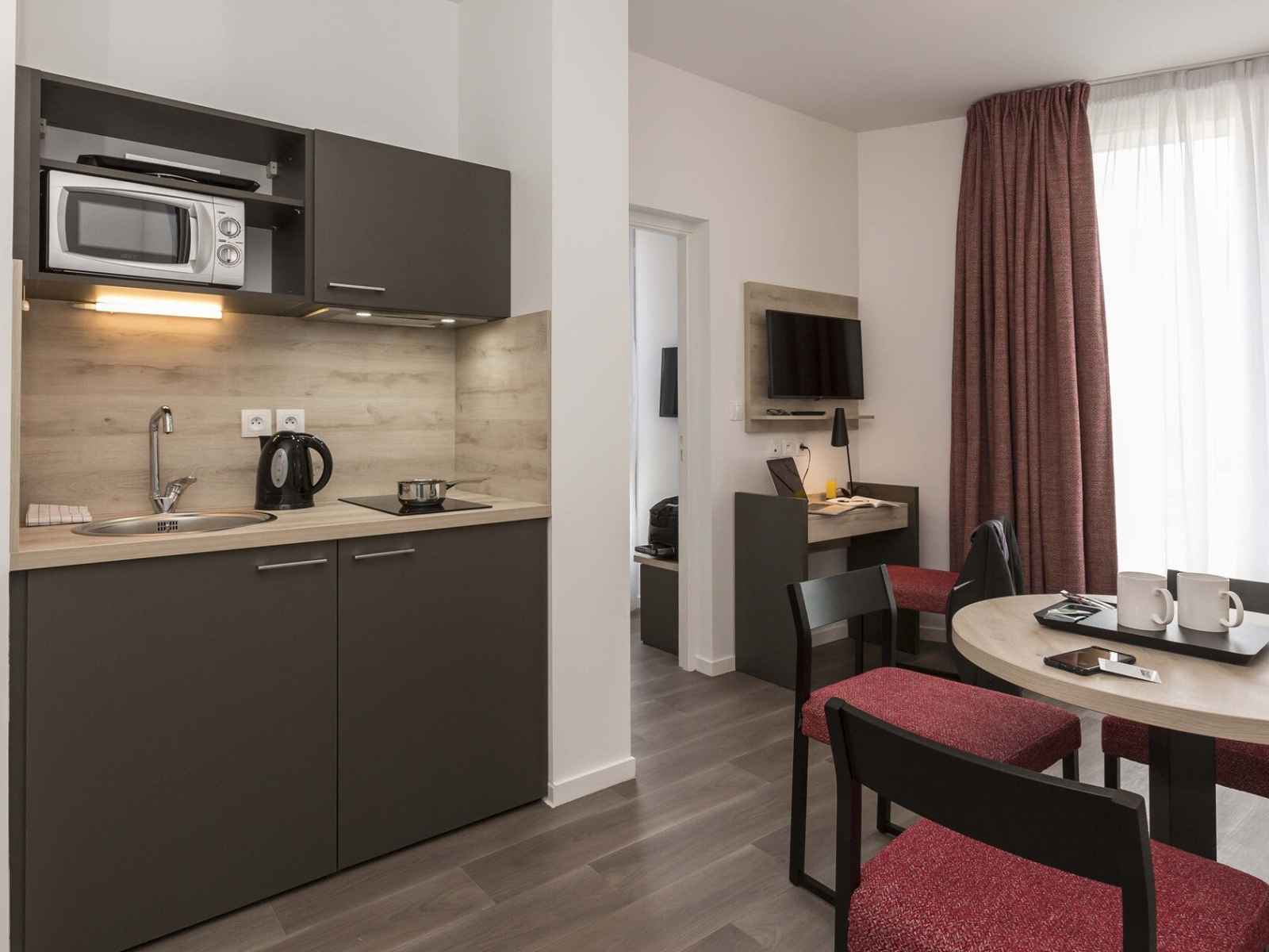 cuisine équipée (plaque électrique, hotte, réfrigérateur, micro-ondes, bouilloire, lave-vaisselle)
