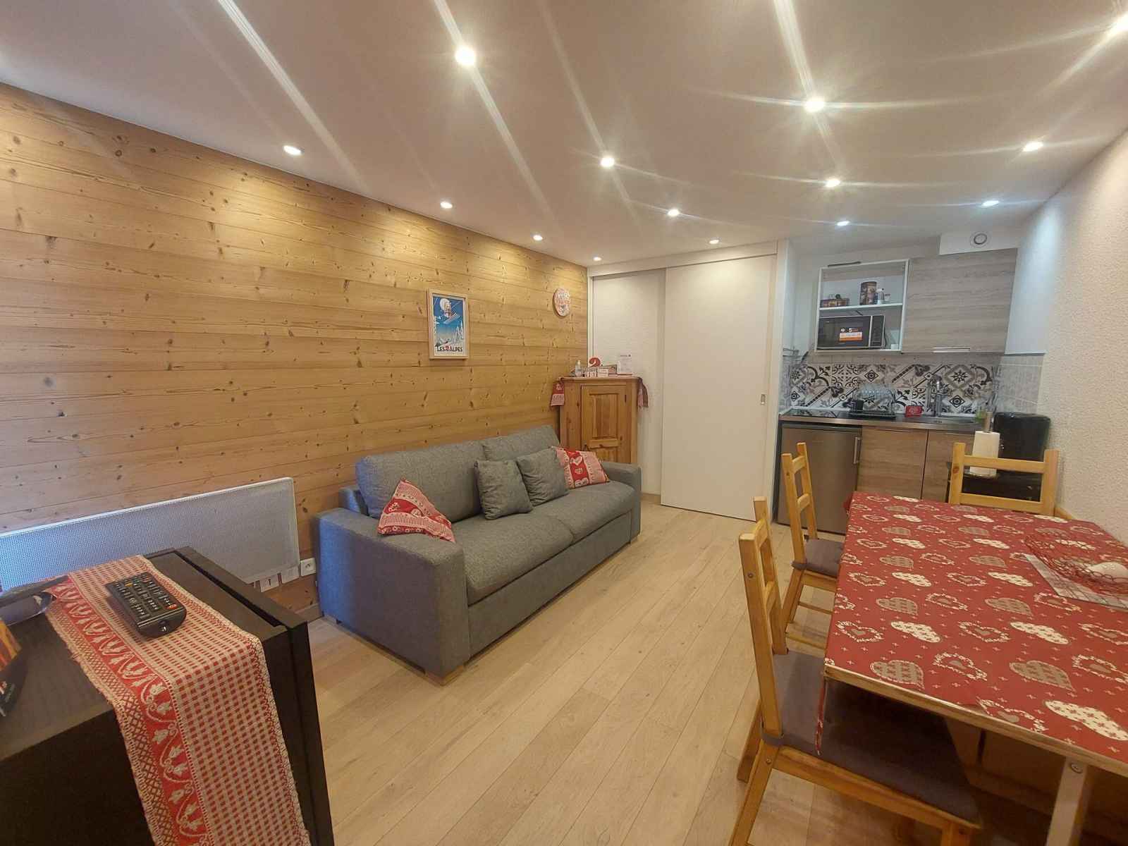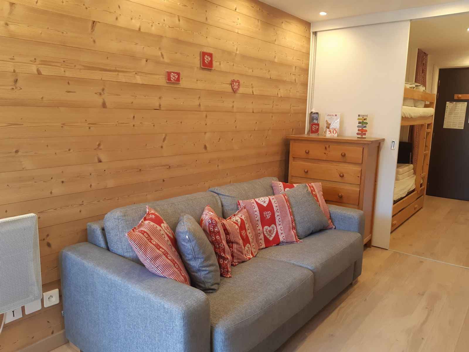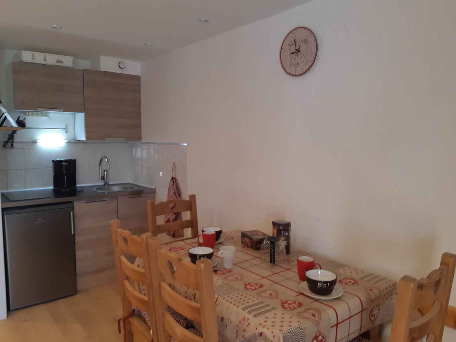 2 plaques vitrocéramiques, micro-onde, réfrigérateur, cafetière, grille-pain, appareil à raclette, appareil à fondue. Couchages : - Séjour : 1 canapé convertible (lit double : 140x190) - Coin nuit : 2 lits simples superposés (90x190 + 80x190) Couchage supérieur déconseillé aux – de 6 ans Le coin nuit est situé dans le couloir séparé du salon par une porte coulissante. Sanitaires : Salle d'eau avec douche WC séparés. Divers : Casier à ski Volet manuel en bois Parking payant, place non garantie. Animaux acceptés contre un supplément Le linge de lit, le linge de maison, les serviettes, le wifi ainsi que le ménage de fin de séjour ne sont pas inclus (à réserver au plus tard le jour de votre arrivée et sous réserve de disponibilité).