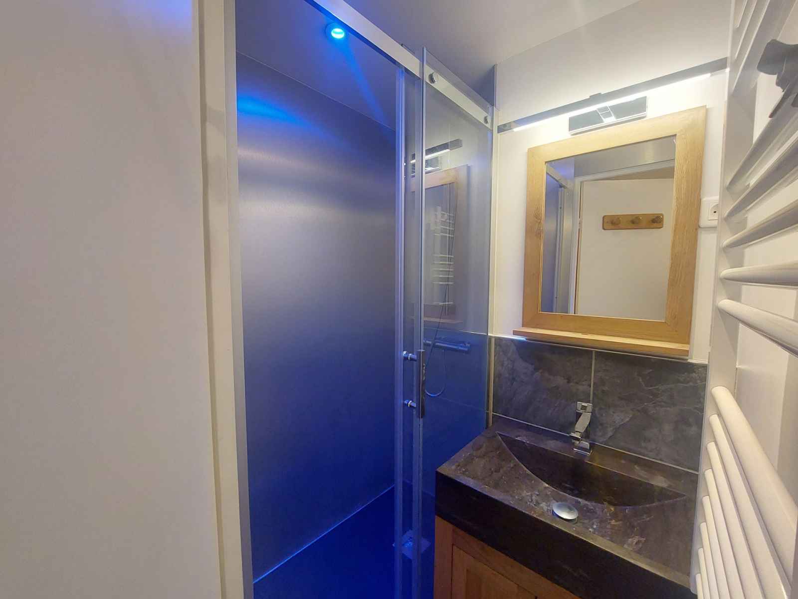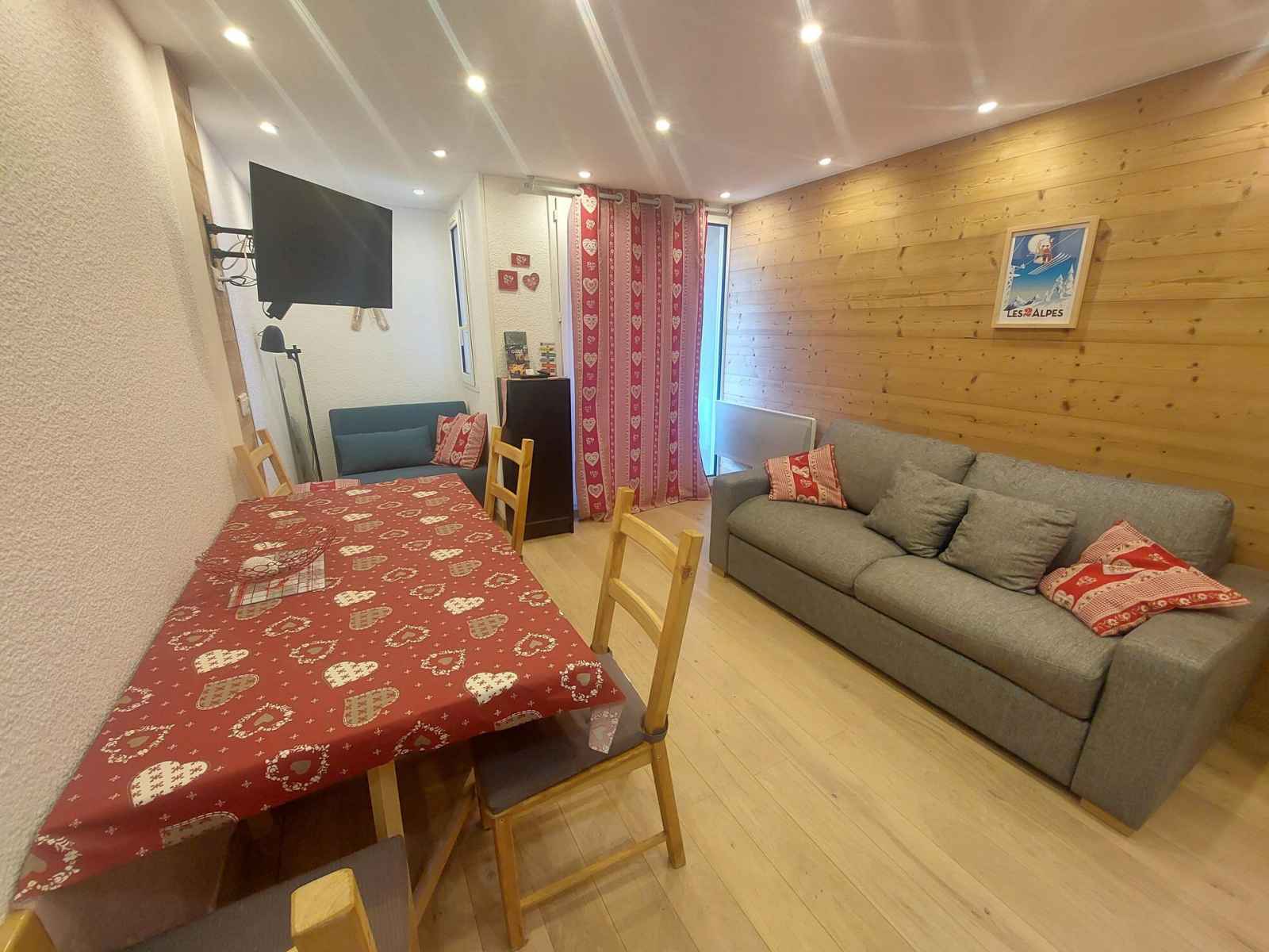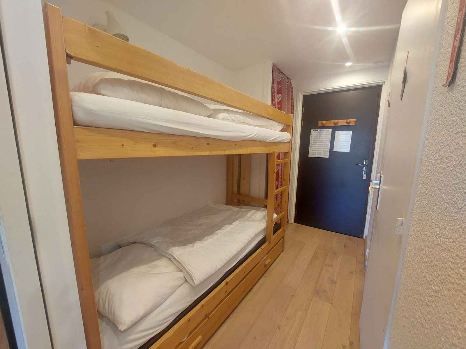 2 plaques vitrocéramiques, micro-onde, réfrigérateur, cafetière, grille-pain, appareil à raclette, appareil à fondue. Couchages : - Séjour : 1 canapé convertible (lit double : 140x190) - Coin nuit : 2 lits simples superposés (90x190 + 80x190) Couchage supérieur déconseillé aux – de 6 ans Le coin nuit est situé dans le couloir séparé du salon par une porte coulissante. Sanitaires : Salle d'eau avec douche WC séparés. Divers : Casier à ski Volet manuel en bois Parking payant, place non garantie. Animaux acceptés contre un supplément Le linge de lit, le linge de maison, les serviettes, le wifi ainsi que le ménage de fin de séjour ne sont pas inclus (à réserver au plus tard le jour de votre arrivée et sous réserve de disponibilité).