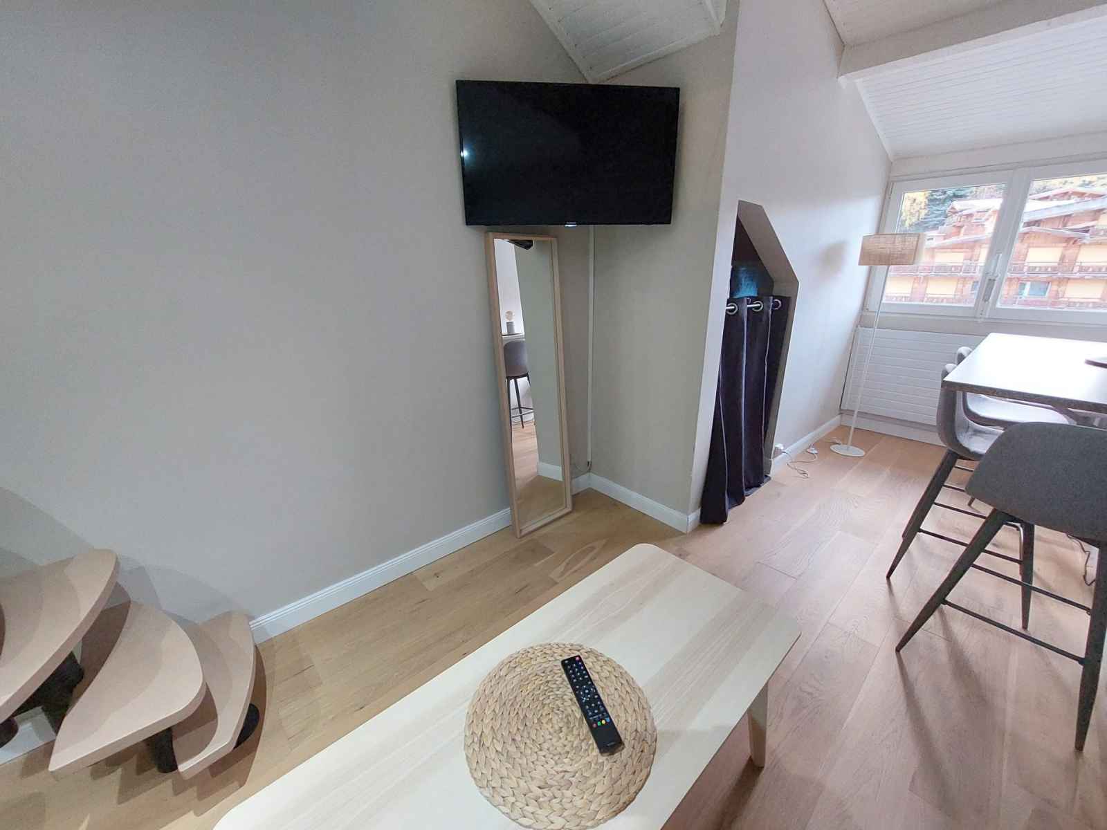 pièce à vivre : séjour avec télévision, canapé et coin repas.