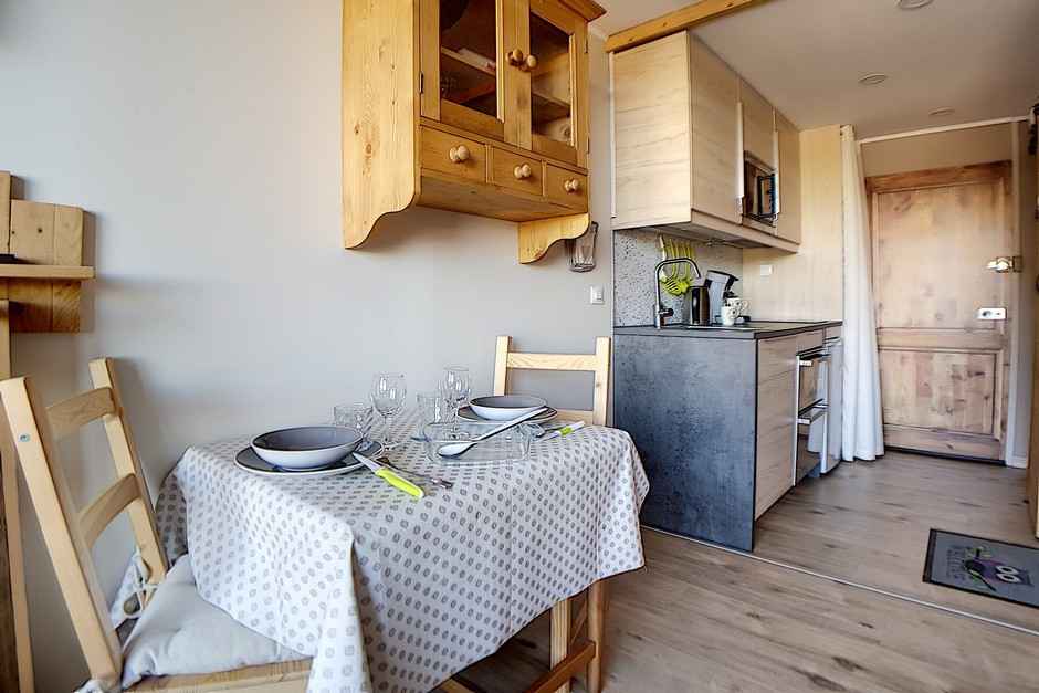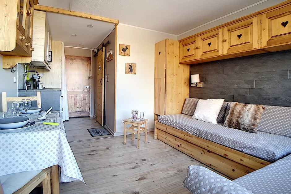 Studio entièrement rénové de 17m² pour 2 personnes avec petit balcon orienté nord. situé au 1er étage de la résidence chavière, vous donnant un accès direct aux pistes et à la galerie de la croisette.