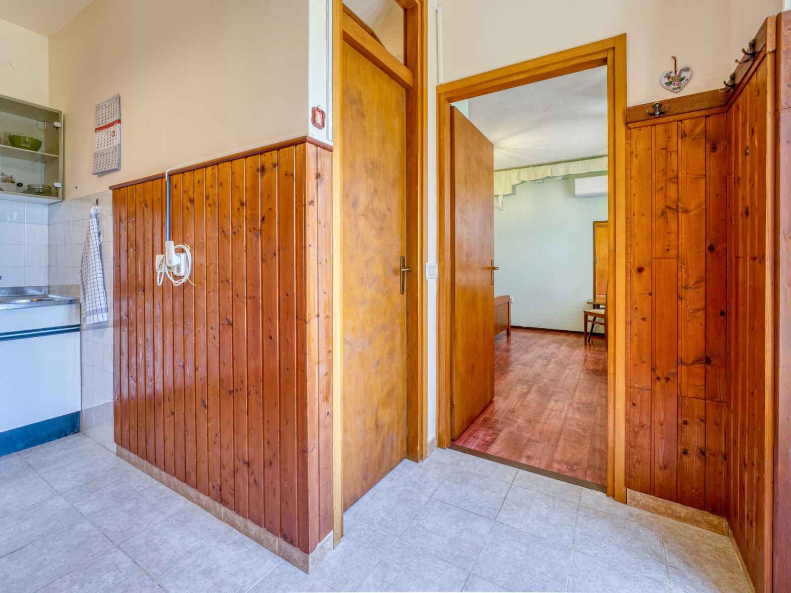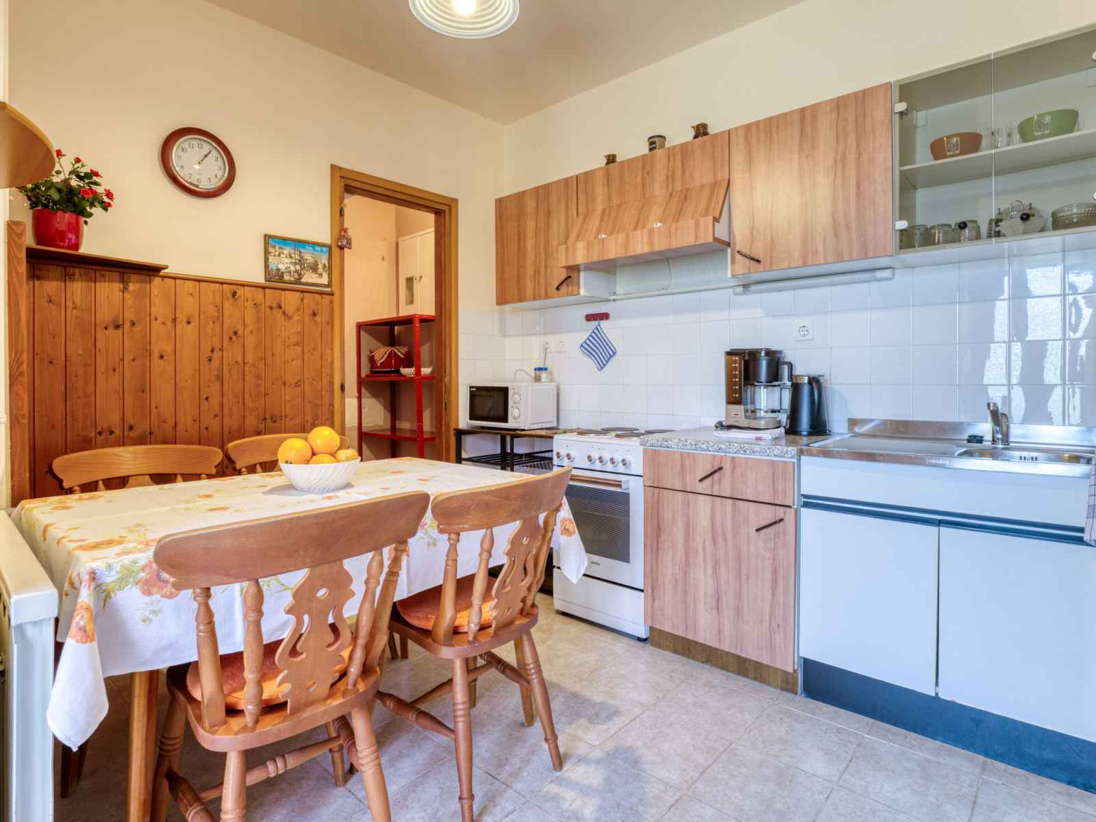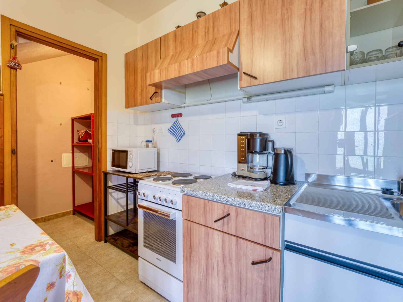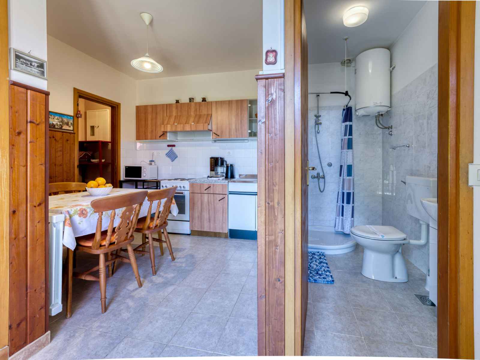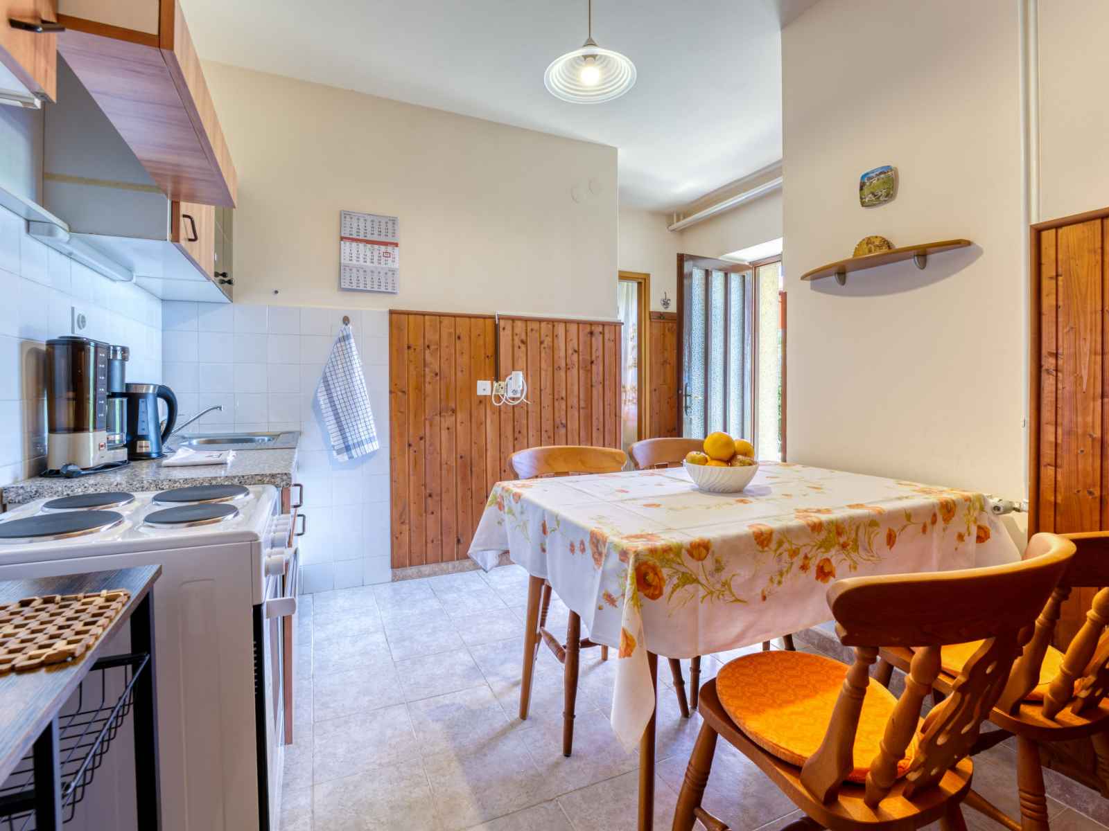 Studio 35 m2, au rez-de-chaussée, situation sud. 1 chambre avec 1 lit double (2 x 90 cm, longueur 200 cm), tv (satellite) et air-conditionné. salle à manger. sortie sur la terrasse. cuisine ouverte (4 plaques de cuisson, four, cafetière électrique). douche/wc. chauffage (en sus). terrasse 27 m2 partiellement couverte, pelouse 25 m2. meubles