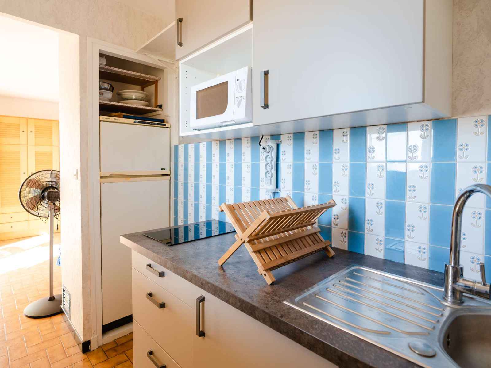 Cuisine aménagée et équipée comprenant : plaque de cuisson vitrocéramique, cafetière électrique classique, bouilloire, micro-ondes, réfrigérateur, petit congélateur, etc.) donnant sur salon avec télévision (chaines françaises uniquement). Couchage dans le salon sous la forme d'un lit rabattable en 140x190cm.
