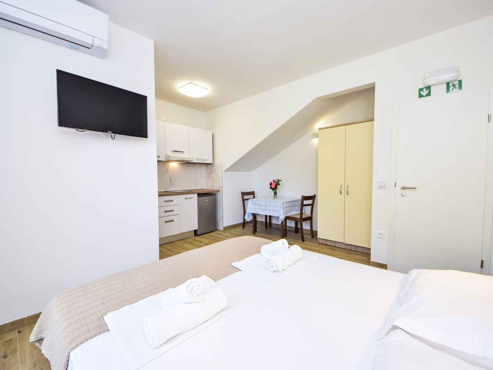 Studio 18 m2 au 1er étage. 1 chambre avec 1 lit double (160 cm, longueur 200 cm), douche/wc, tv (satellite) et air-conditionné. sortie sur la terrasse. cuisine/séjour (2 plaques vitrocéramiques, grille-pain, bouilloire électrique, cafetière électrique) avec table pour les repas. terrasse 15 m2. meubles de terrasse. vue partielle sur la mer.