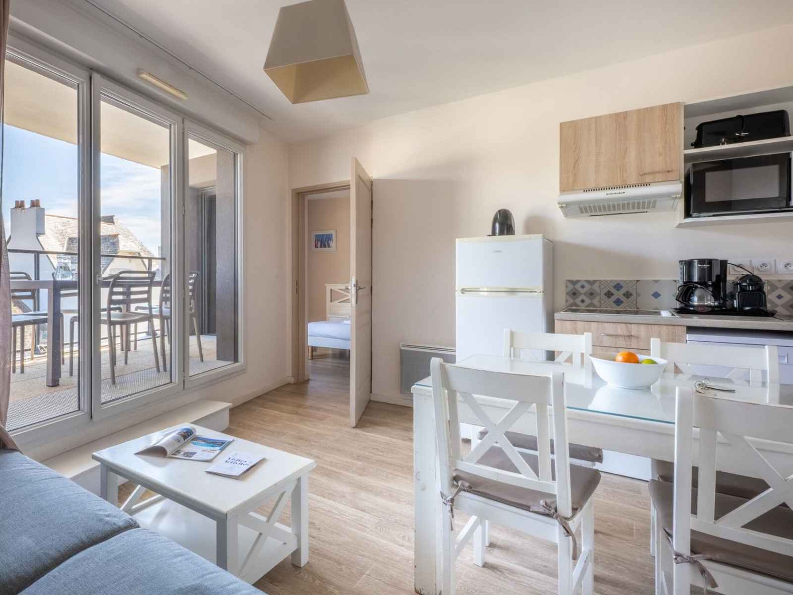 kitchenette équipée (plaque vitrocéramique, micro-ondes/gril, lave-vaisselle, cafetière et bouilloire)