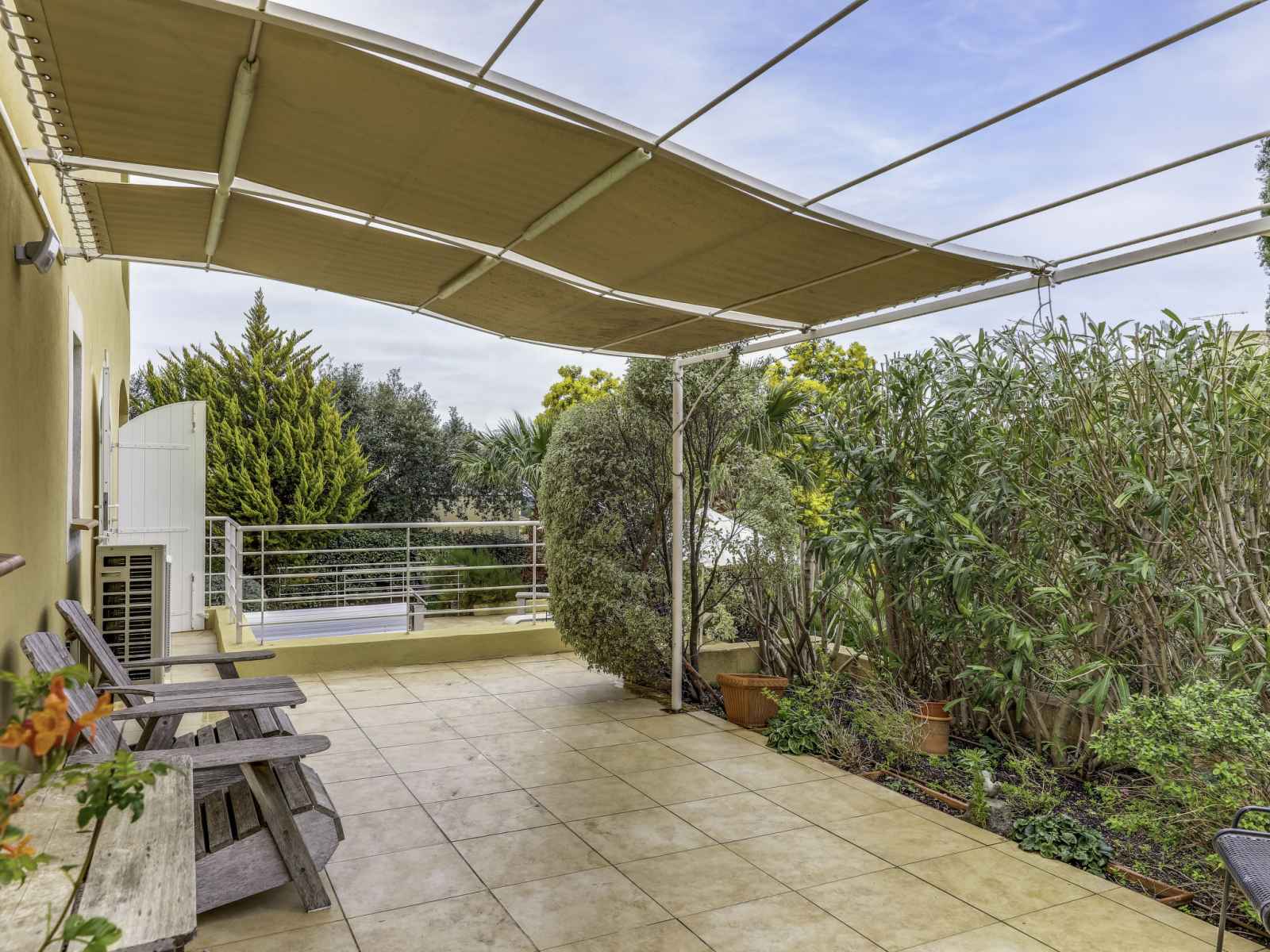 grille-pain, bouilloire électrique, micro-ondes, cafetière électrique). Douche/WC. Chauffage. Grande terrasse 31 m2 partiellement couverte, petite terrasse 18 m2. Meubles de terrasse, chaises longues (2). Vue sur le jardin. A disposition: lave-linge, fer à repasser, sèche-cheveux. Internet (Connexion WIFI, gratuit). Place de parking (1 Voiture). Veuillez noter: non recommandé pour des enfants en bas âge. Entrée privée, détecteur de fumée.