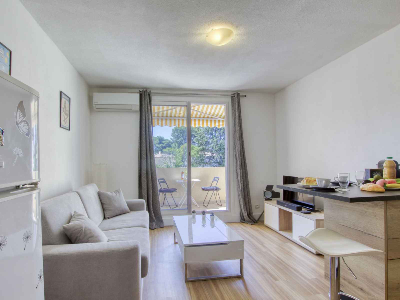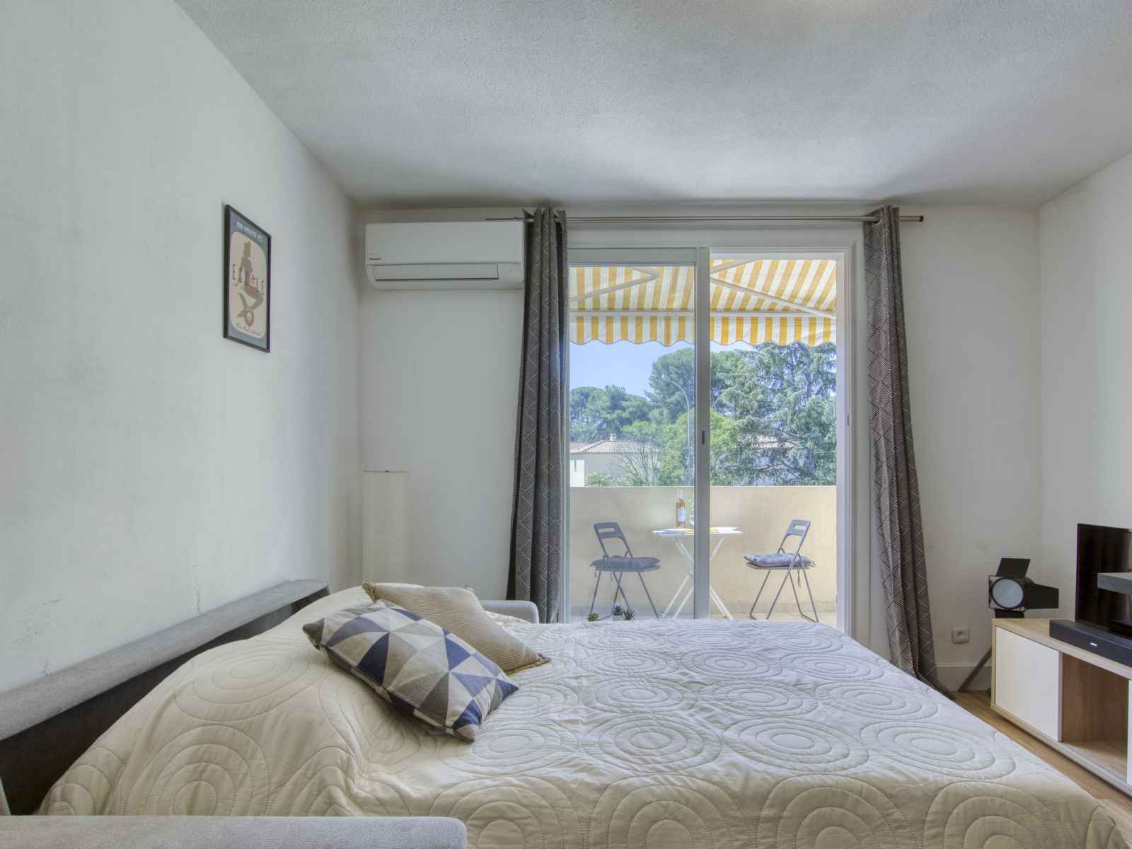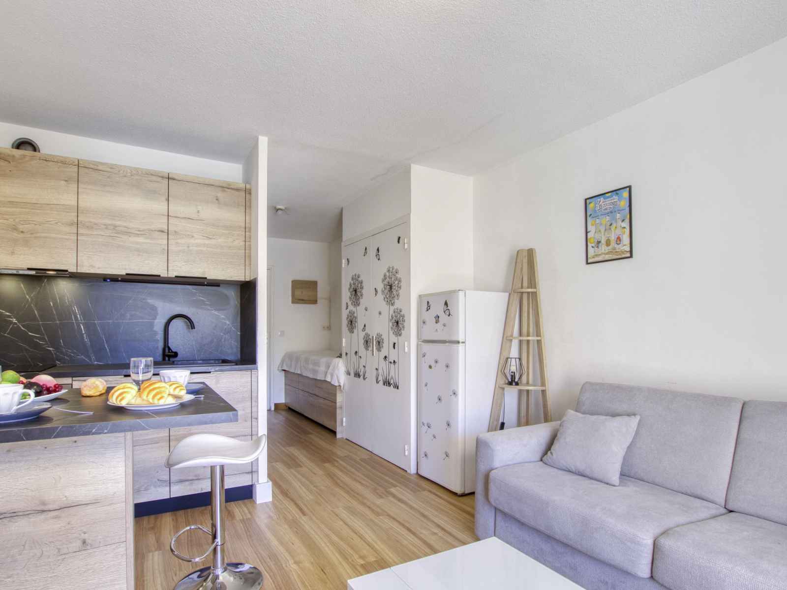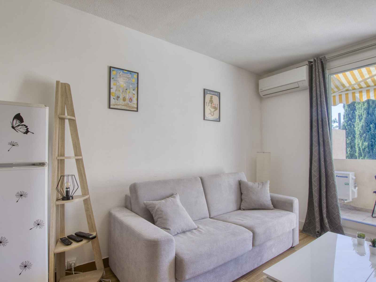 Studio 24 m2 au 1er étage. clair, partiellement rénové en 2023, aménagement confortable et agréable: séjour/salle à manger avec 1 divan-lit double (140 cm, longueur 190 cm), tv (écran plat), air-conditionné. sortie sur la terrasse. coin cuisine (lave-vaisselle, 2 plaques à induction, grille-pain, bouilloire électrique, cafetière