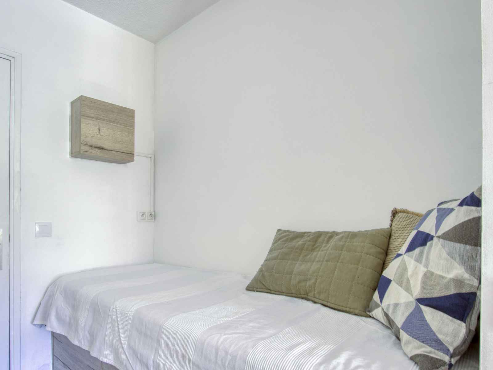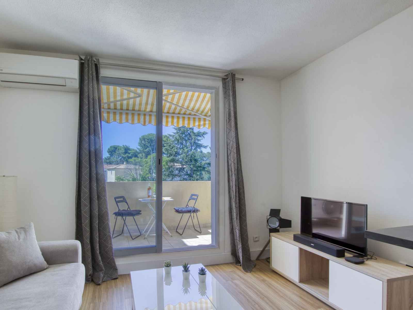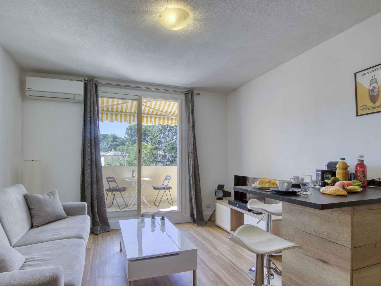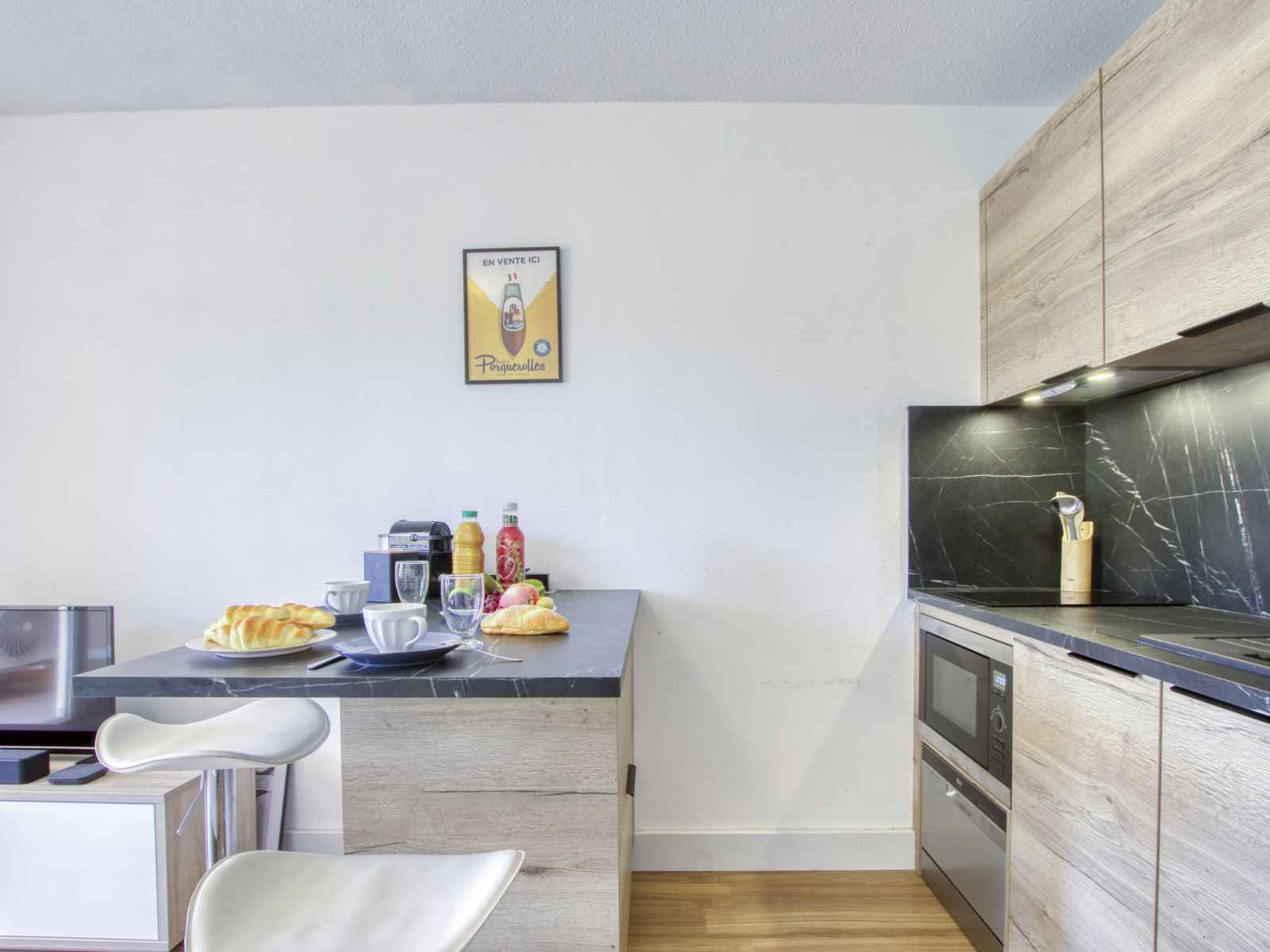 Studio 24 m2 au 1er étage. clair, partiellement rénové en 2023, aménagement confortable et agréable: séjour/salle à manger avec 1 divan-lit double (140 cm, longueur 190 cm), tv (écran plat), air-conditionné. sortie sur la terrasse. coin cuisine (lave-vaisselle, 2 plaques à induction, grille-pain, bouilloire électrique, cafetière