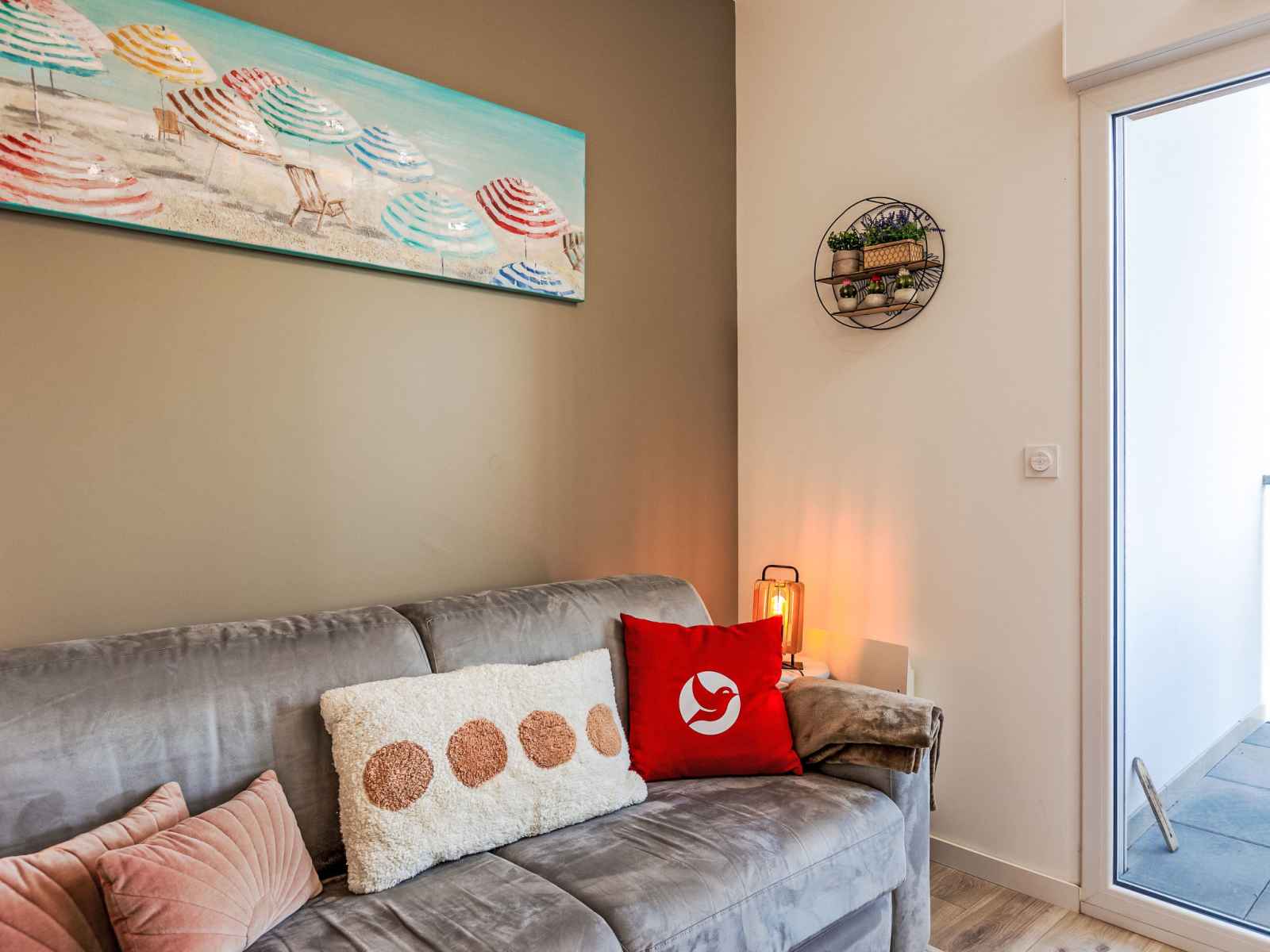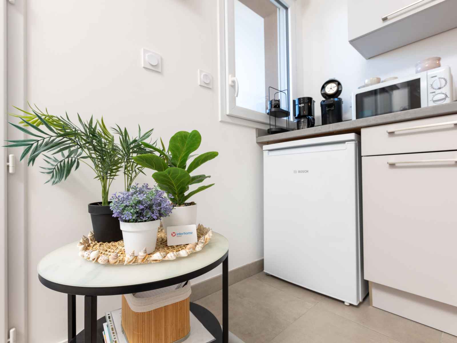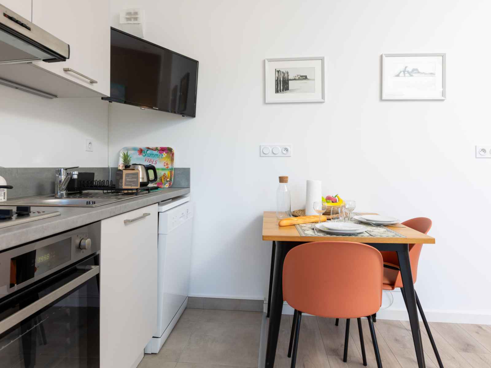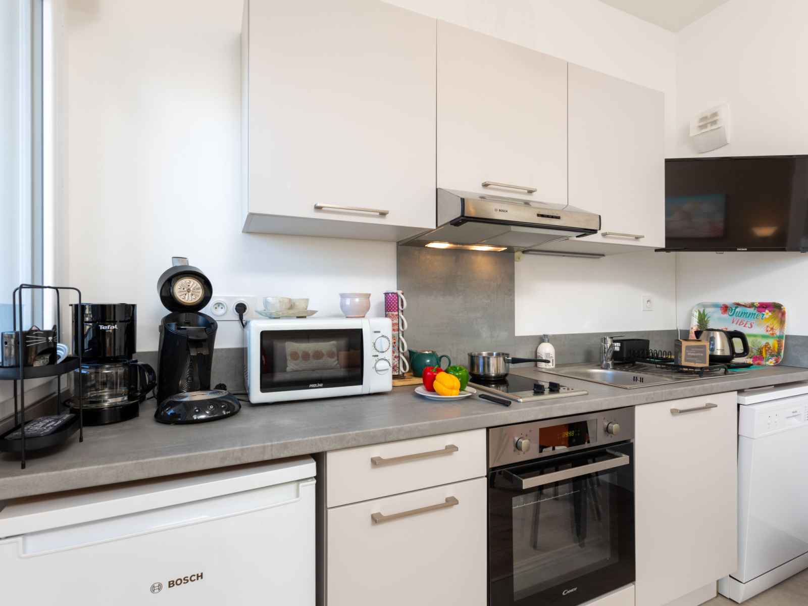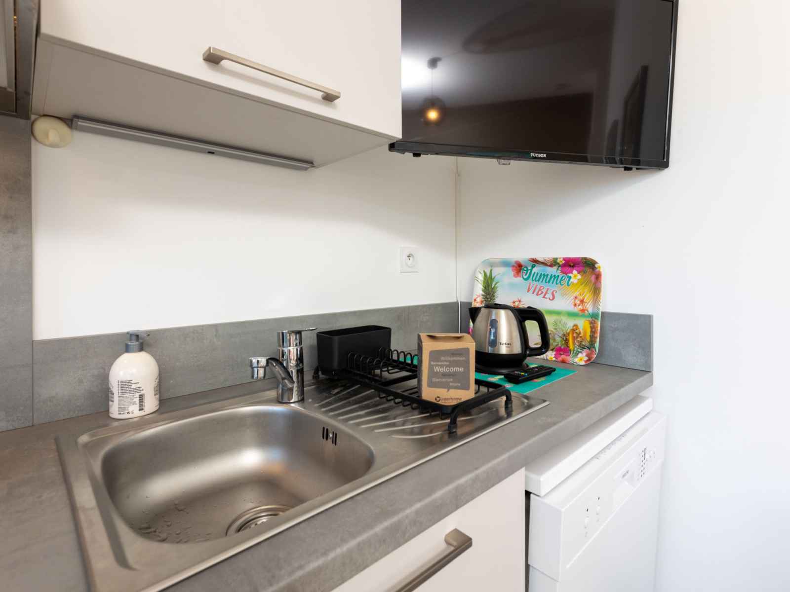 Studio 22 m2 au 3ème étage. aménagement agréable et de bon goût: studio avec 1 divan-lit double (1 x 140 cm, longueur 190 cm), tv (écran plat). sortie sur la terrasse. cuisine ouverte (four, lave-vaisselle, 2 plaques vitrocéramiques, grille-pain, bouilloire électrique, cafetière électrique, capsules pour machine à café (tassimo) (non