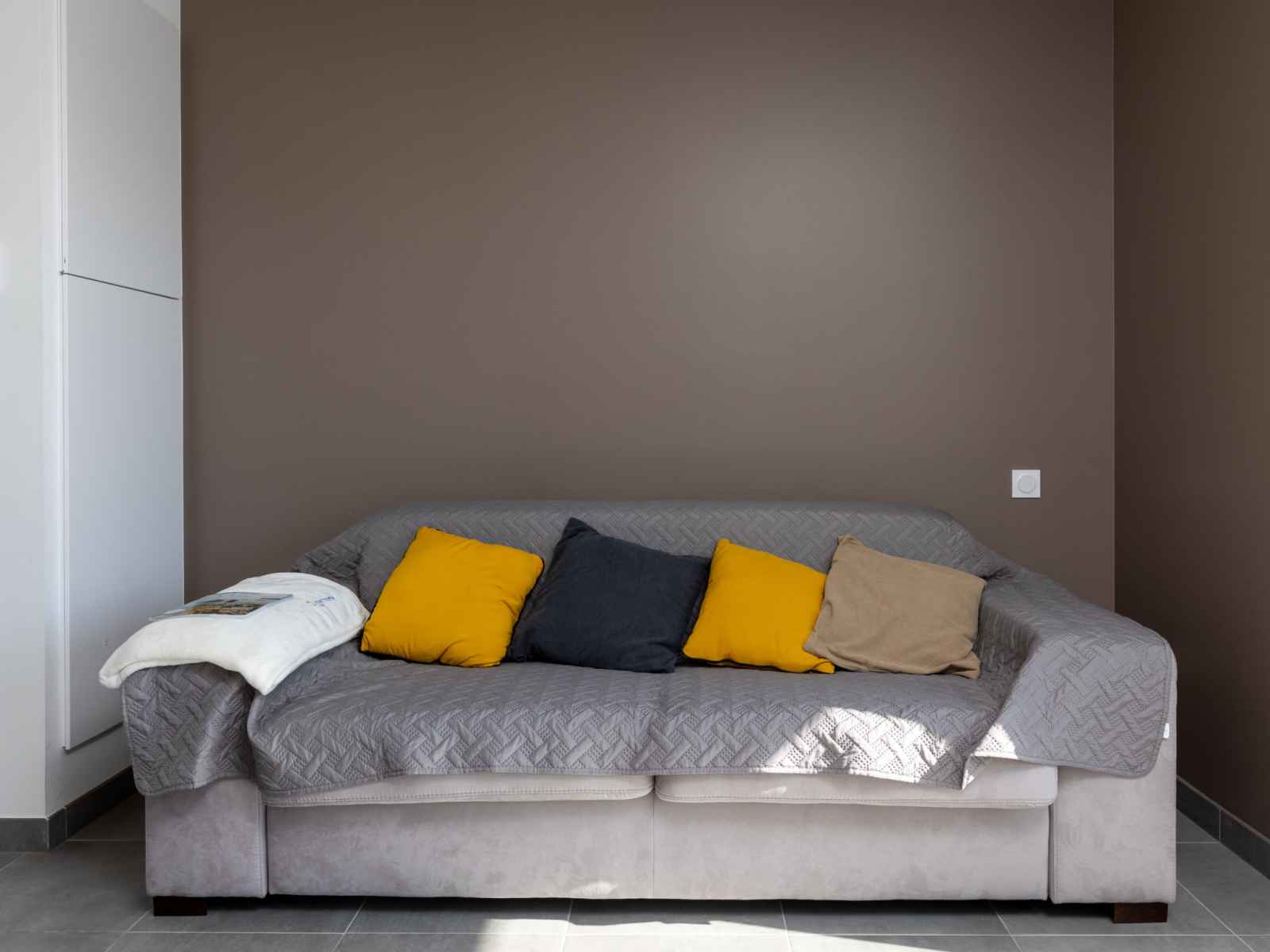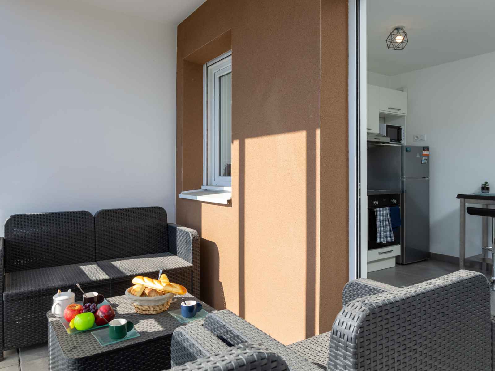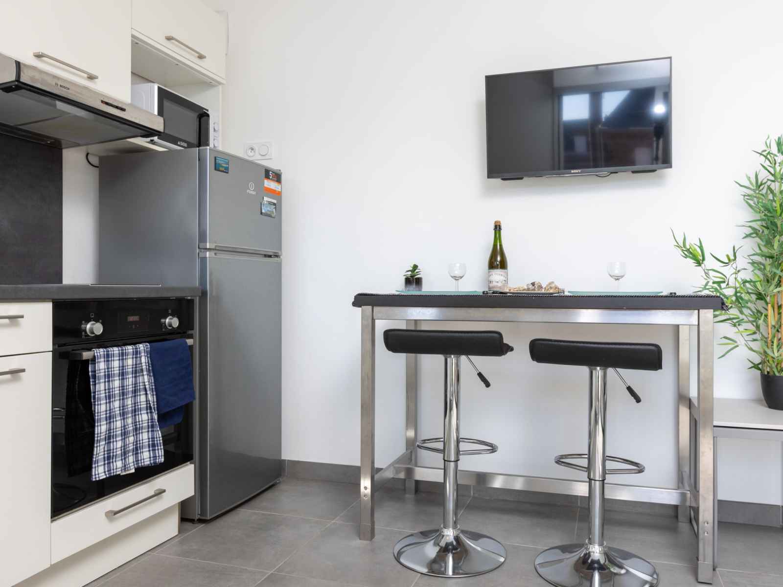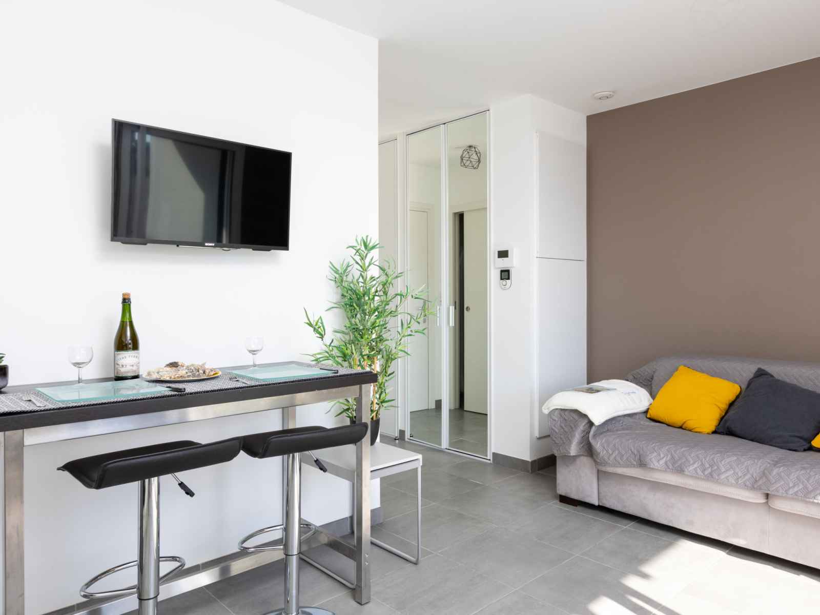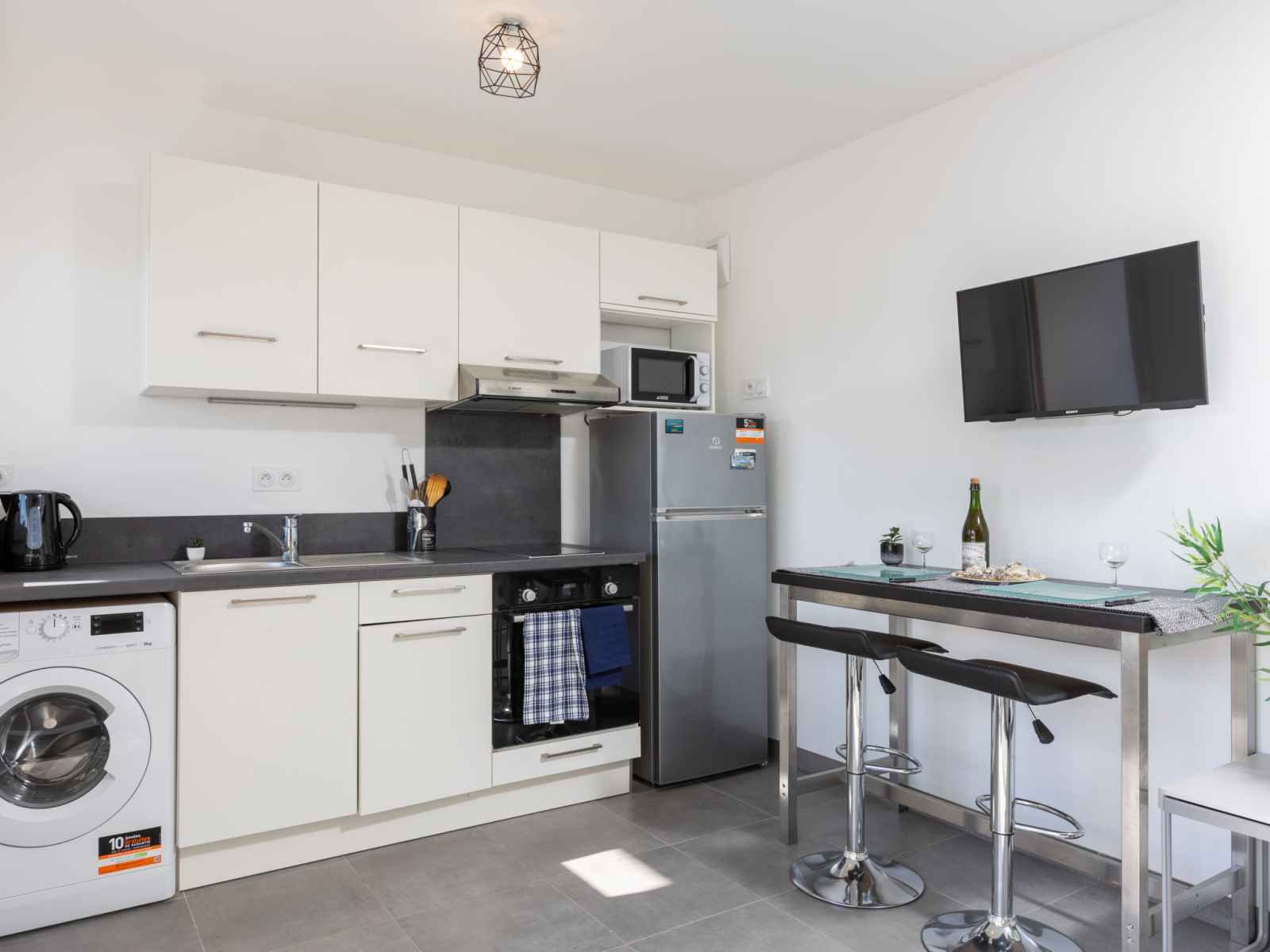 "le studio hermine" studio 22 m2 au 2ème étage. clair, aménagement confortable et de bon goût: grand séjour avec baie vitrée avec 1 divan-lit double (1 x 140 cm, longueur 190 cm), tv (écran plat). sortie sur la terrasse. cuisine ouverte (four, 2 plaques à induction, grille-pain, bouilloire électrique, micro-ondes, congélateur, cafetière
