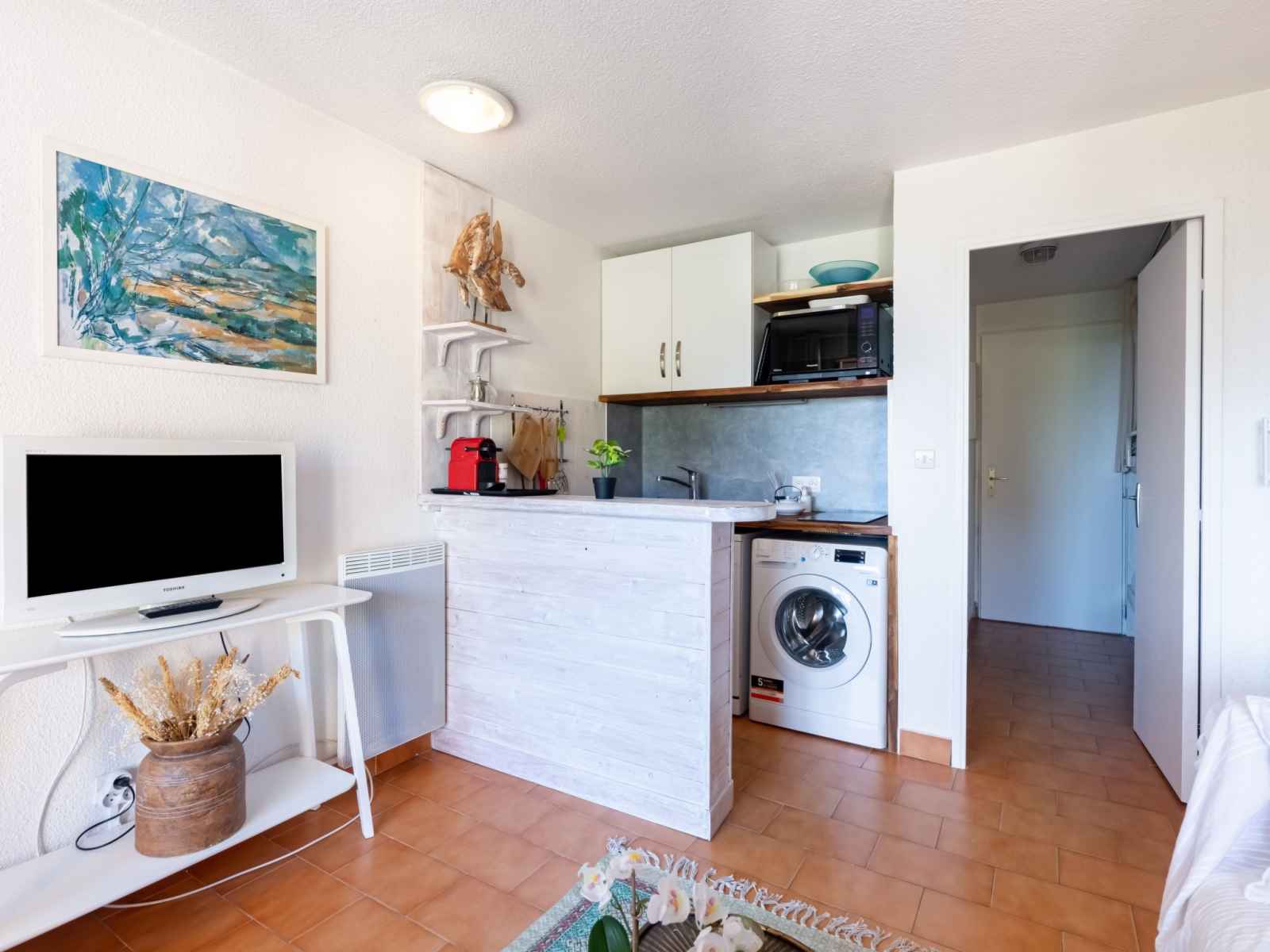 électrique, cafetière électrique, combiné micro-ondes). Bain/WC. Chauffage électrique. Terrasse 12 m2. Meubles de terrasse. Vue partielle sur la mer. A disposition: lave-linge. Internet (Connexion WIFI, en sus). Veuillez noter: logement non-fumeur. Maximum 1 animal/ chien autorisé. Détecteur de fumée. Au lieu d'une chambre fermée, des espaces de couchage sont situés dans une zone ouverte (galerie, alcôve...). 83115003597NH