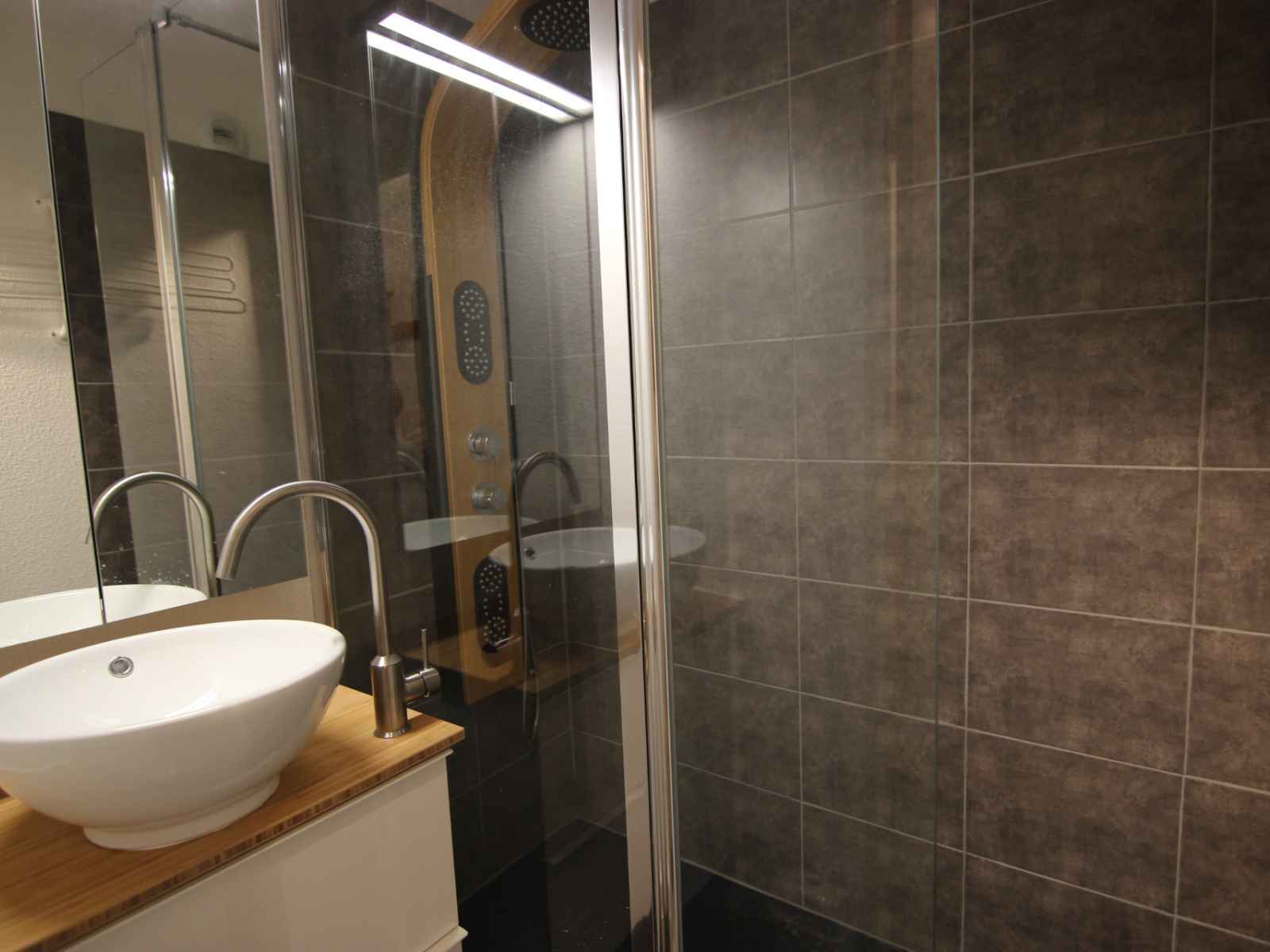 salle de bain : douche italienne, lavabo.