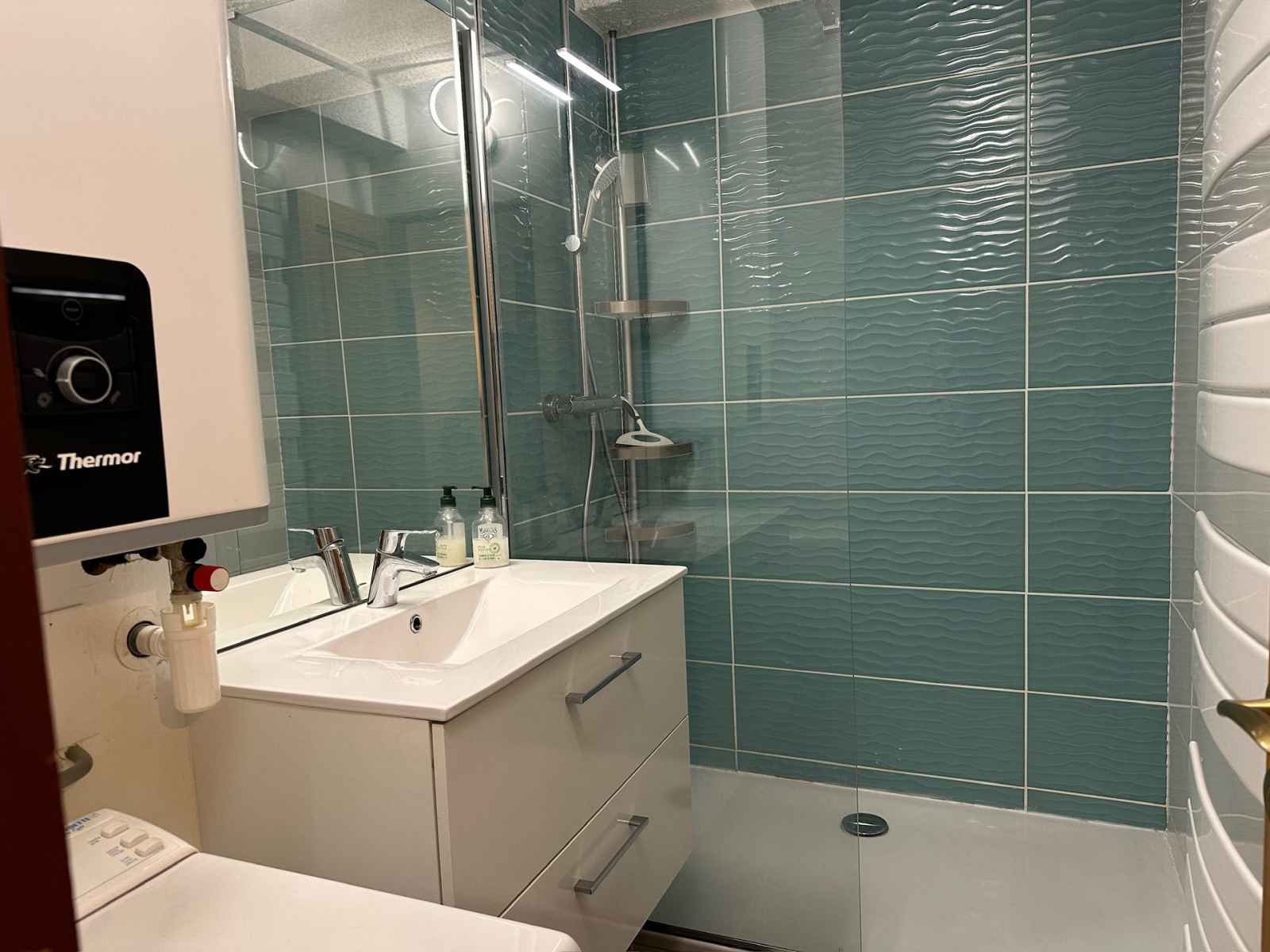 un premier espace nuit à l'entrée de l'appartement avec un coin montagne deux lits simples superposés. nous avons un wc séparé, une salle d'eau séparée.
