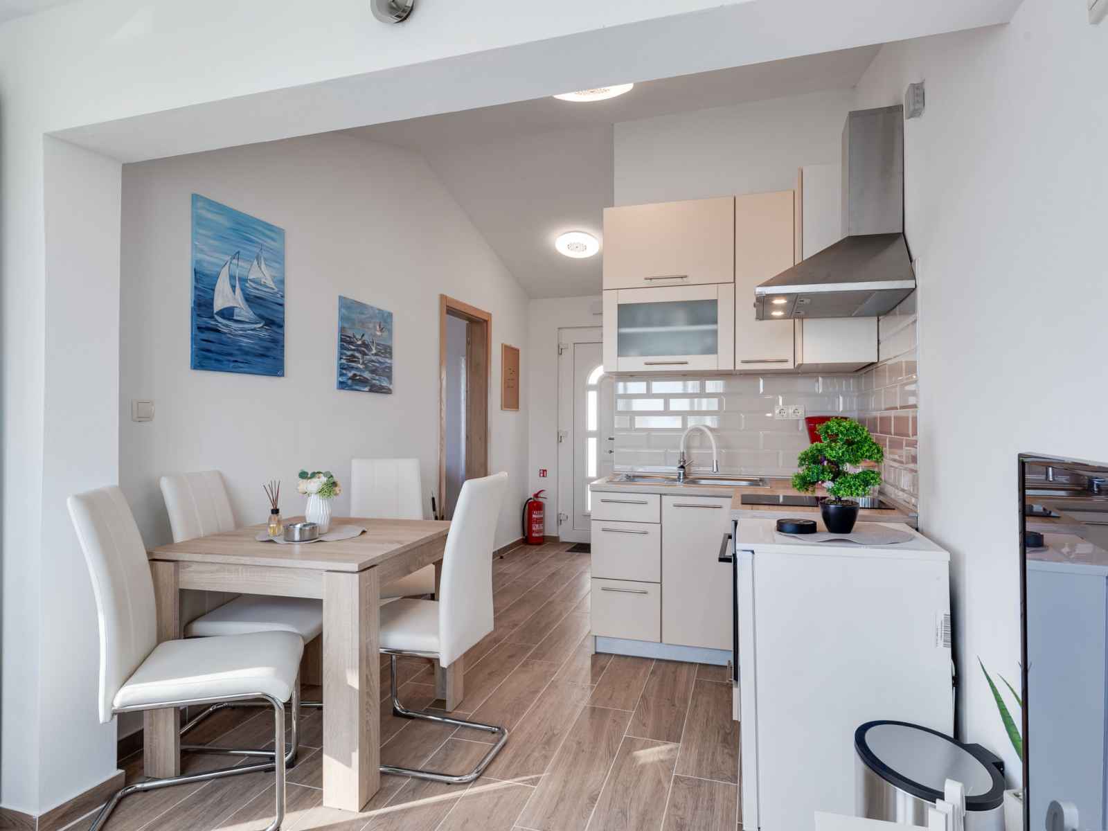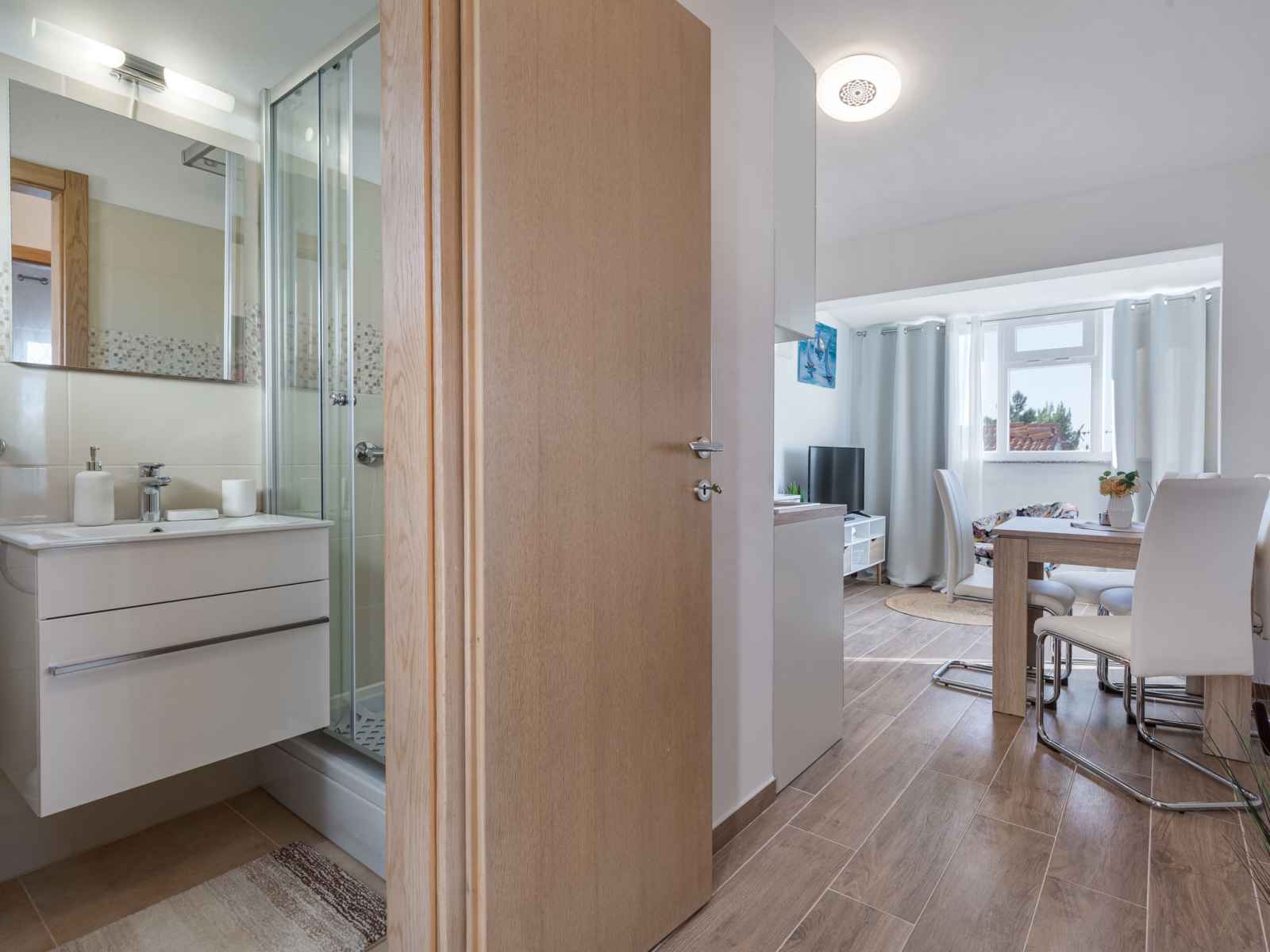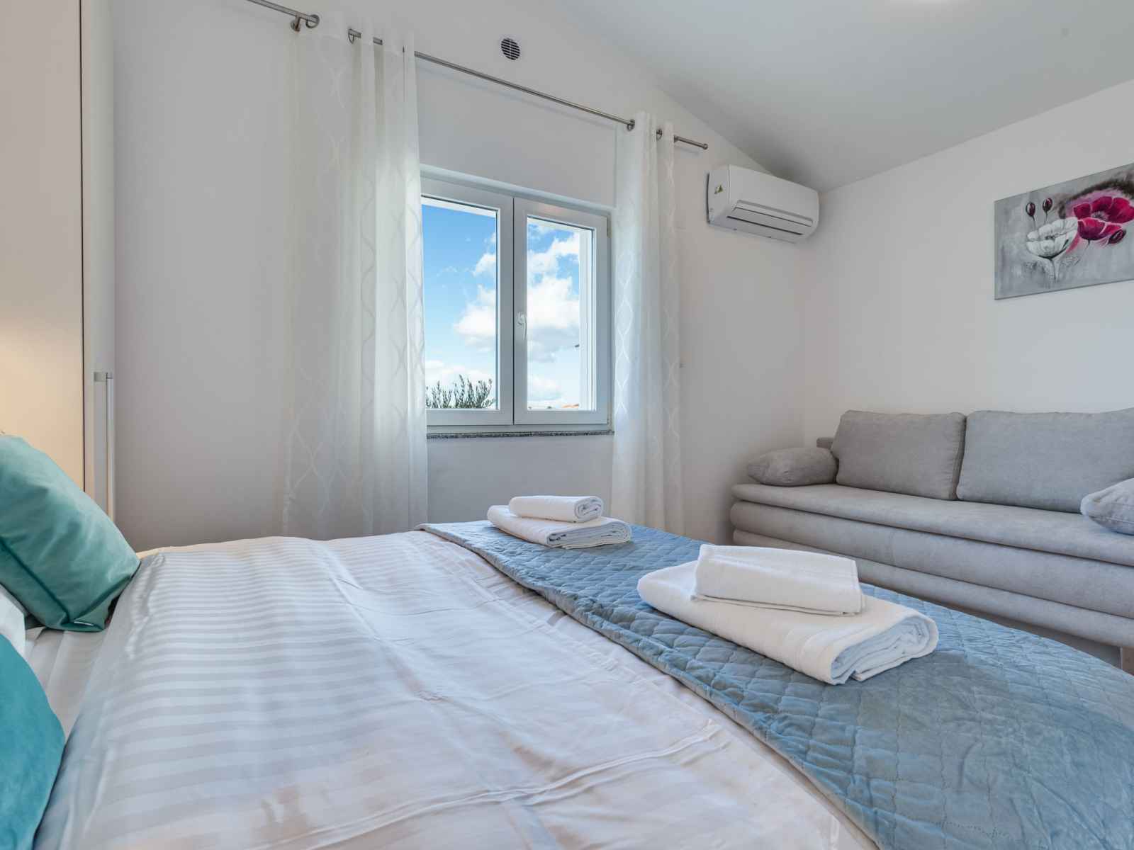 Studio 35 m2 au 1er étage. 1 chambre avec 1 divan-lit (145 cm, longueur 200 cm), 1 lit double (2 x 80 cm, longueur 200 cm). cuisine (four, 2 plaques vitrocéramiques, grille-pain, bouilloire électrique, cafetière électrique) avec table pour les repas, tv (satellite) (écran plat), air-conditionné. sortie sur le balcon. douche/wc. pas de