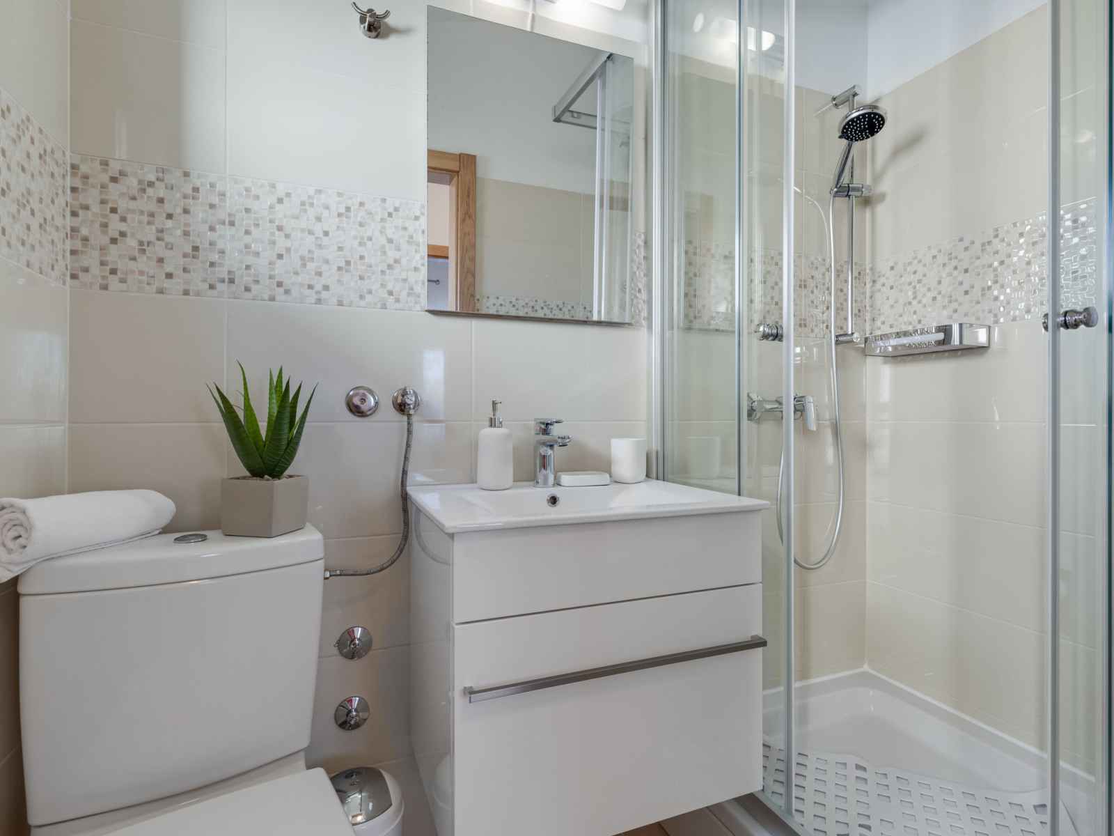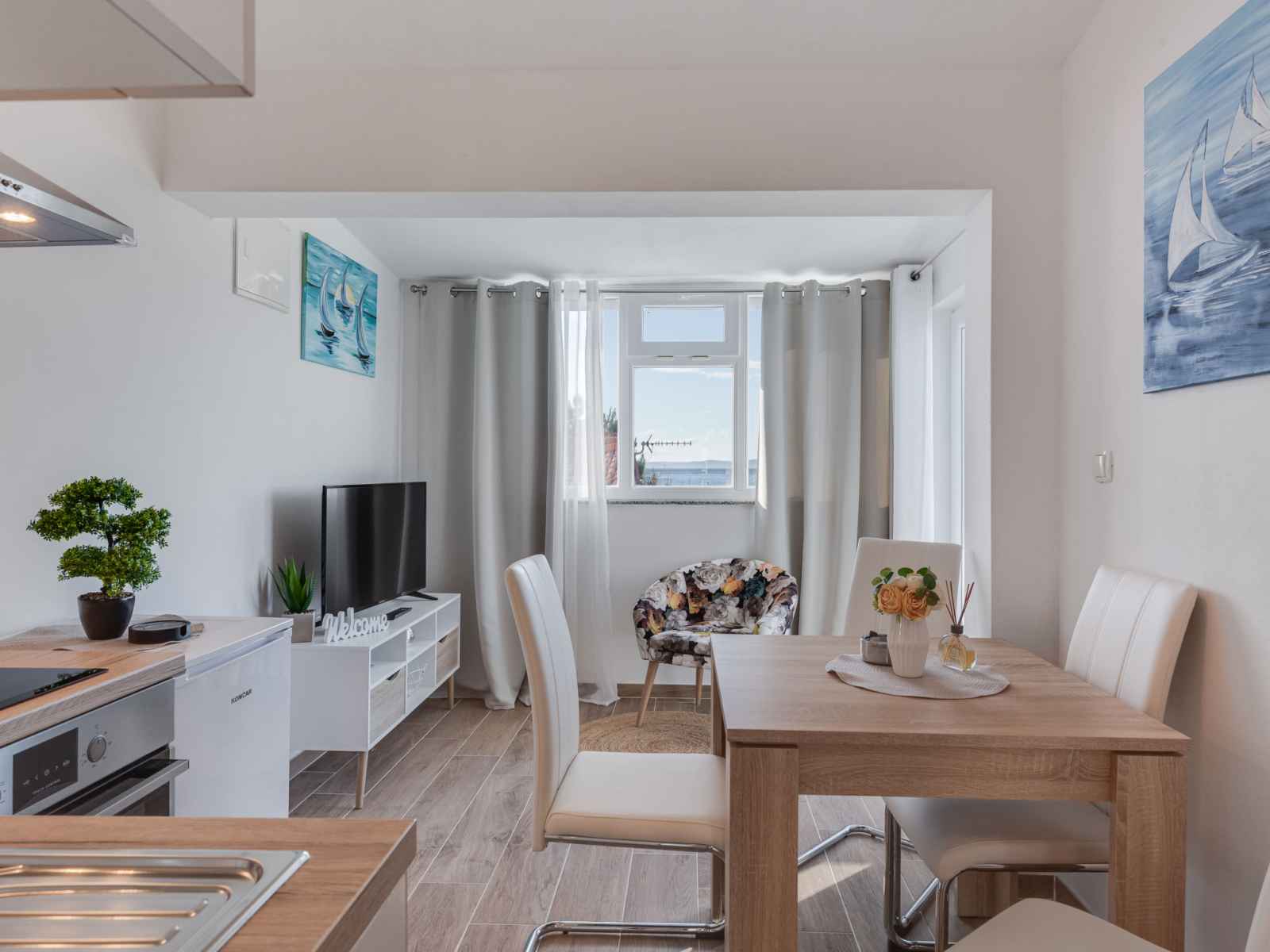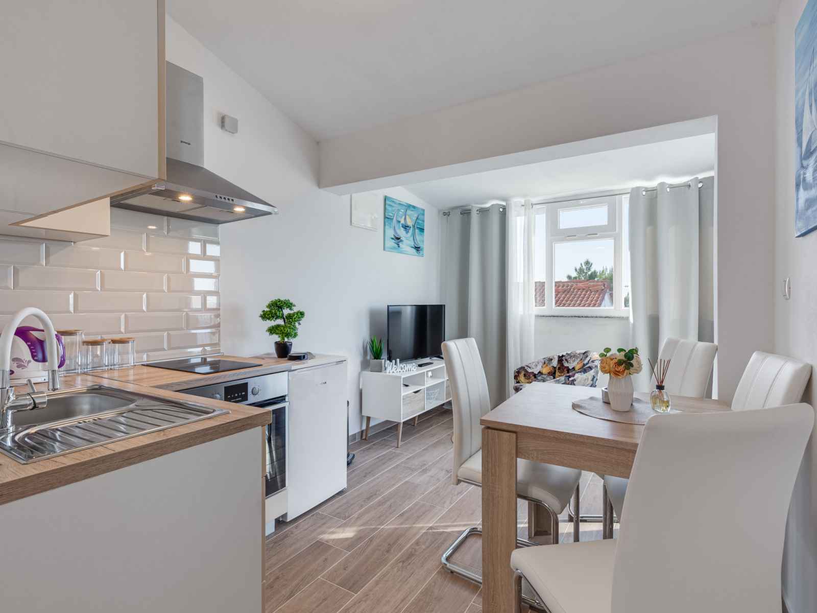 Studio 35 m2 au 1er étage. 1 chambre avec 1 divan-lit (145 cm, longueur 200 cm), 1 lit double (2 x 80 cm, longueur 200 cm). cuisine (four, 2 plaques vitrocéramiques, grille-pain, bouilloire électrique, cafetière électrique) avec table pour les repas, tv (satellite) (écran plat), air-conditionné. sortie sur le balcon. douche/wc. pas de