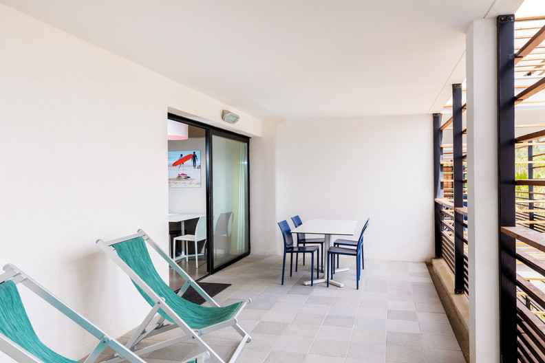 un appartement pour 5 personnes avec un séjour canapé-lit, deux chambres 2 lits simples et une terrasse ou un balcon équipé.