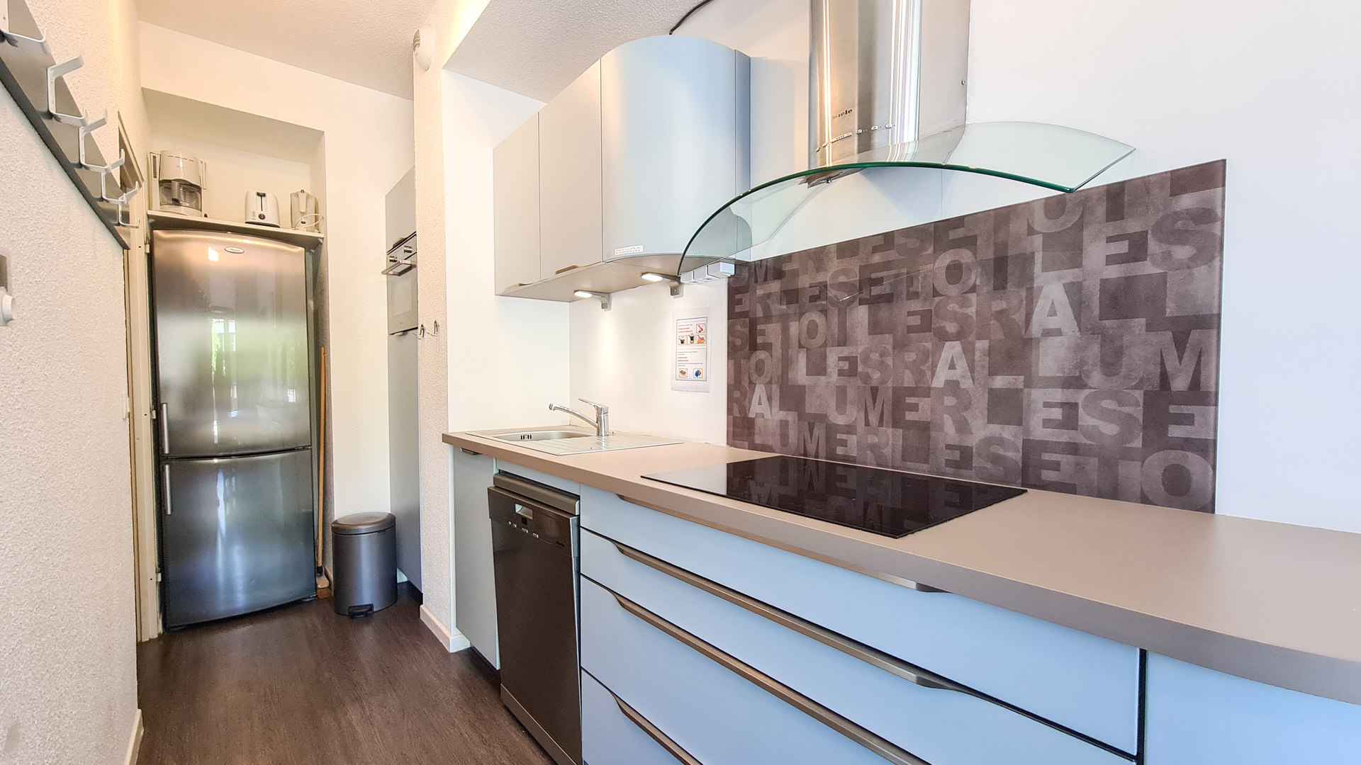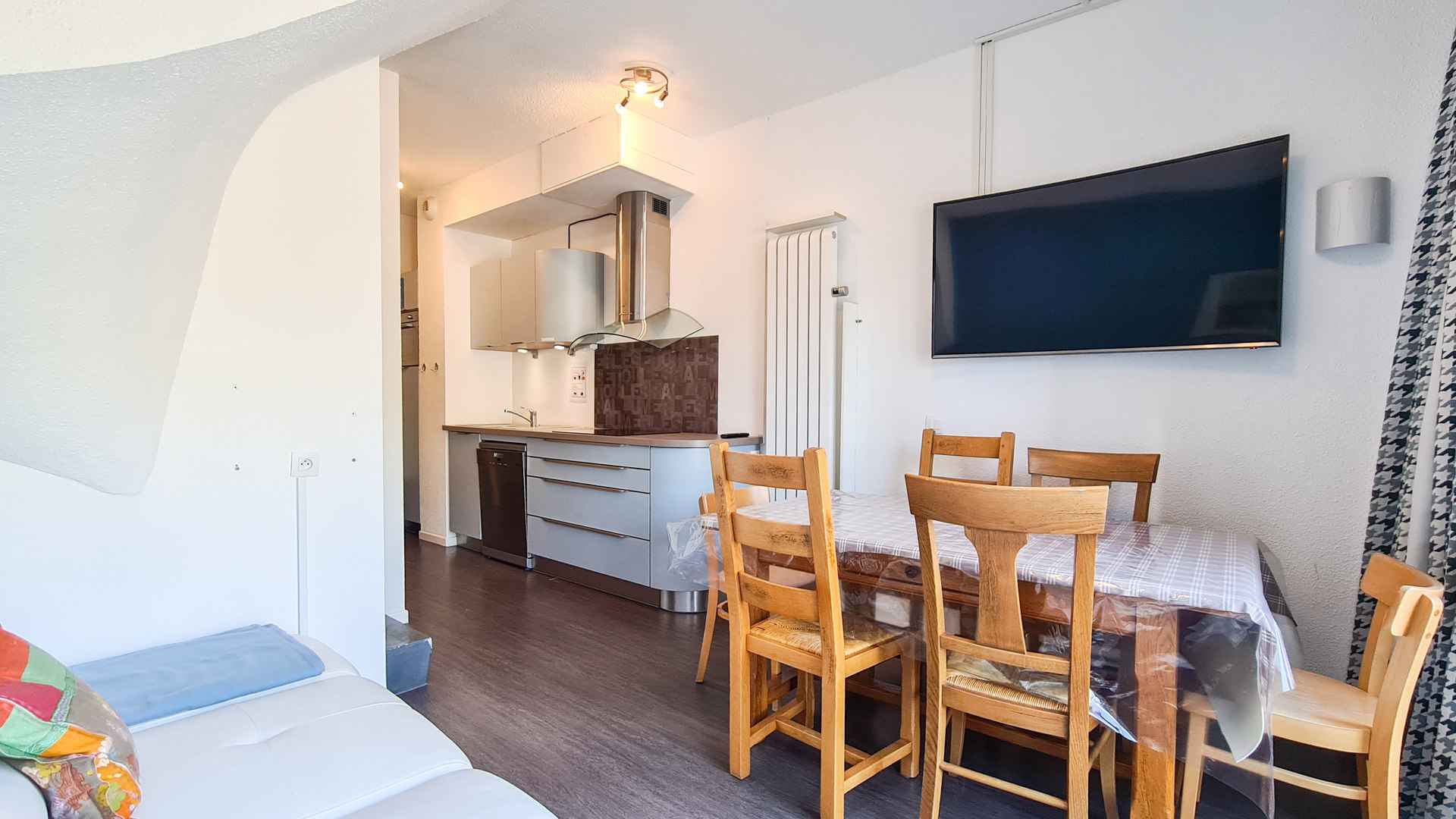 with bath - 1 shower room with toilet - Separate toilet - Open kitchen very well equipped with induction hob, fridge and freezer ,dishwasher and multifunction oven - Large Southfacing terrace with a table, 6 chairs and 2 deckchairs - Ski locker - Bedding: synthetic duvets - Non smoking apartment - Included: Free access to private indoor swimming pool, sauna and outdoor jacuzzi - possibility to book a covered parking place in the residence (please contact our agency) - Bed linen and towels not provided -Optional end-of-stay cleaning (additional charge) -Included in the summer season (for any stay of 6 nights or more): the "Flaine summer pass" including many activities