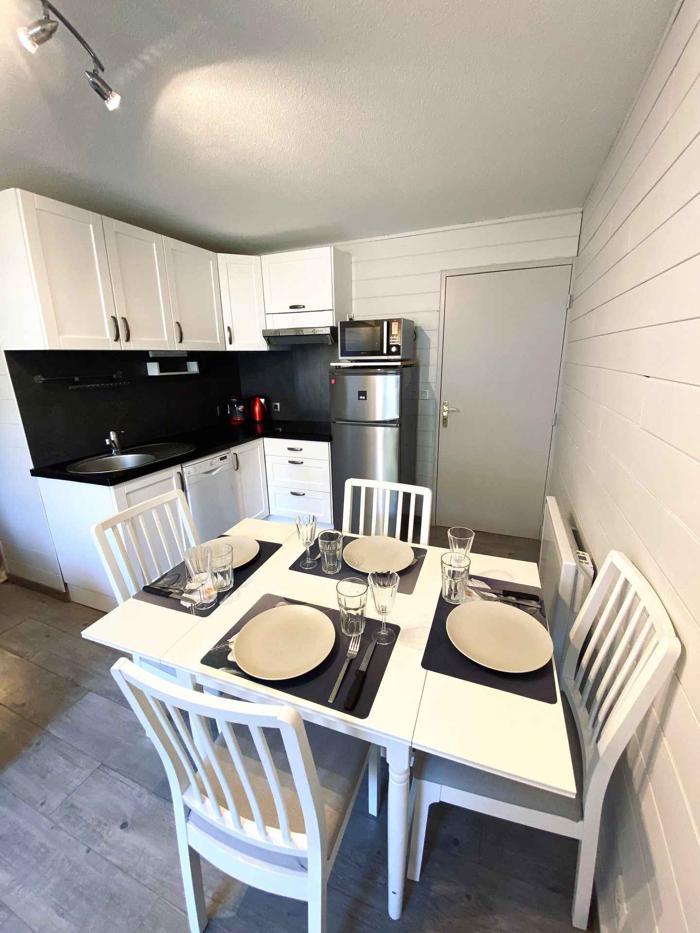 dishwasher, coffee machine, kettle. Sleeping capacity : - Bedroom 1 : 1 double bed (160x200) + TV - Bedroom 2 : 1 double bed (140x200) -Living room: 1 sofa bed (double bed : 140x190) Bathroom : 1 Bathroom with shower. Separated Toilets. Various: Washer dryer Electric roller shutter and manual shutter Ski locker. Access to the swimming pool of the building on summer (not supervised) Animals refused Bed linen, household linen, towels and end of stay cleaning are not included (to be booked at the latest on arrival and subject to availability).