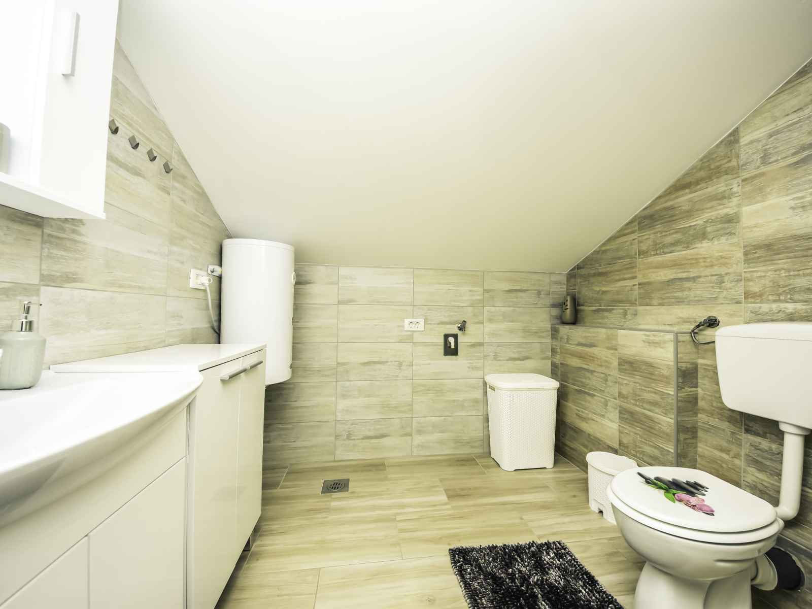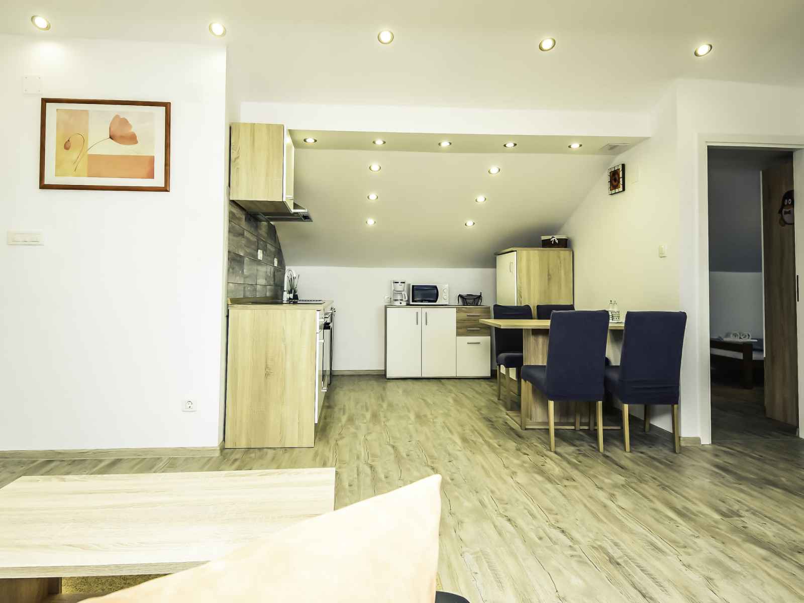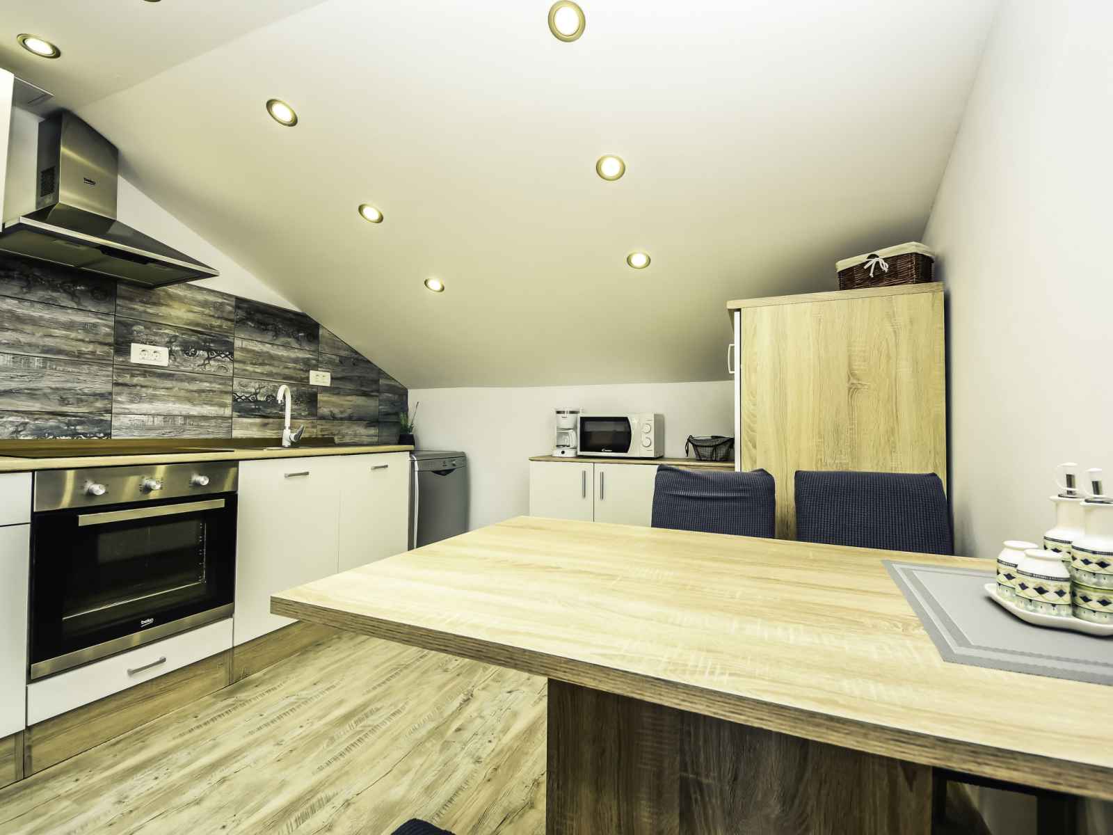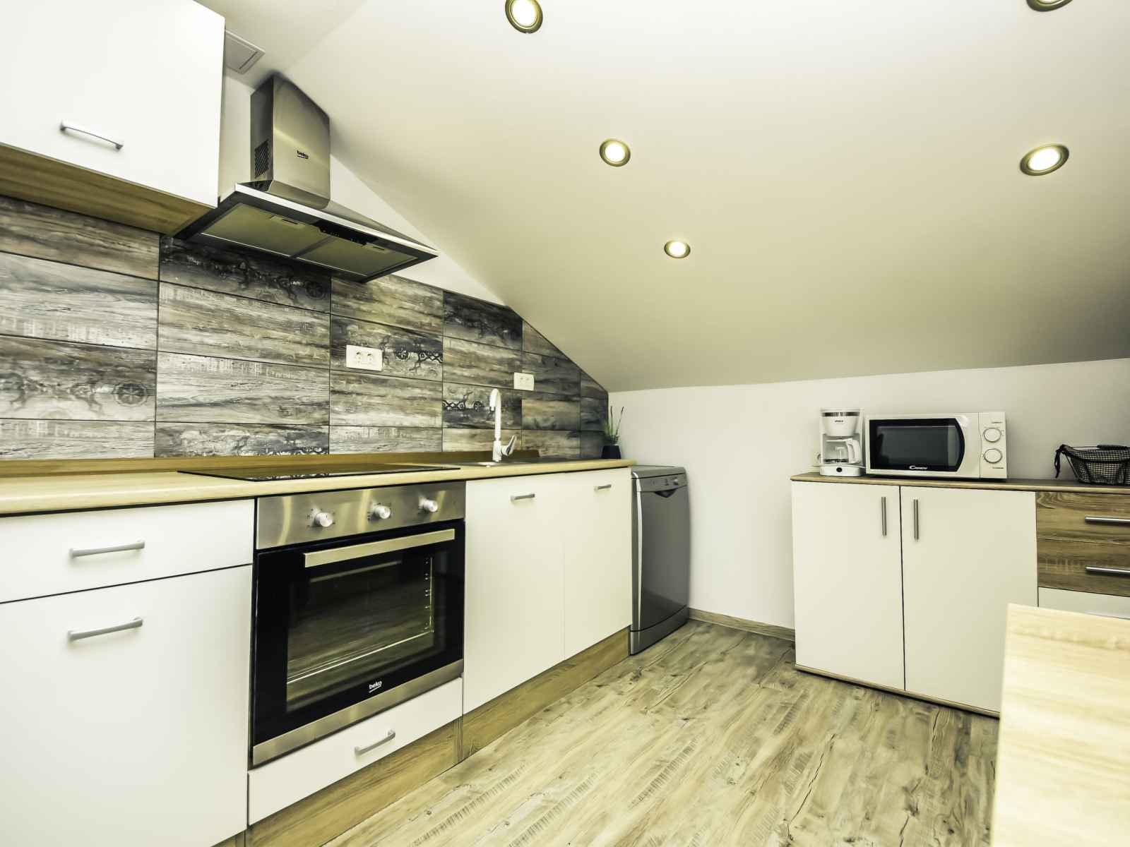 cm). 1 room with sloping ceilings, ceiling height 130 - 270 cm with 2 beds (90 cm, length 200 cm). Open kitchen (oven, dishwasher, 4 ceramic glass hob hotplates, microwave, freezer, electric coffee machine). Shower/WC. No heating option. Terrace 15 m2, roofed. Terrace furniture. Distant view of the sea. Facilities: Internet (WiFi, free).