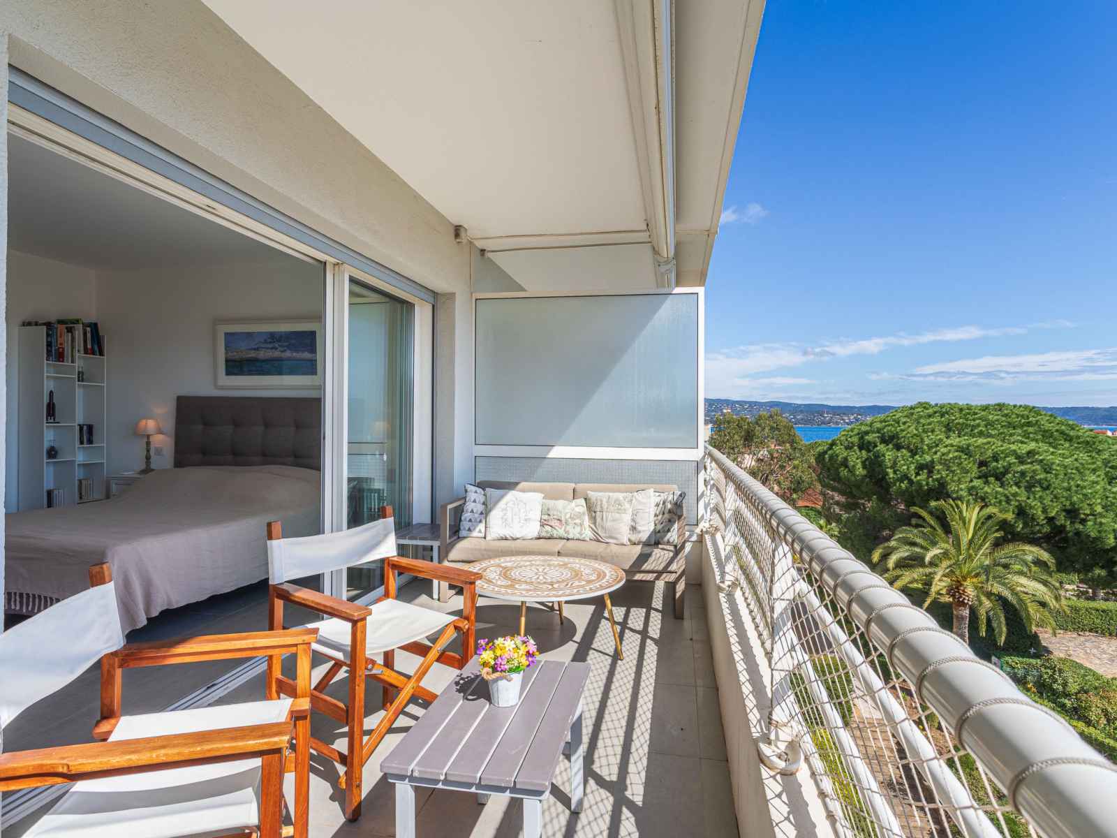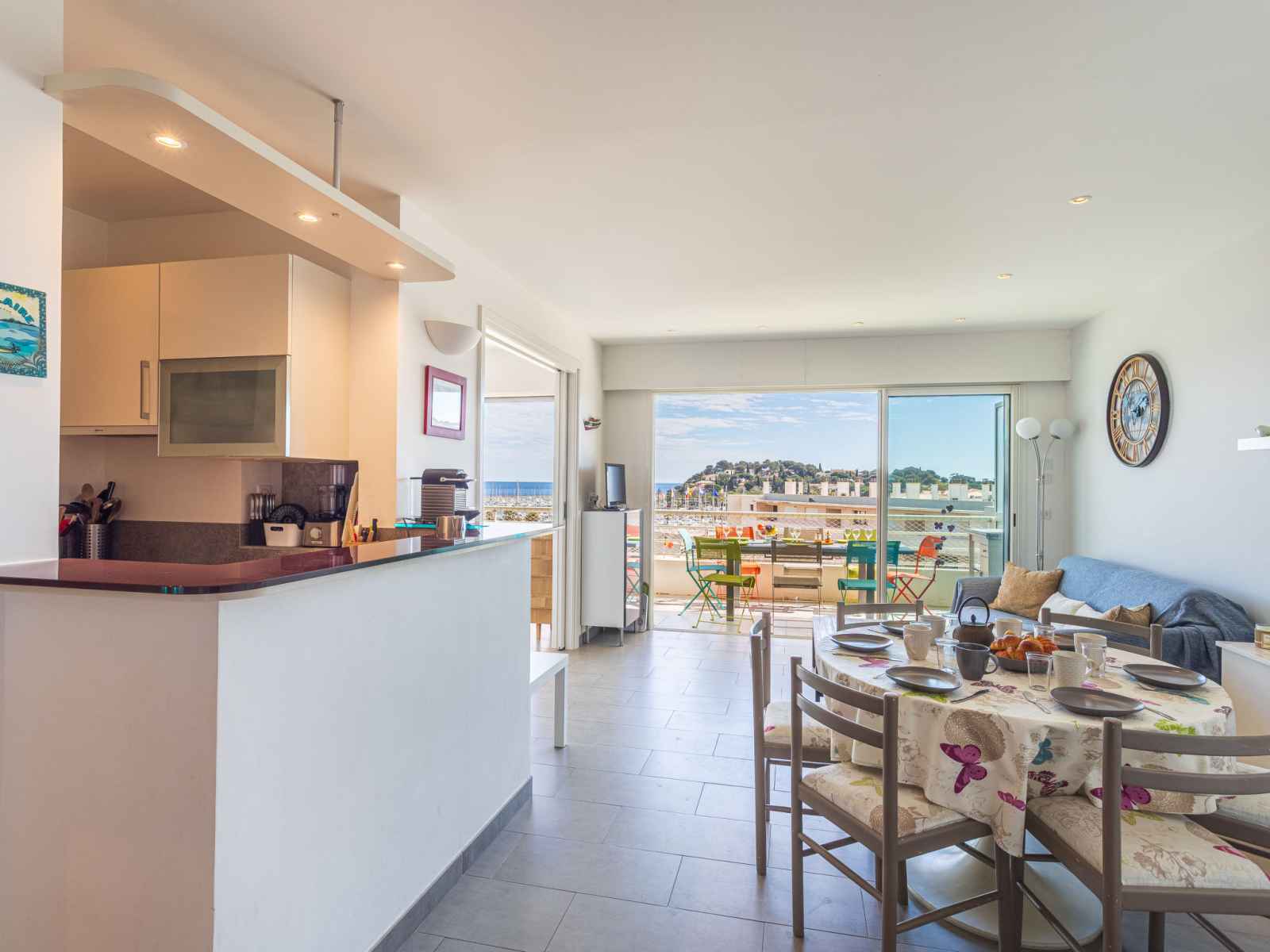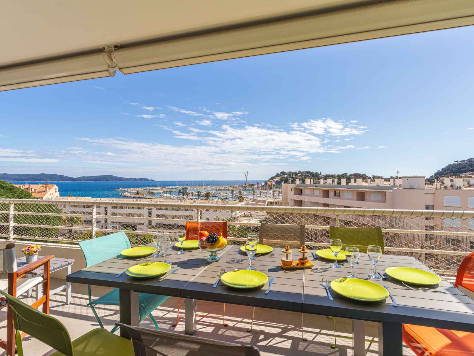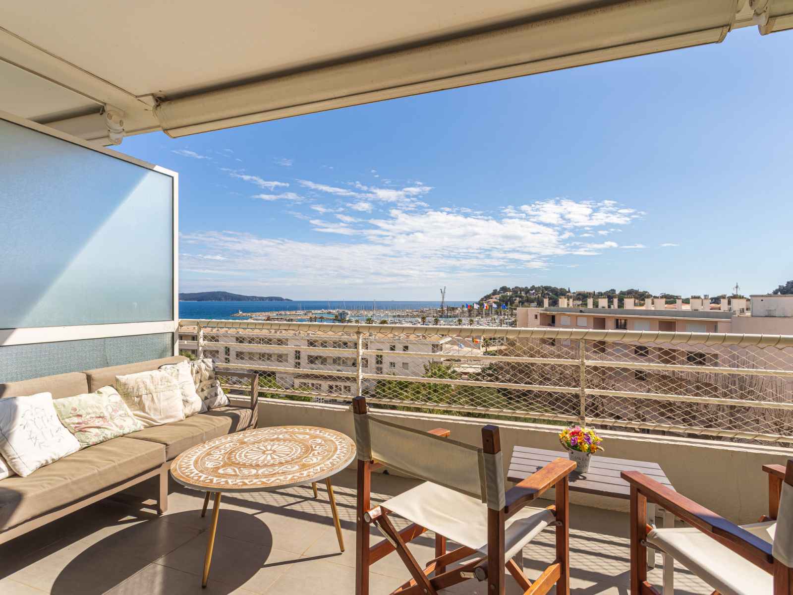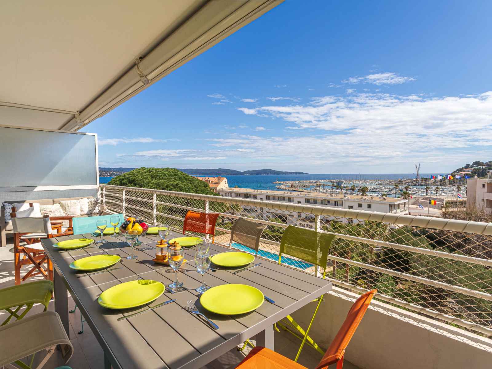 kitchen (dishwasher, 3 induction hot plates, toaster, kettle, microwave, electric coffee machine, Capsules for coffee machine (nespresso) extra). Exit to the terrace. Bathroom, sep. WC. Air-conditioning. Large terrace 17 m2, south facing position and, east facing position, small terrace 6 m2, north facing position. Terrace furniture. Very beautiful view of the sea, the swimming pool and the port. Facilities: washing machine, dryer, iron, hair dryer. Internet (WiFi, free). Parking (fenced). Please note: non-smokers only. Smoke alarm. Offer by a private individual according to Art. 155, IV of CGI.