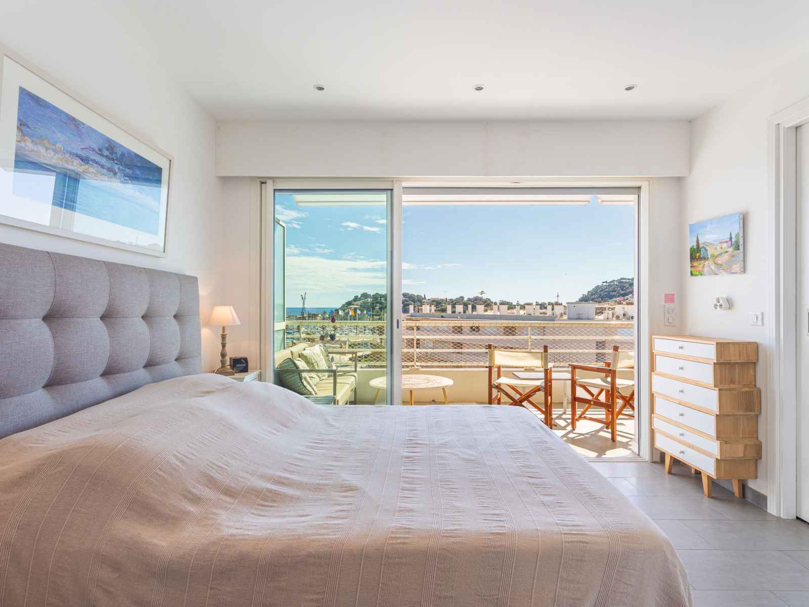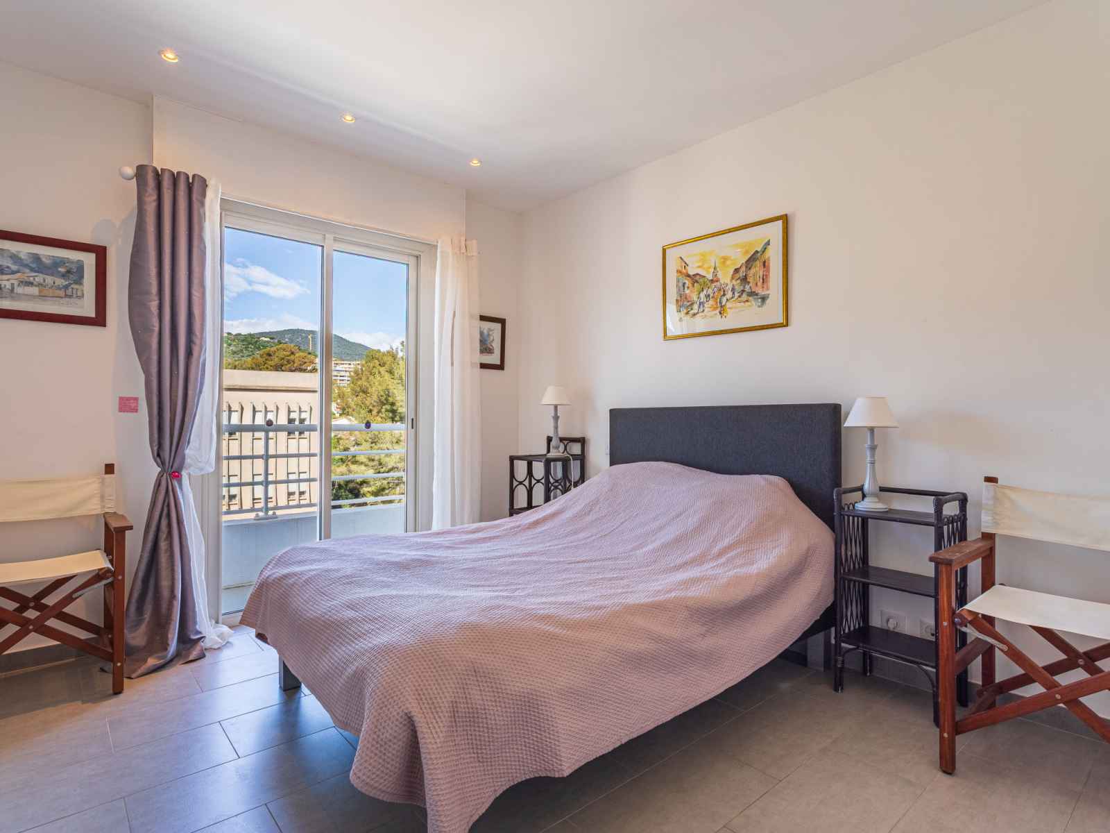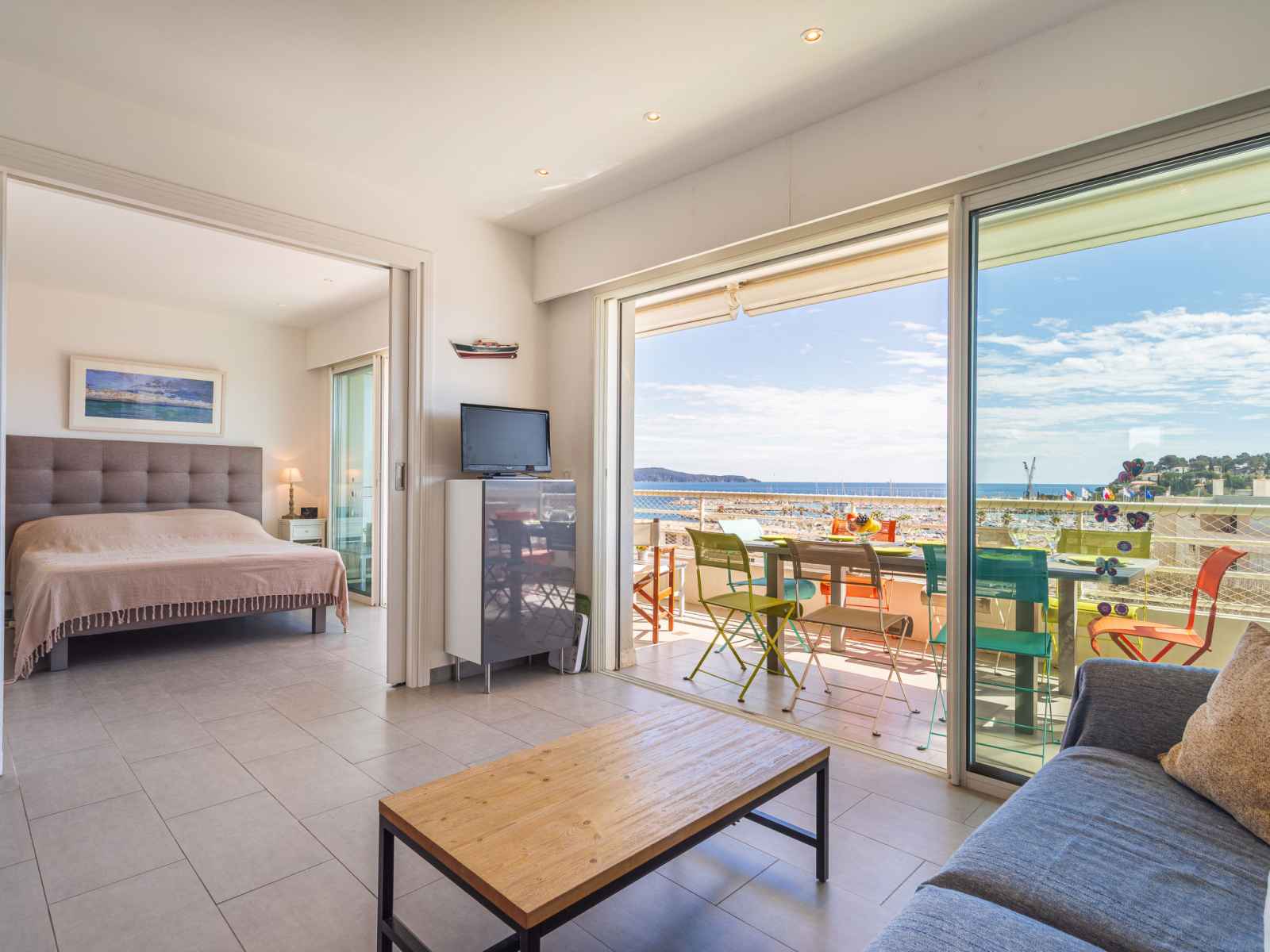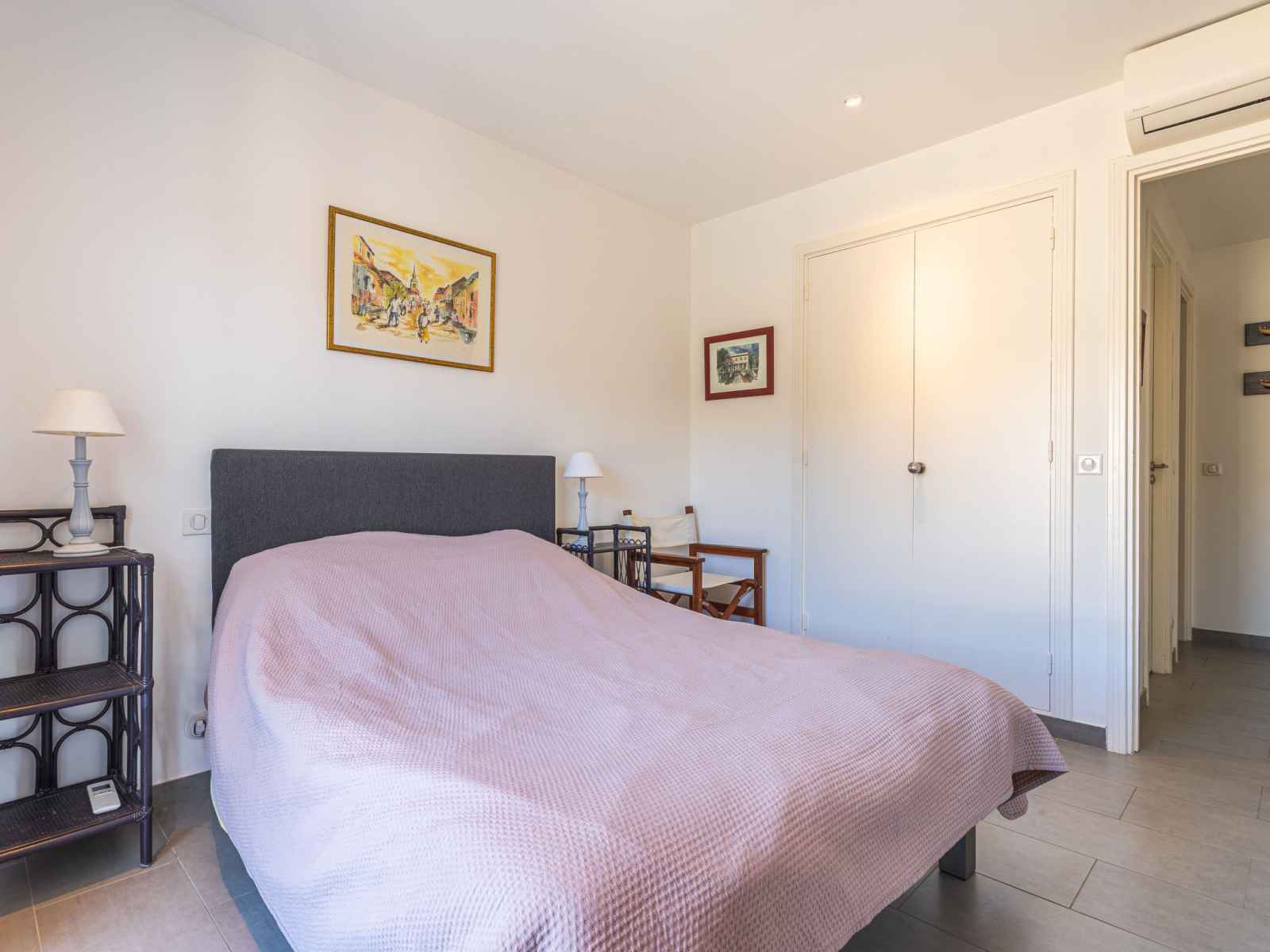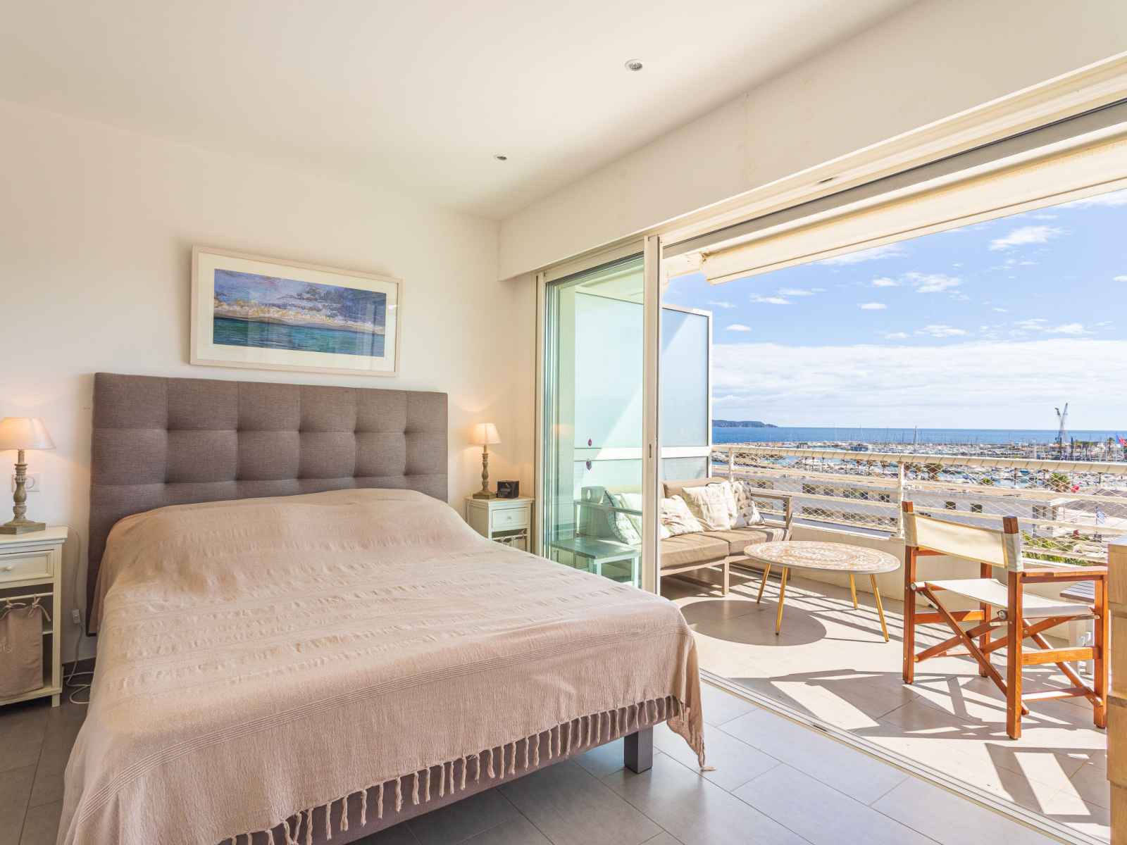 kitchen (dishwasher, 3 induction hot plates, toaster, kettle, microwave, electric coffee machine, Capsules for coffee machine (nespresso) extra). Exit to the terrace. Bathroom, sep. WC. Air-conditioning. Large terrace 17 m2, south facing position and, east facing position, small terrace 6 m2, north facing position. Terrace furniture. Very beautiful view of the sea, the swimming pool and the port. Facilities: washing machine, dryer, iron, hair dryer. Internet (WiFi, free). Parking (fenced). Please note: non-smokers only. Smoke alarm. Offer by a private individual according to Art. 155, IV of CGI.