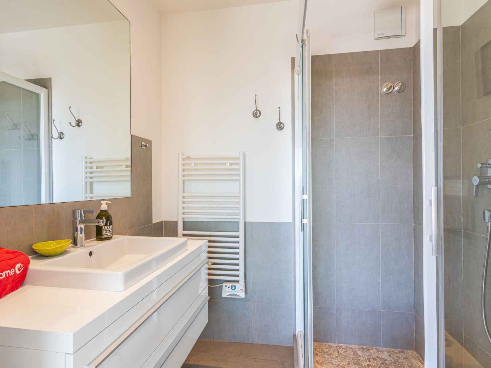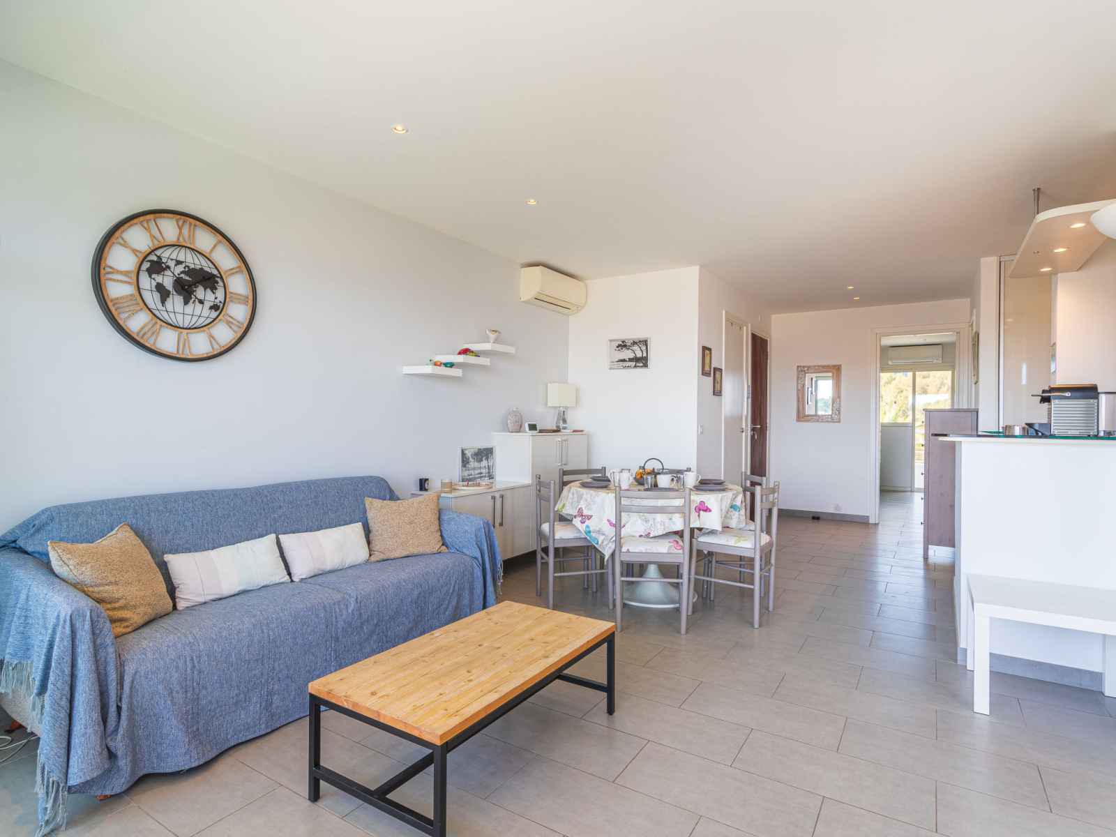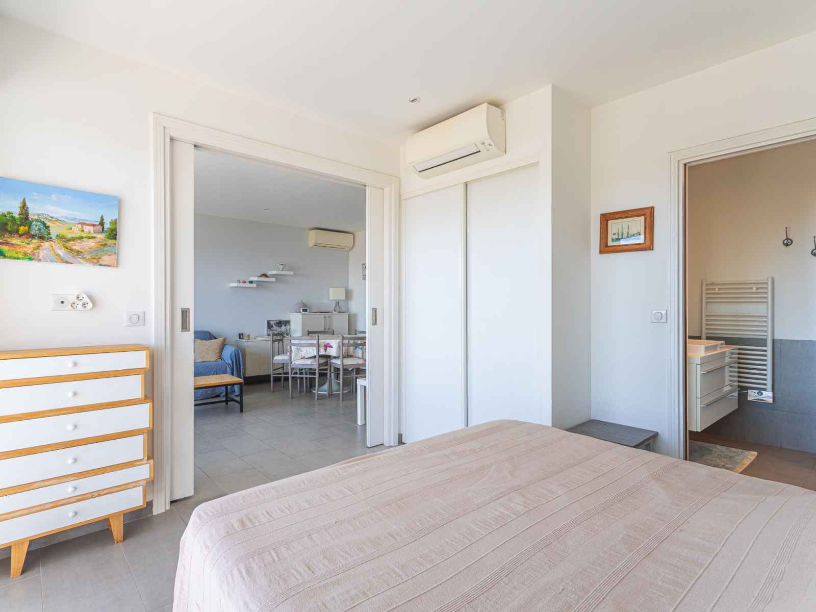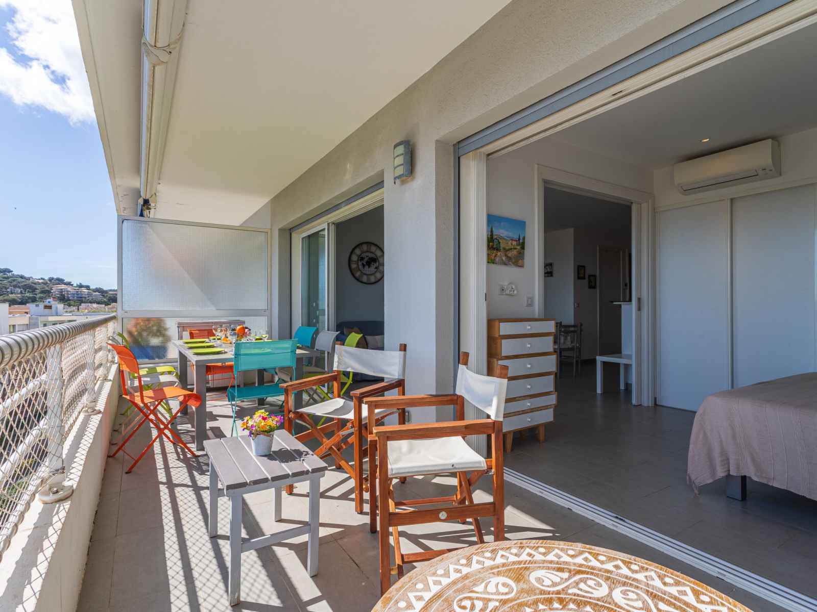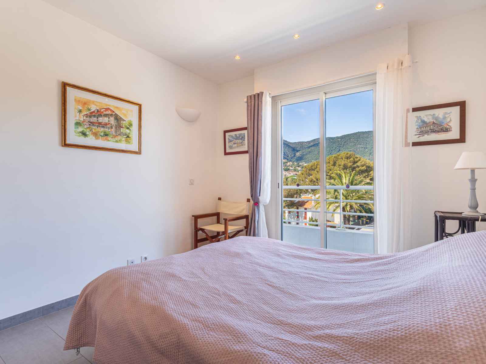 kitchen (dishwasher, 3 induction hot plates, toaster, kettle, microwave, electric coffee machine, Capsules for coffee machine (nespresso) extra). Exit to the terrace. Bathroom, sep. WC. Air-conditioning. Large terrace 17 m2, south facing position and, east facing position, small terrace 6 m2, north facing position. Terrace furniture. Very beautiful view of the sea, the swimming pool and the port. Facilities: washing machine, dryer, iron, hair dryer. Internet (WiFi, free). Parking (fenced). Please note: non-smokers only. Smoke alarm. Offer by a private individual according to Art. 155, IV of CGI.