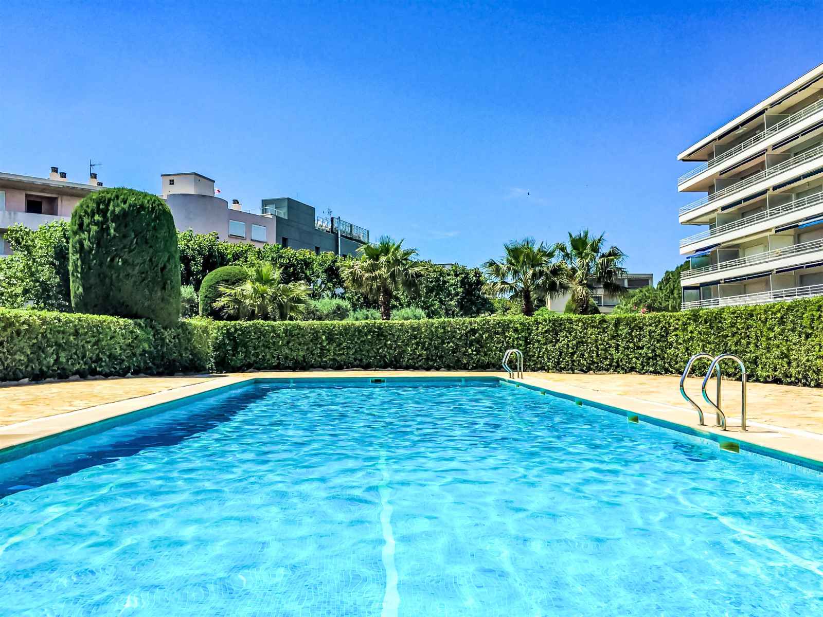 Beautiful residence "le grand pavois", 5 storeys. in the centre of cavalaire sur mer, 50 m from the sea, 50 m from the beach. for shared use: swimming pool angular (18 x 6 m, seasonal availability: 01.may. - 15.sep. and 15.sep. - 15.oct. pool opening hours: 09:00-20:00 and 09:00-19:00). in the complex: lift. parking (limited number of spaces).