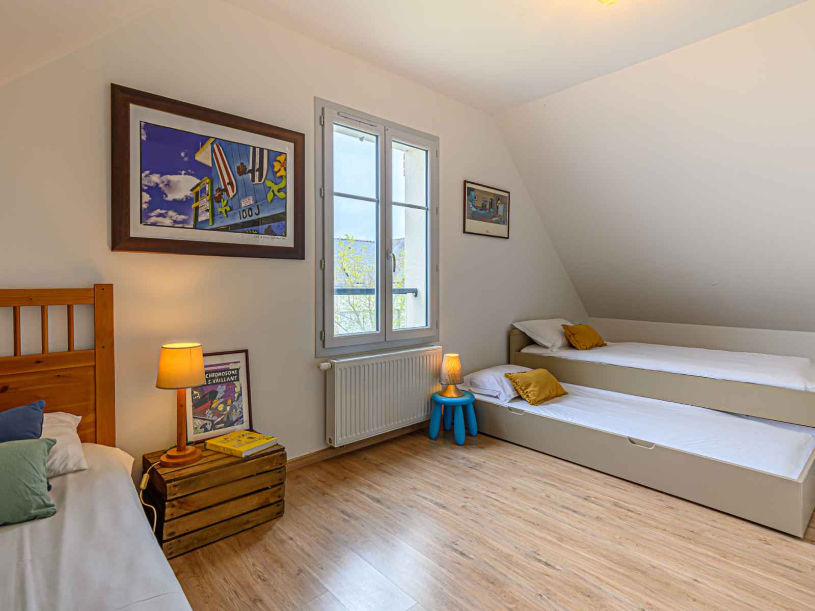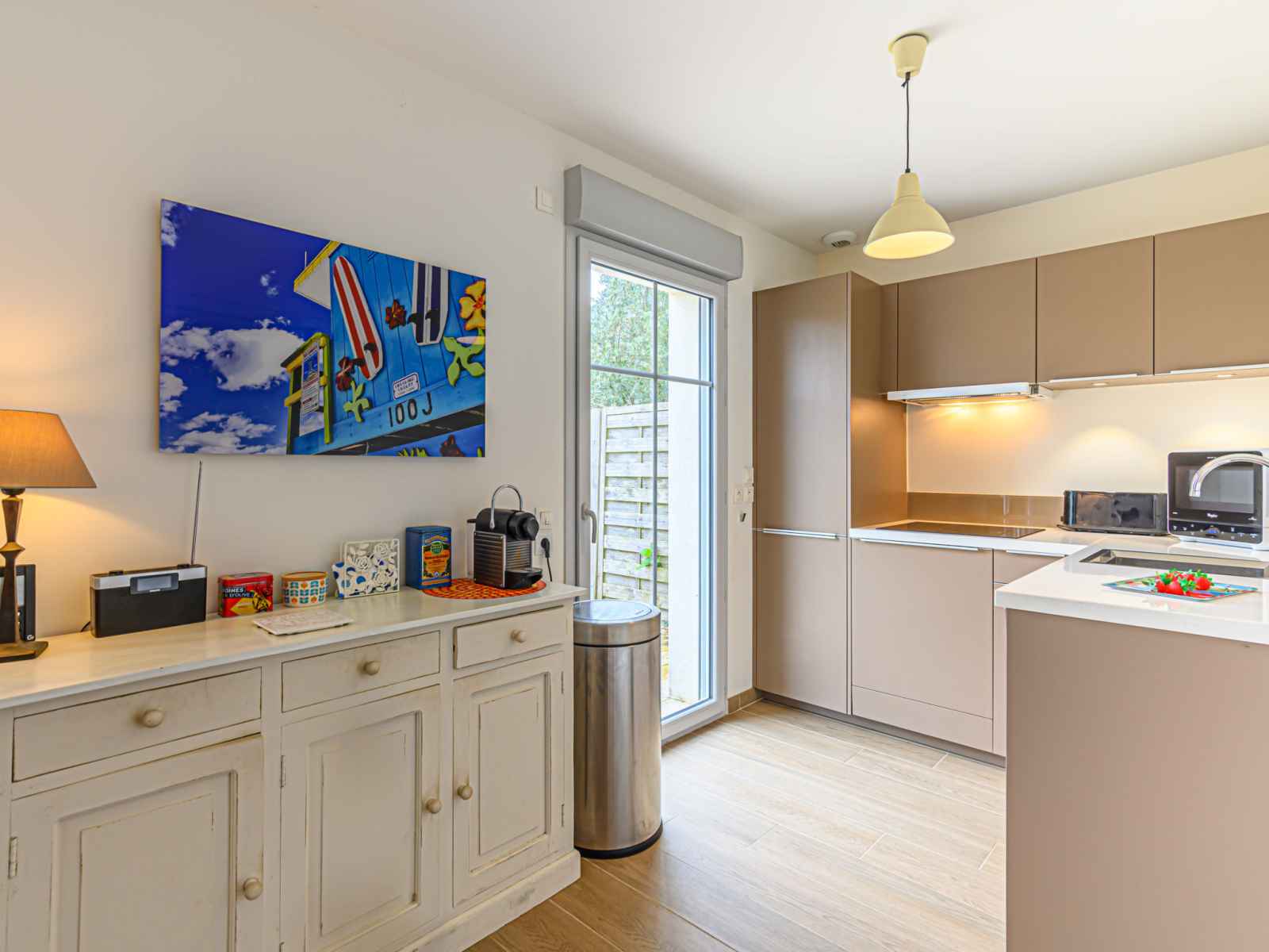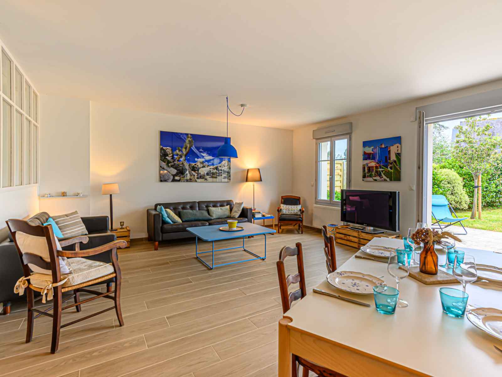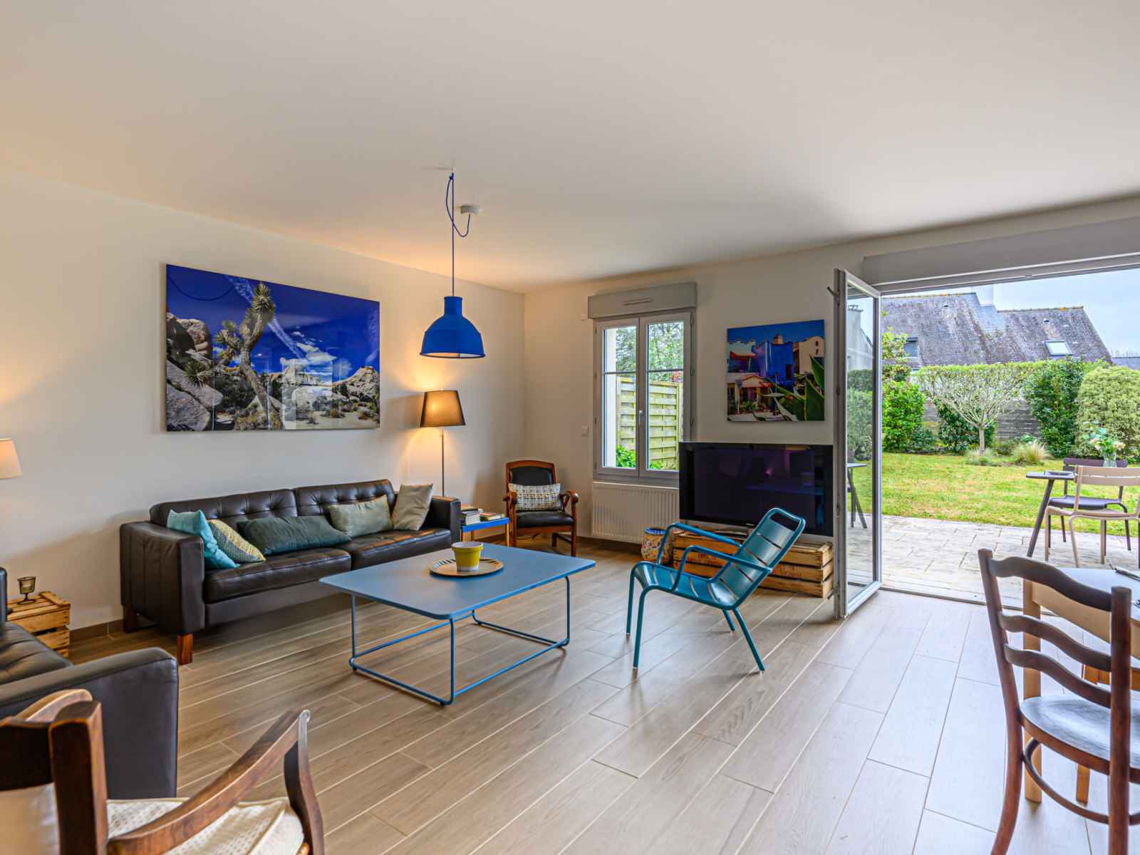 "ranguhan", 3-room terraced house 80 m2. living/dining room with tv (flat screen). exit to the terrace. office. open kitchen (dishwasher, 3 induction hot plates, toaster, microwave, electric coffee machine). shower/wc. gas heating. upper floor: 1 room with 1 french bed (1 x 160 cm, length 200 cm). 1 room with 1 bed (90 cm, length 190 cm), 1