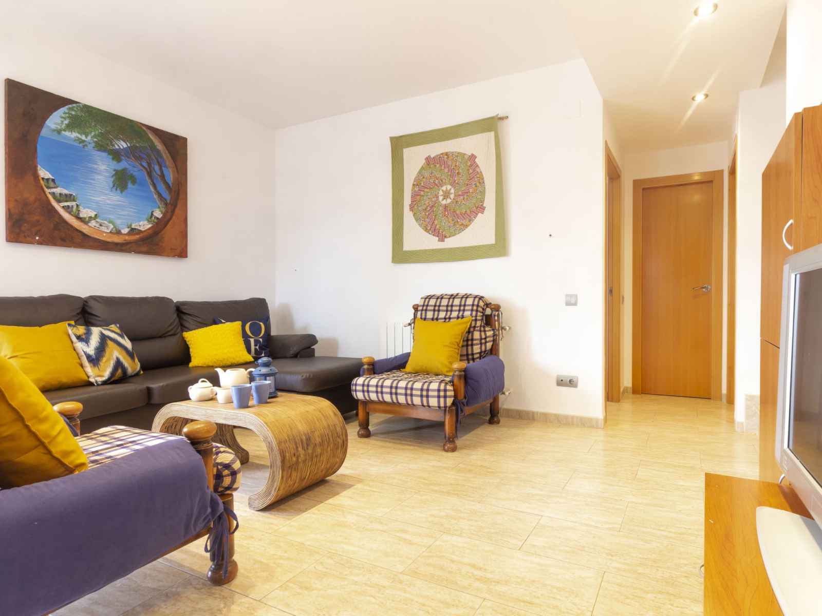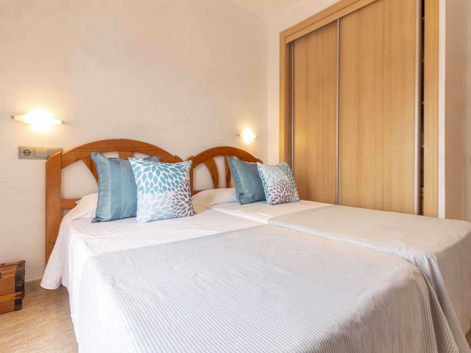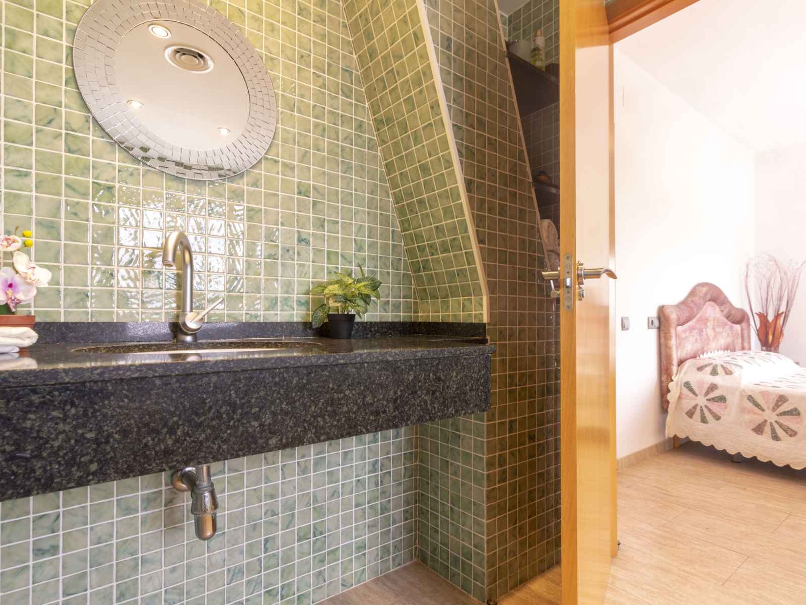 option. Upper floor: 2 large rooms with panoramic window, each room with 1 french bed (150 cm). 1 children's room with 1 bed (90 cm). 1 double bedroom with panoramic window with 2 beds. Bath/WC, shower/WC, hydro massage bath. Top floor: with sloping ceilings, 1 children's room with 3 beds (90 cm). Exit to the terrace. Patio. Terrace furniture. Distant view of the sea. Facilities: washing machine, iron. Internet (WiFi, free). Parking (fenced) at the house. Suitable for families. Maximum 1 pet/ dog allowed. HUTTE001654 // Reg. Nr.: ESFCTU00004302000092216900000000000000000HUTTE0016542