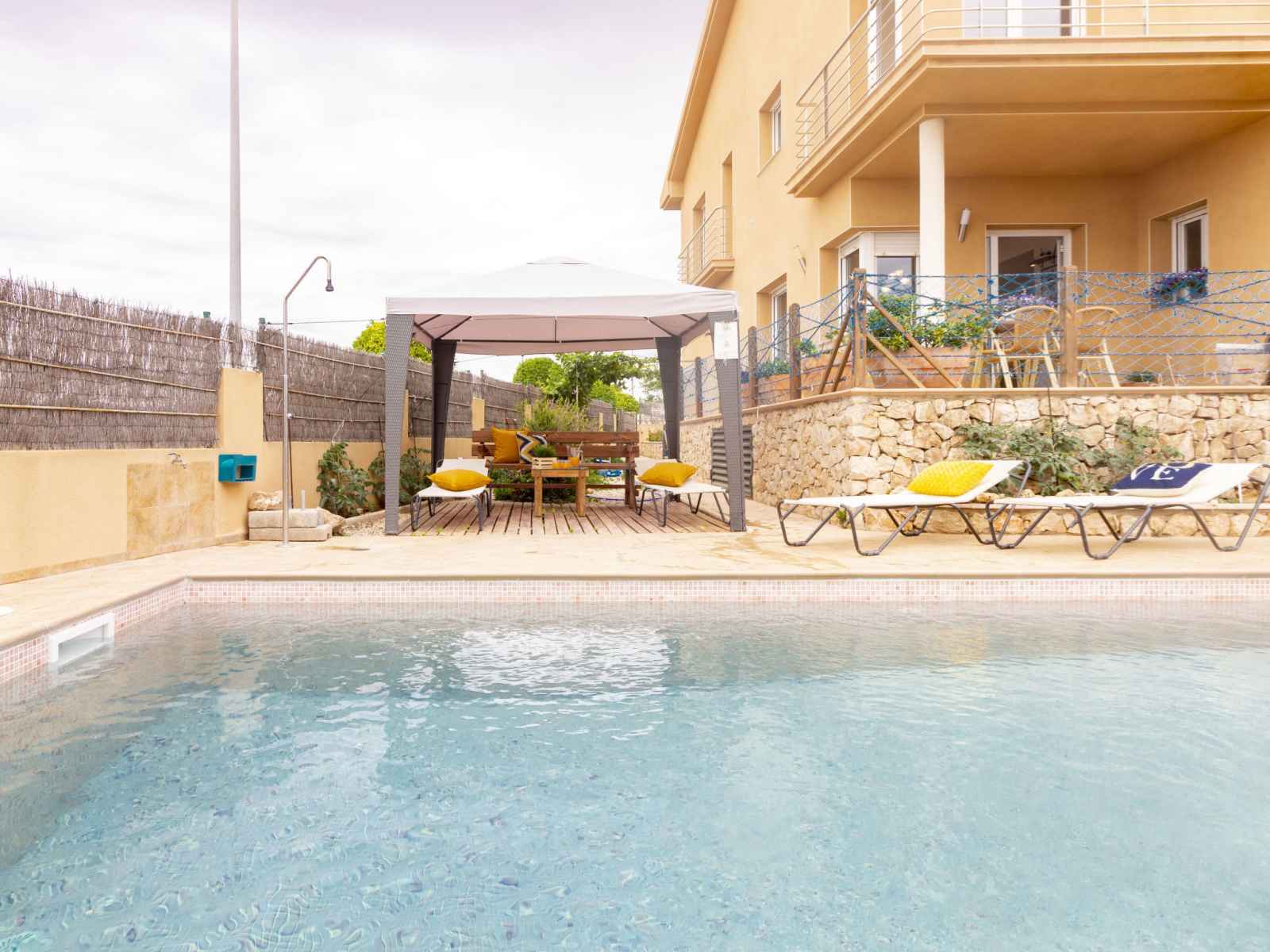 Cap roig 3 km from l'ampolla: very beautiful, comfortable terraced house "cap roig", 2 storeys. in a quiet, sunny position, 500 m from the sea, 500 m from the beach. private: garden (fenced), swimming pool angular (4 x 8 m, seasonal availability: 01.jun. - 31.oct.). outdoor shower, pergola, garden furniture. in the house: internet access, wifi.