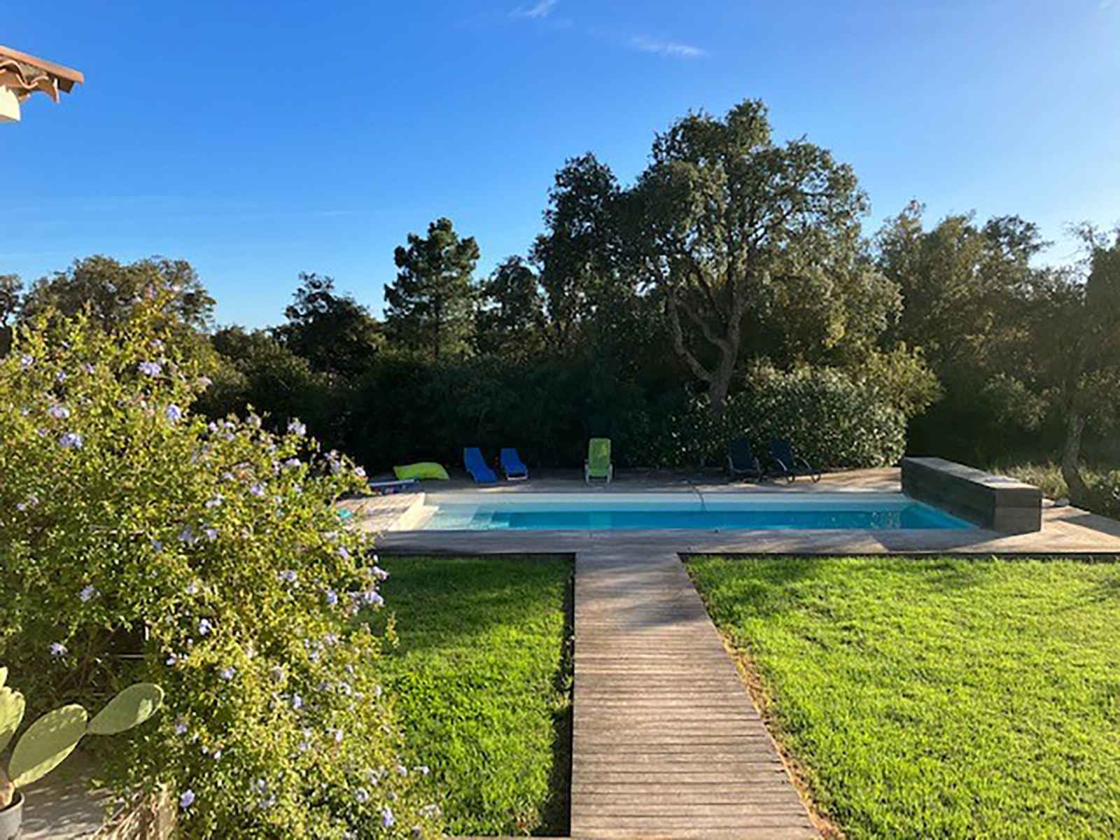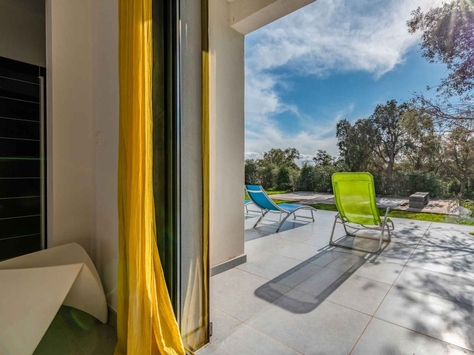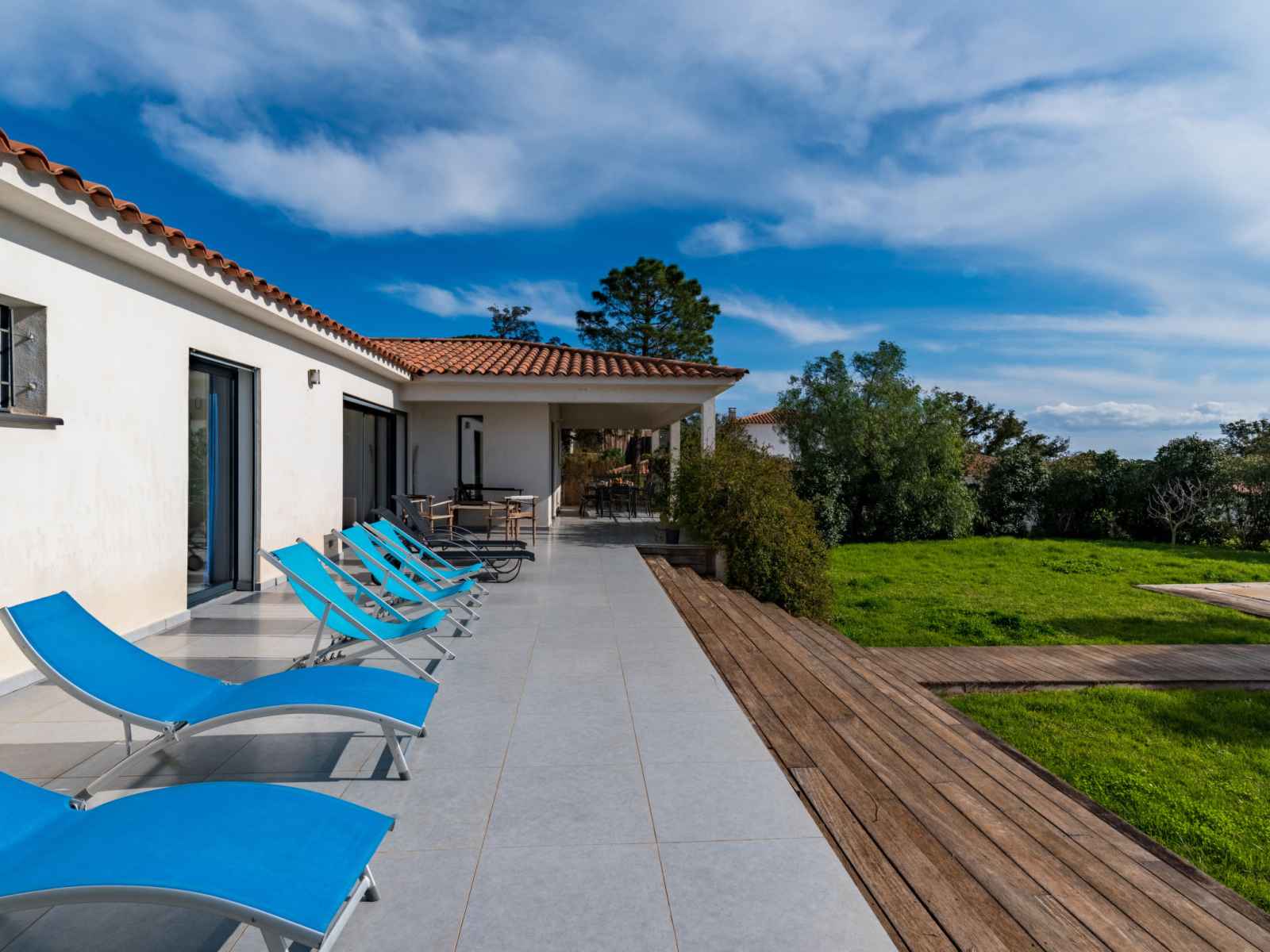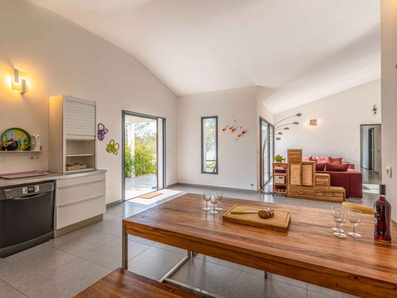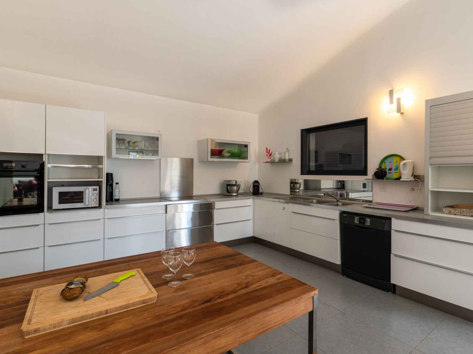 dishwasher, 4 induction hot plates, kettle, microwave, electric coffee machine) with dining table. Exit to the terrace. Electric heating, air-conditioning. Large terrace 120 m2, east facing position. Terrace furniture, barbecue, deck chairs (6). Facilities: washing machine, dryer. Internet (WiFi, free). Please note: non-smoking house. Smoke alarm. Offer by a private individual according to Art. 155, IV of CGI.
