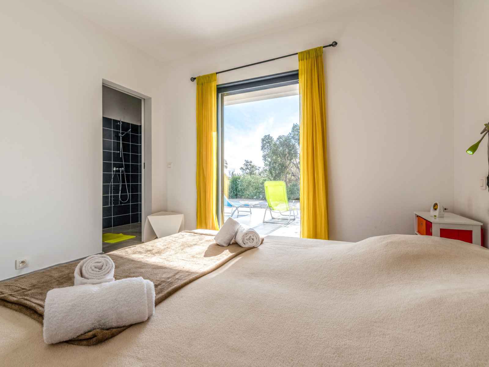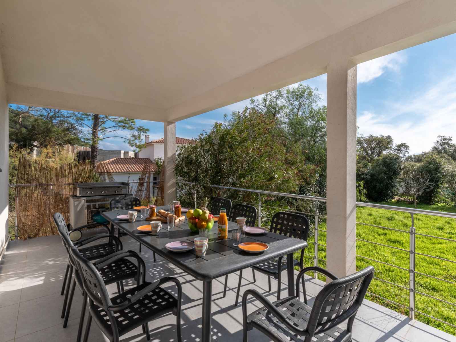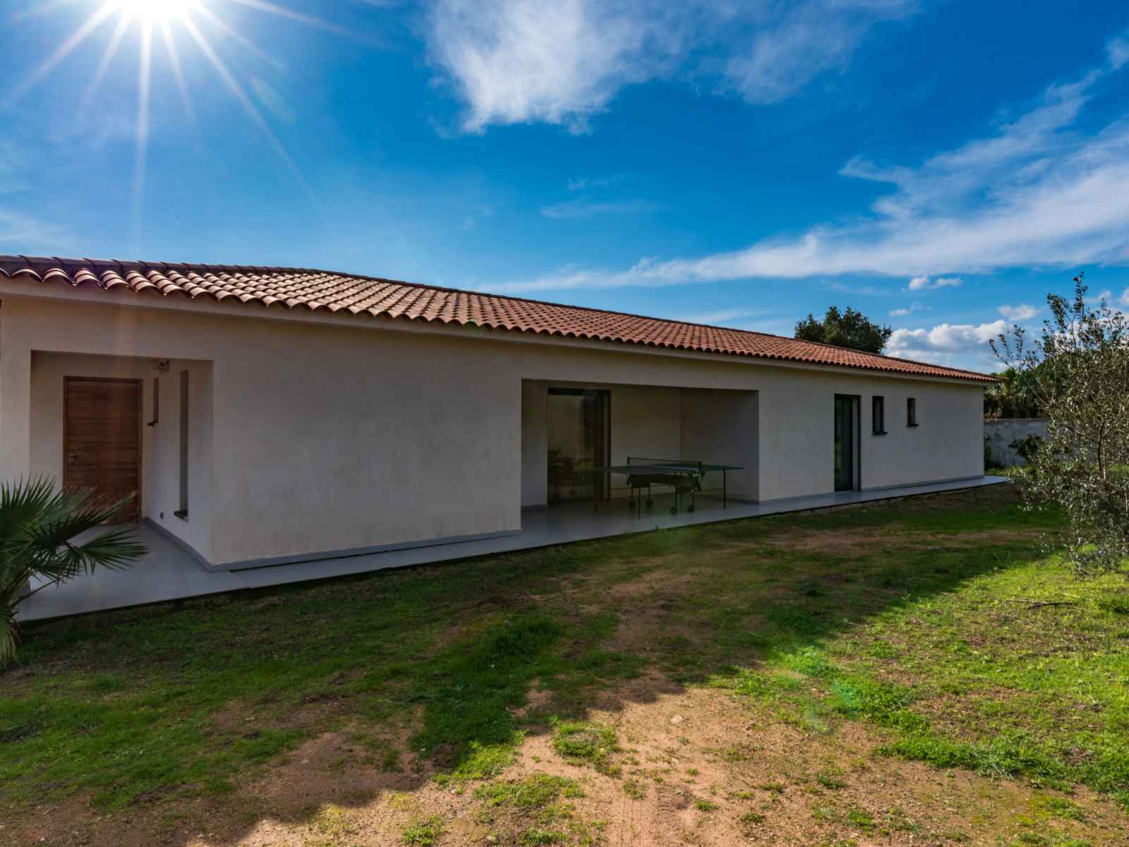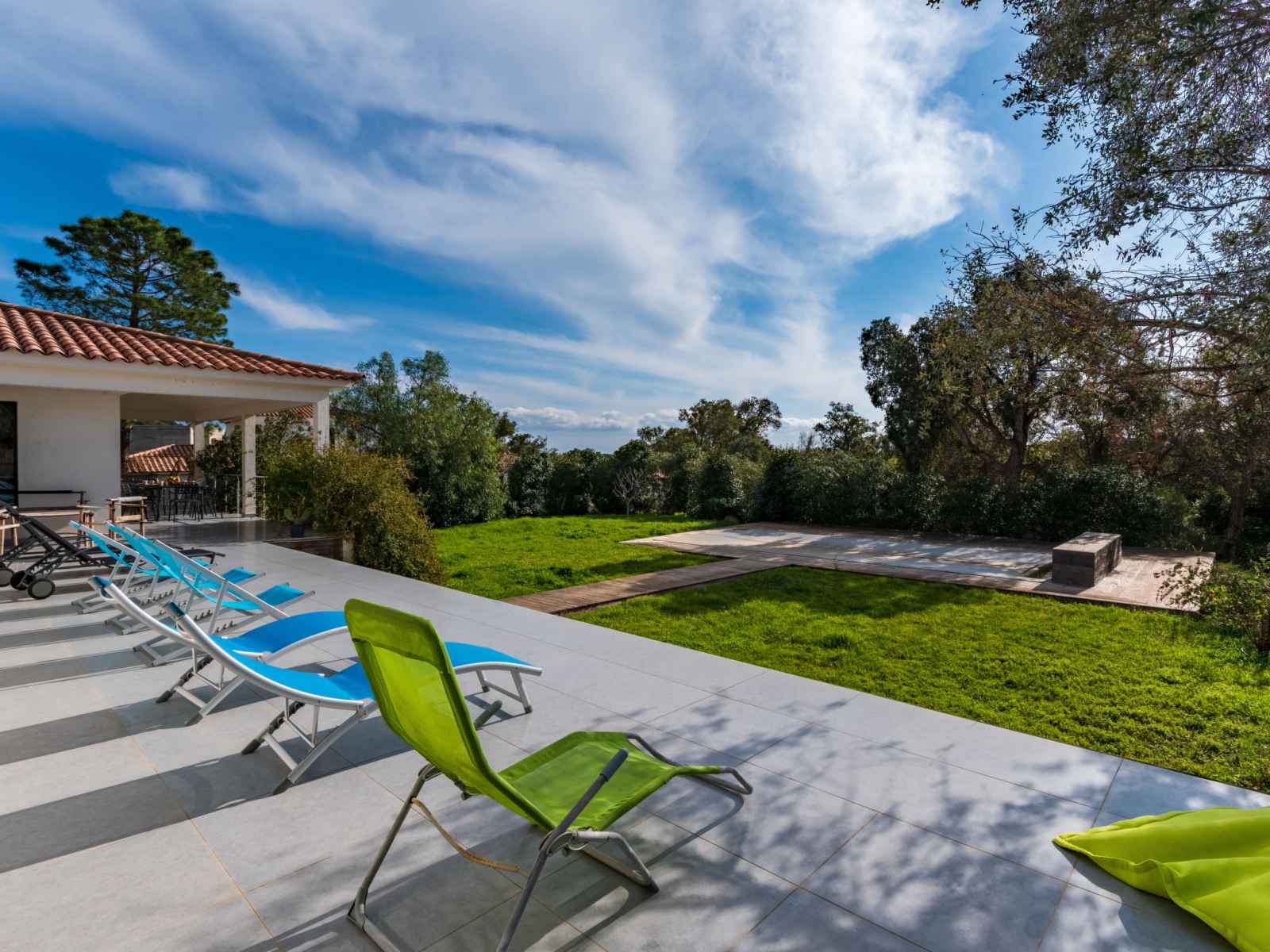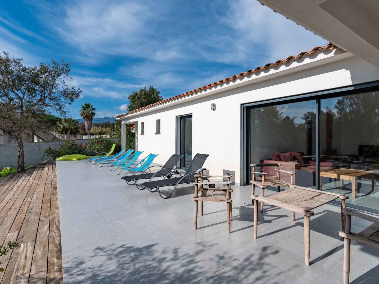 dishwasher, 4 induction hot plates, kettle, microwave, electric coffee machine) with dining table. Exit to the terrace. Electric heating, air-conditioning. Large terrace 120 m2, east facing position. Terrace furniture, barbecue, deck chairs (6). Facilities: washing machine, dryer. Internet (WiFi, free). Please note: non-smoking house. Smoke alarm. Offer by a private individual according to Art. 155, IV of CGI.