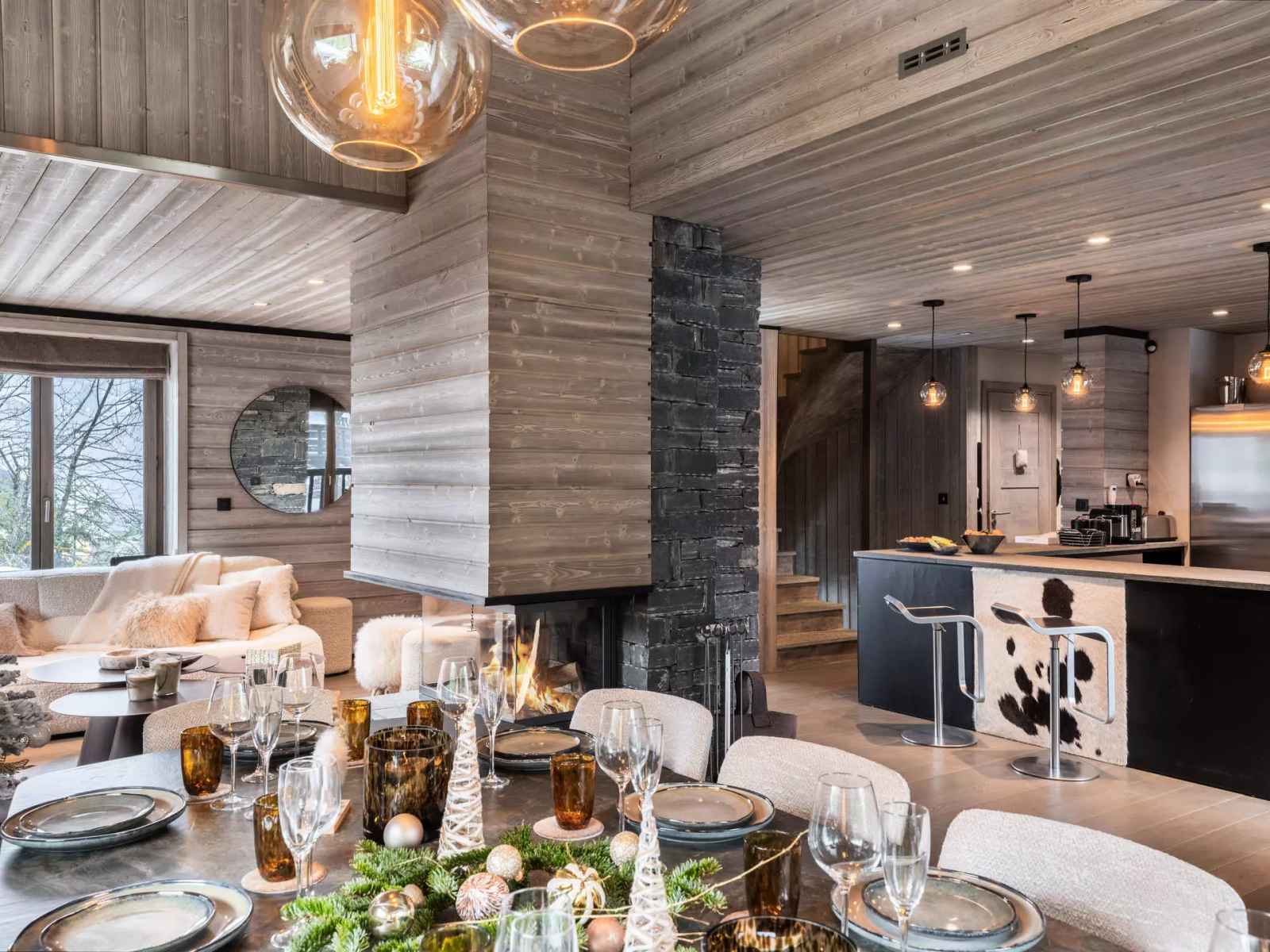 - Pièce de vie avec cuisine ouverte sur l’espace repas, salon TV, cheminée, balcon