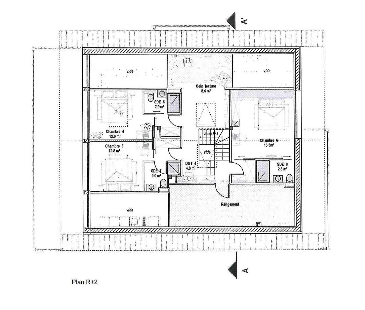 On the second floor, a reading area (8.4m²), bedroom 4 with a double bed (160cm), storage space, shower room and WC. Bedroom 5 with 1 double bed (160cm), storage space, shower room and WC. Bedroom 6 with 1 double bed (160cm), storage space, shower room and WC.
